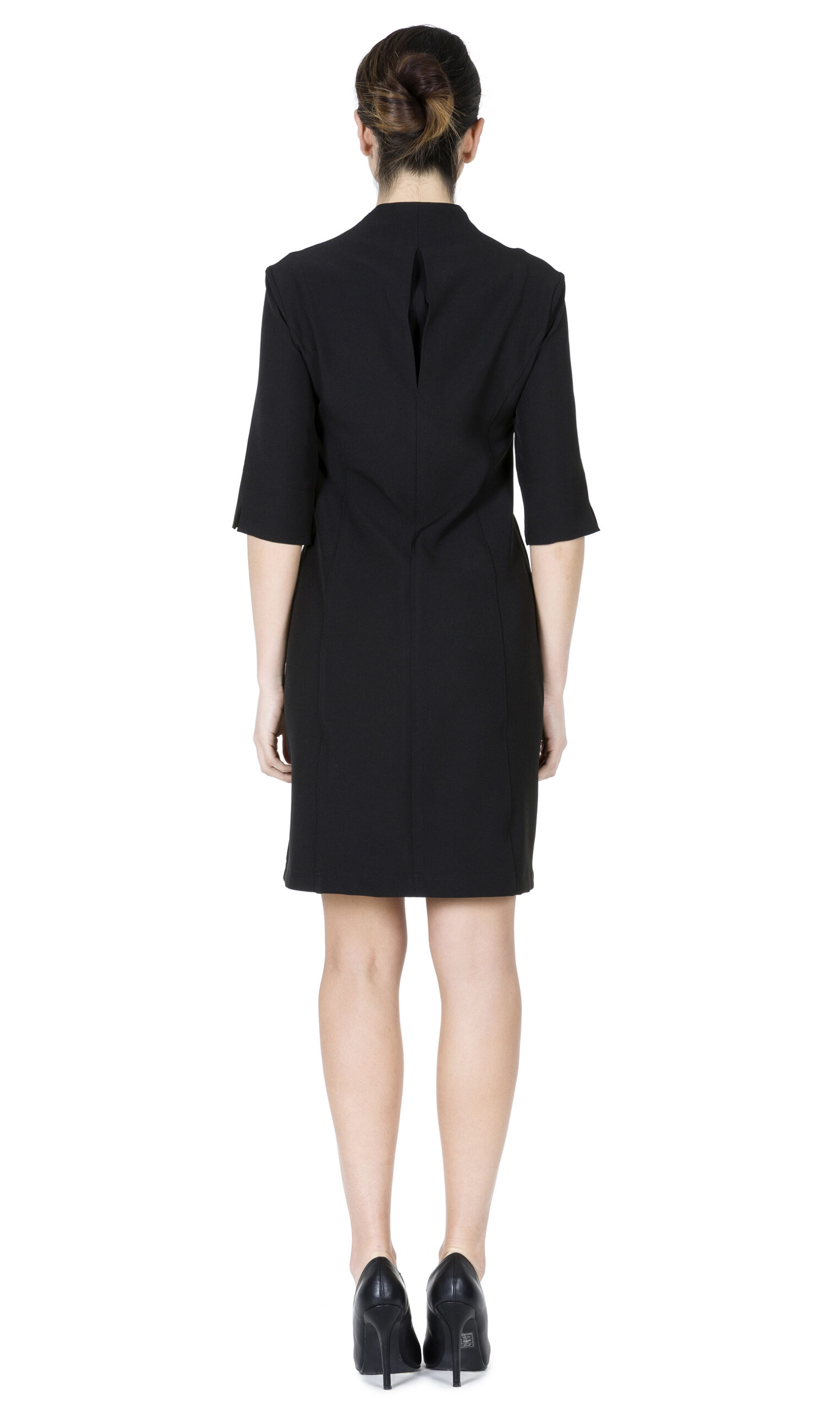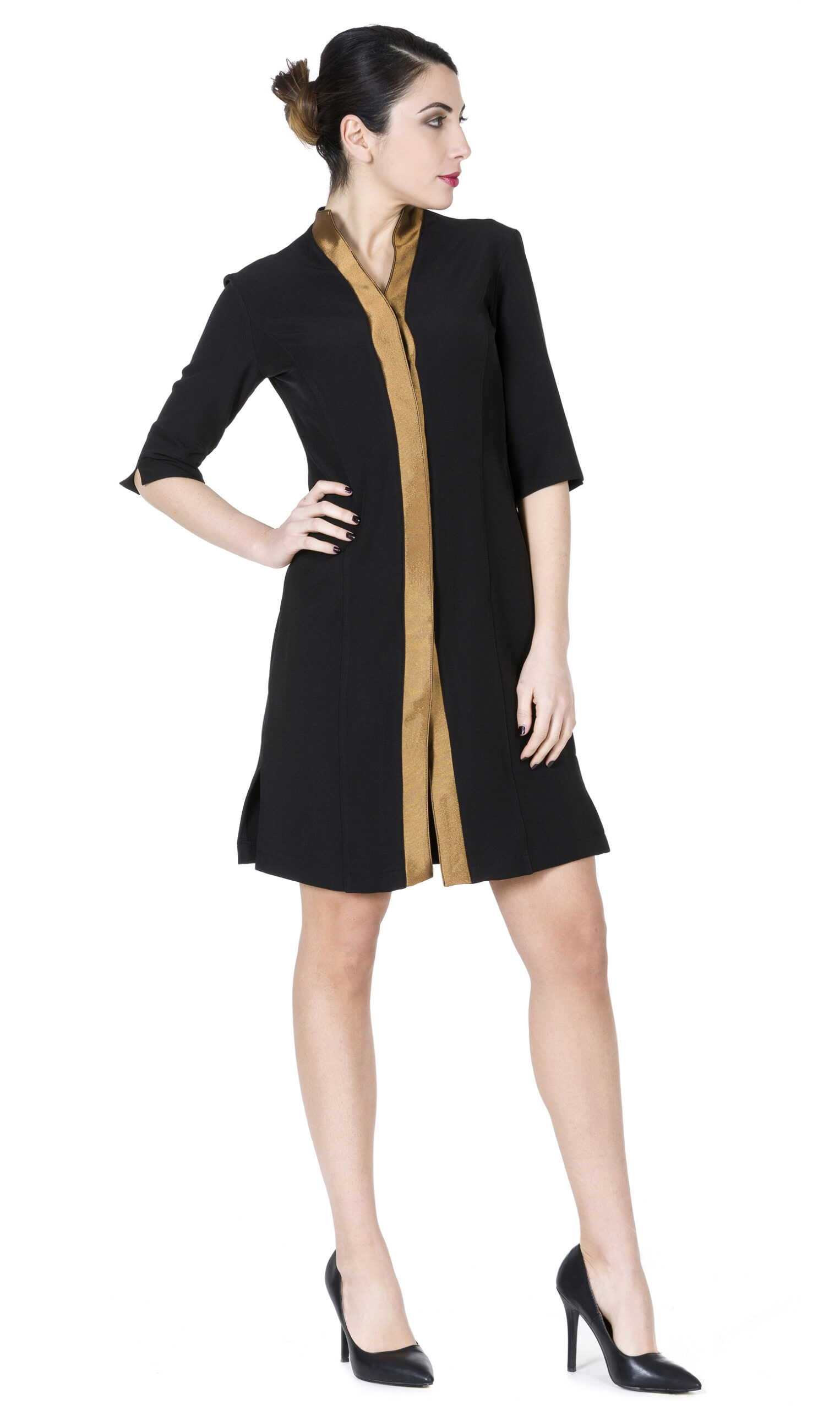 In 97% poliestere 3% elast. 220gr.mq, Manica 3/4, scollo V con bordo centrale in contrasto colore, abbottonatura frontale nascosta.
