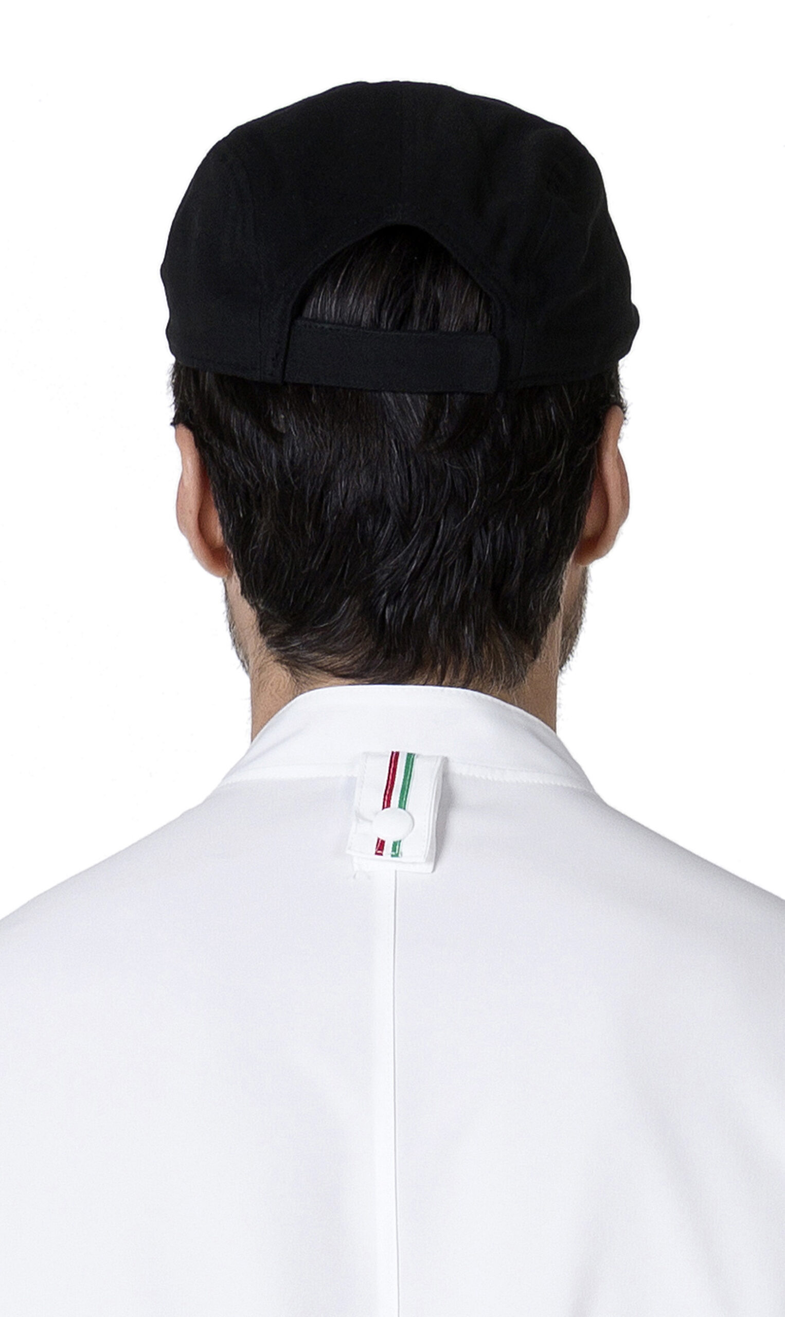 In 100% cotone con parasudore in poliestere, taglia unica e chiusura posteriore con velcro a strappo.