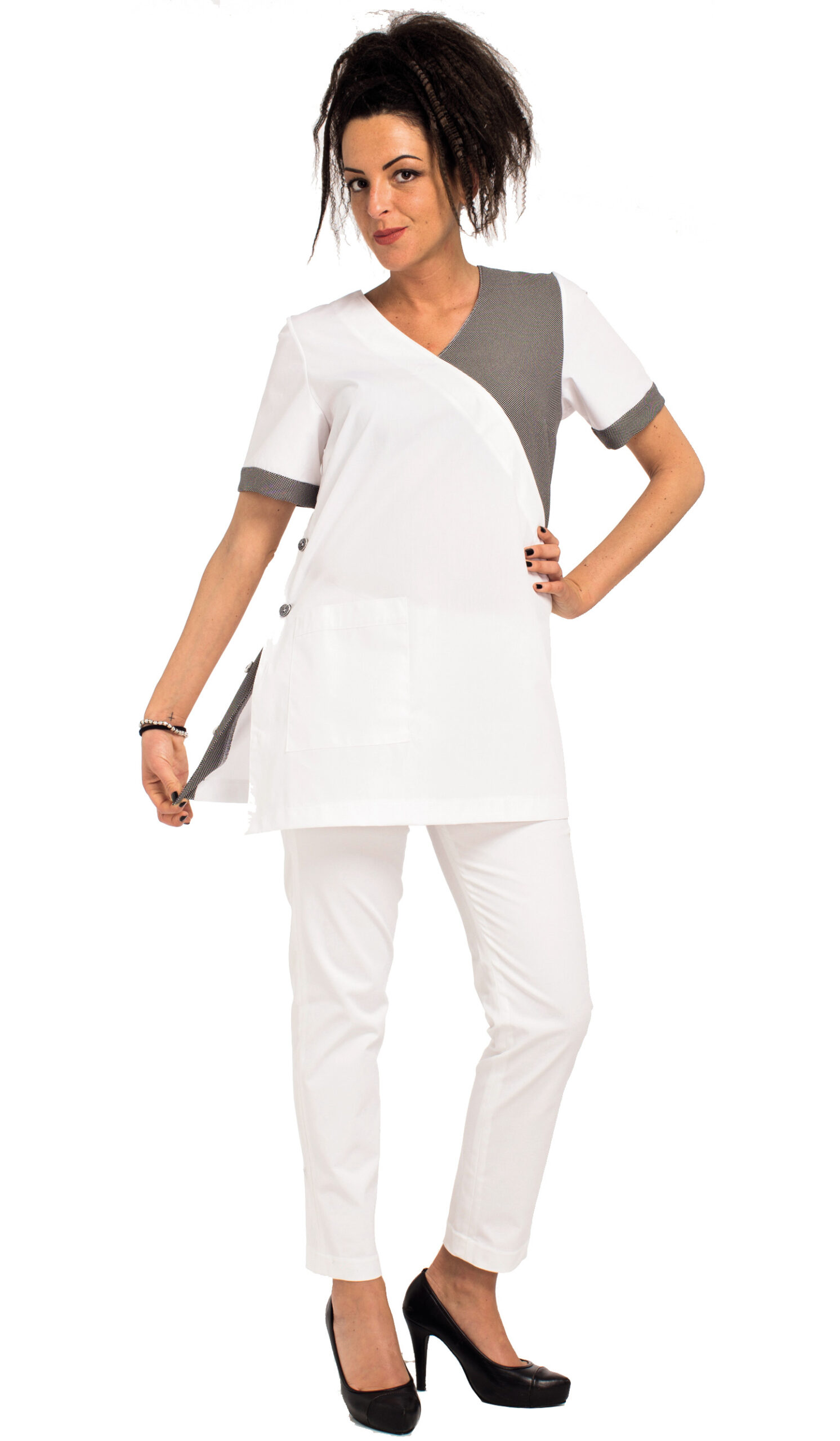 In poly/cot (65%-35%) – 140 gr/mq,) Mezza Manica con taglio incrociato, una tasca a toppa lato destro, chiusura nascosta lato dx 4 bottoni, inserto spalla sinistra e bordo maniche in contrasto