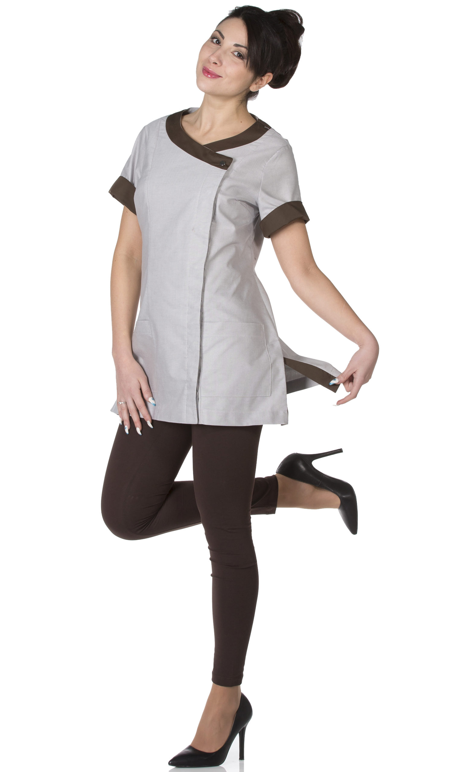 In 75%CO-25%PL – 140 gr/mq., casacca incrociata abbottonatura nascosta con automatici, due tasche a toppa, bordo maniche, collo e spacchi laterali in contrasto