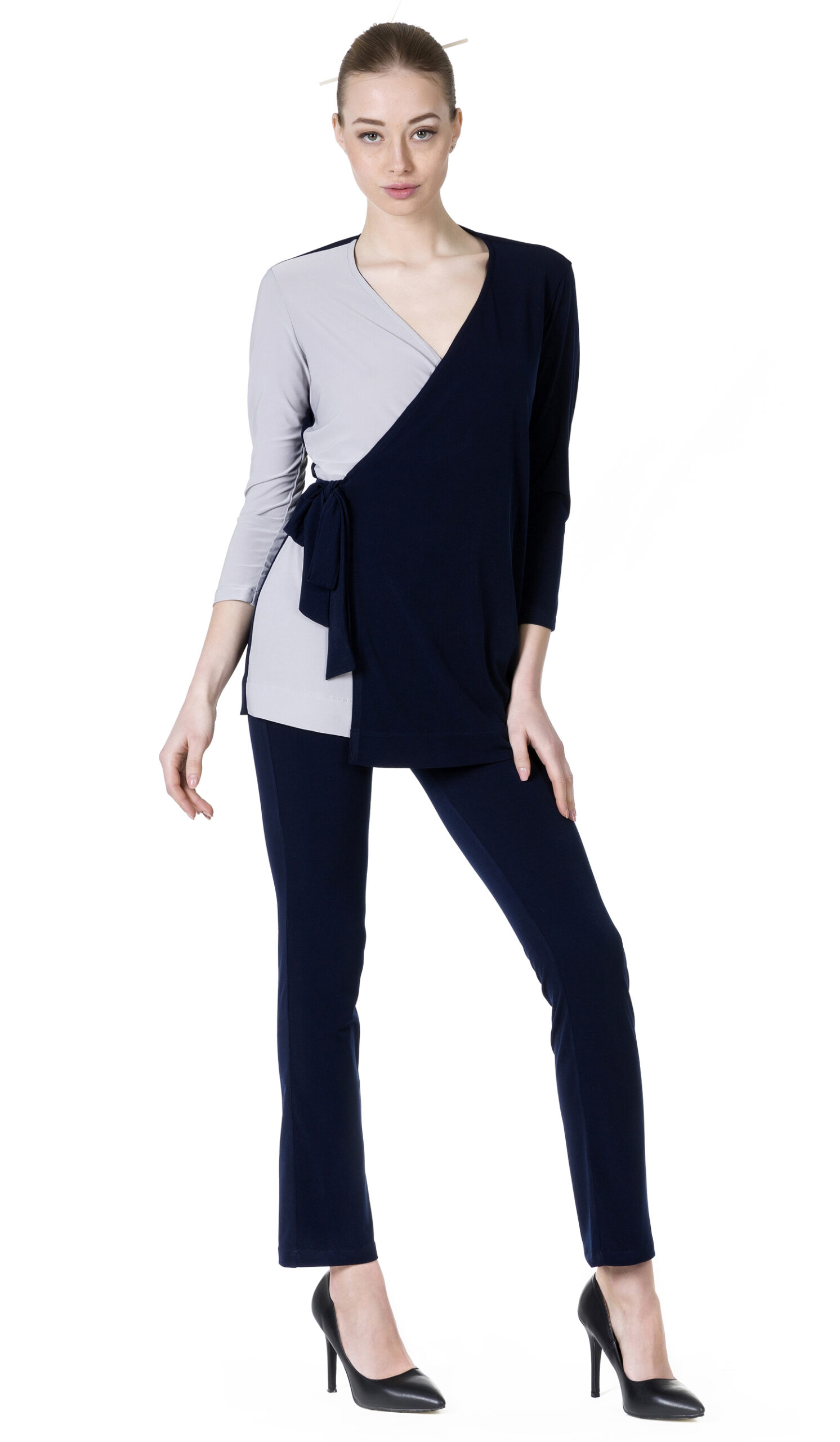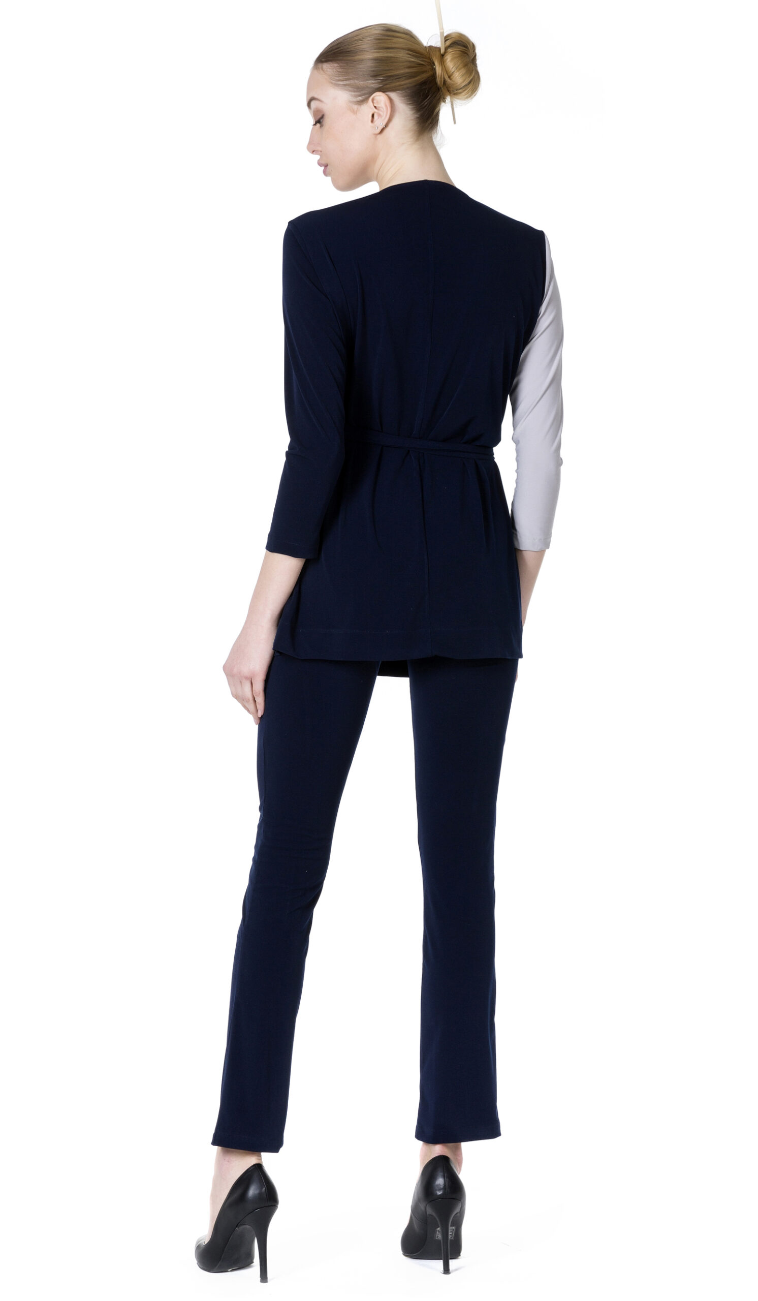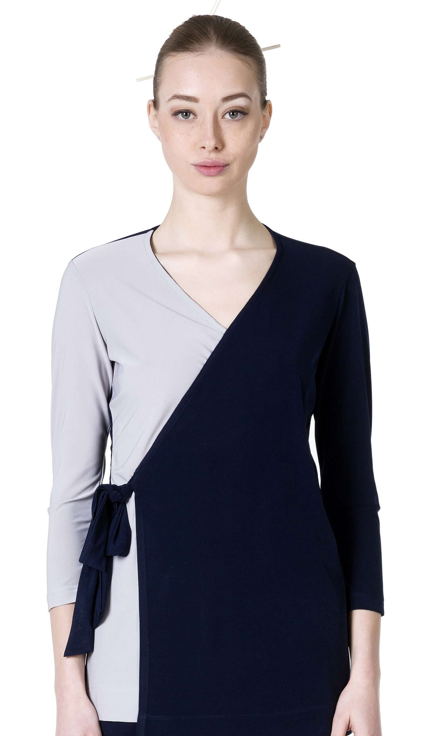 100%PL Maglina, chiusura con cintura incrociata con asola lato sinistro, manica 3/4 chiusa, senza tasche, bicolore manica e lato destro davanti.