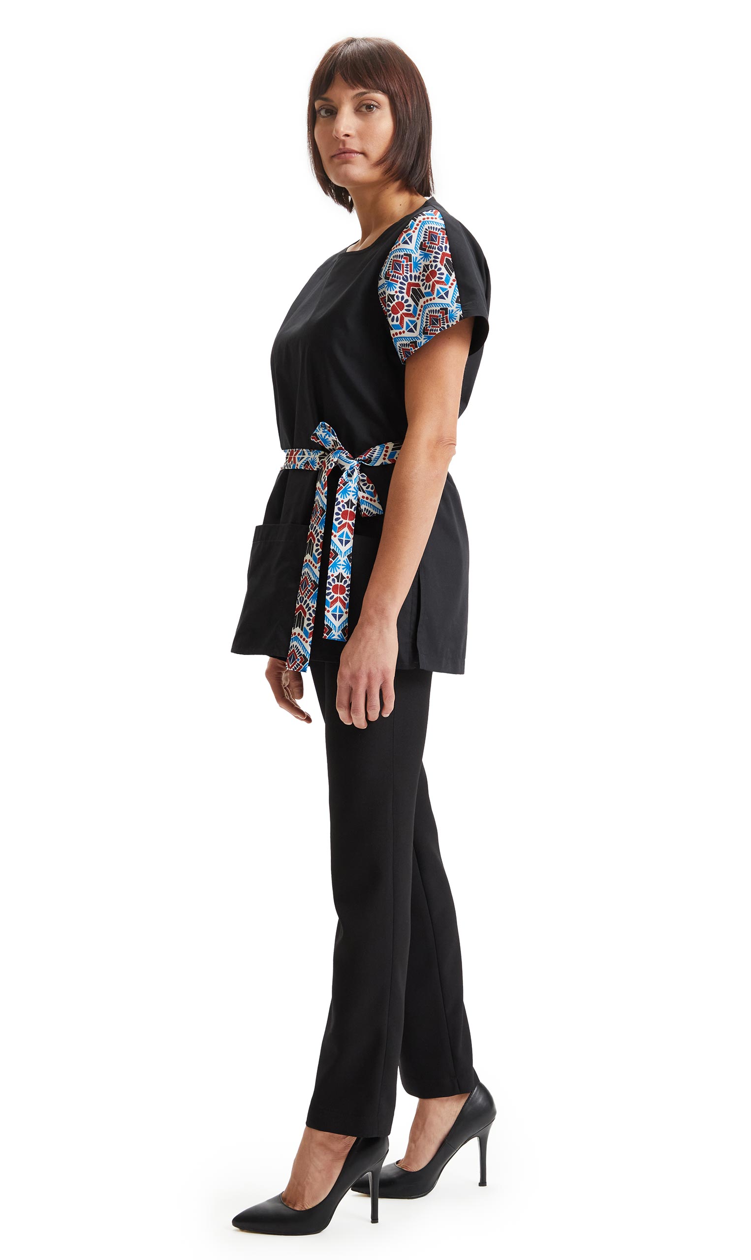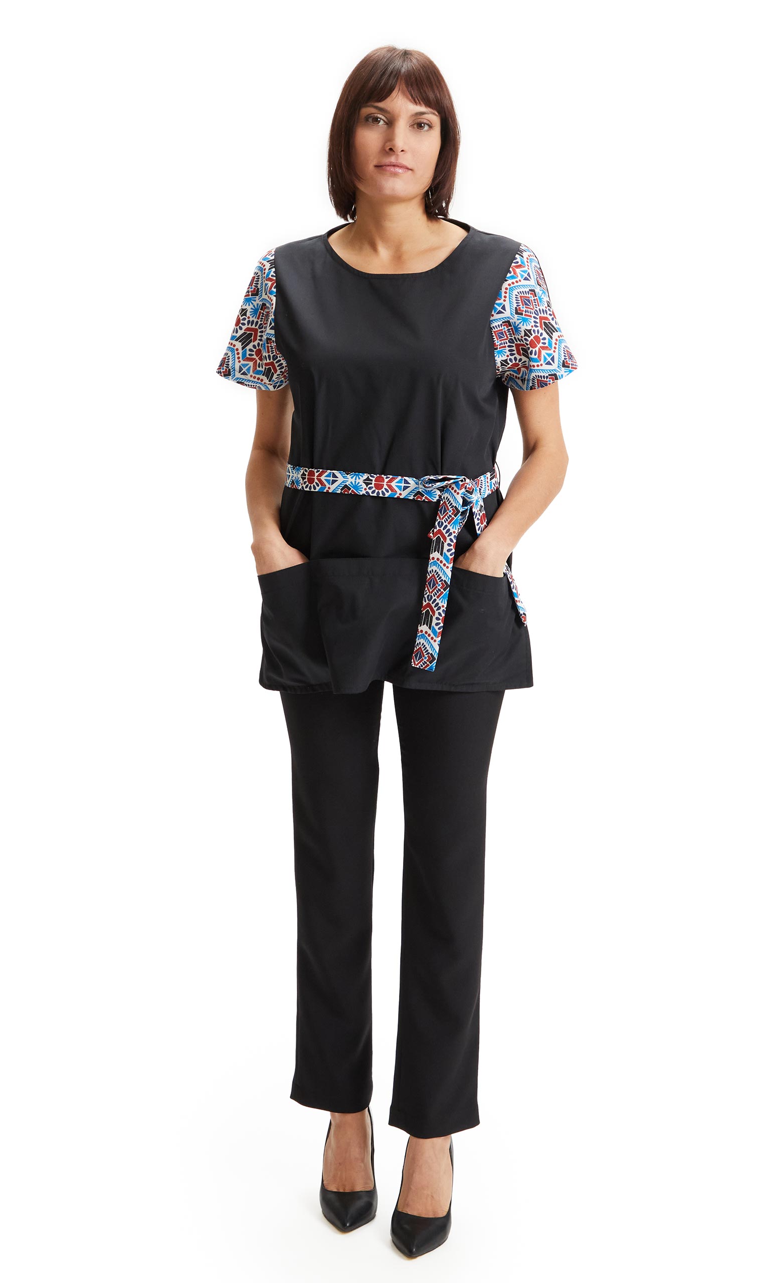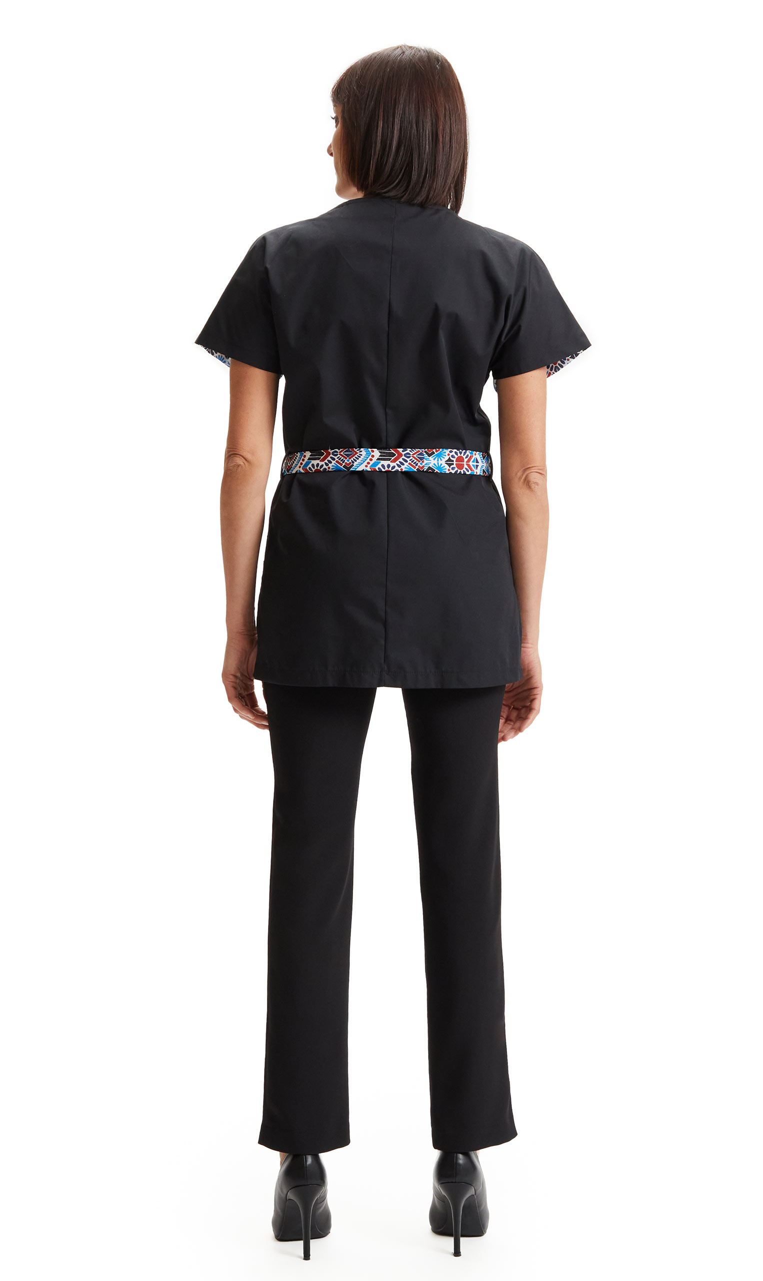 In poly/cot (65%-35%) – 140 gr/mq.), casacca girocollo particolari bicolore alle maniche e fusciacca cucita in vita, due tasche a toppa