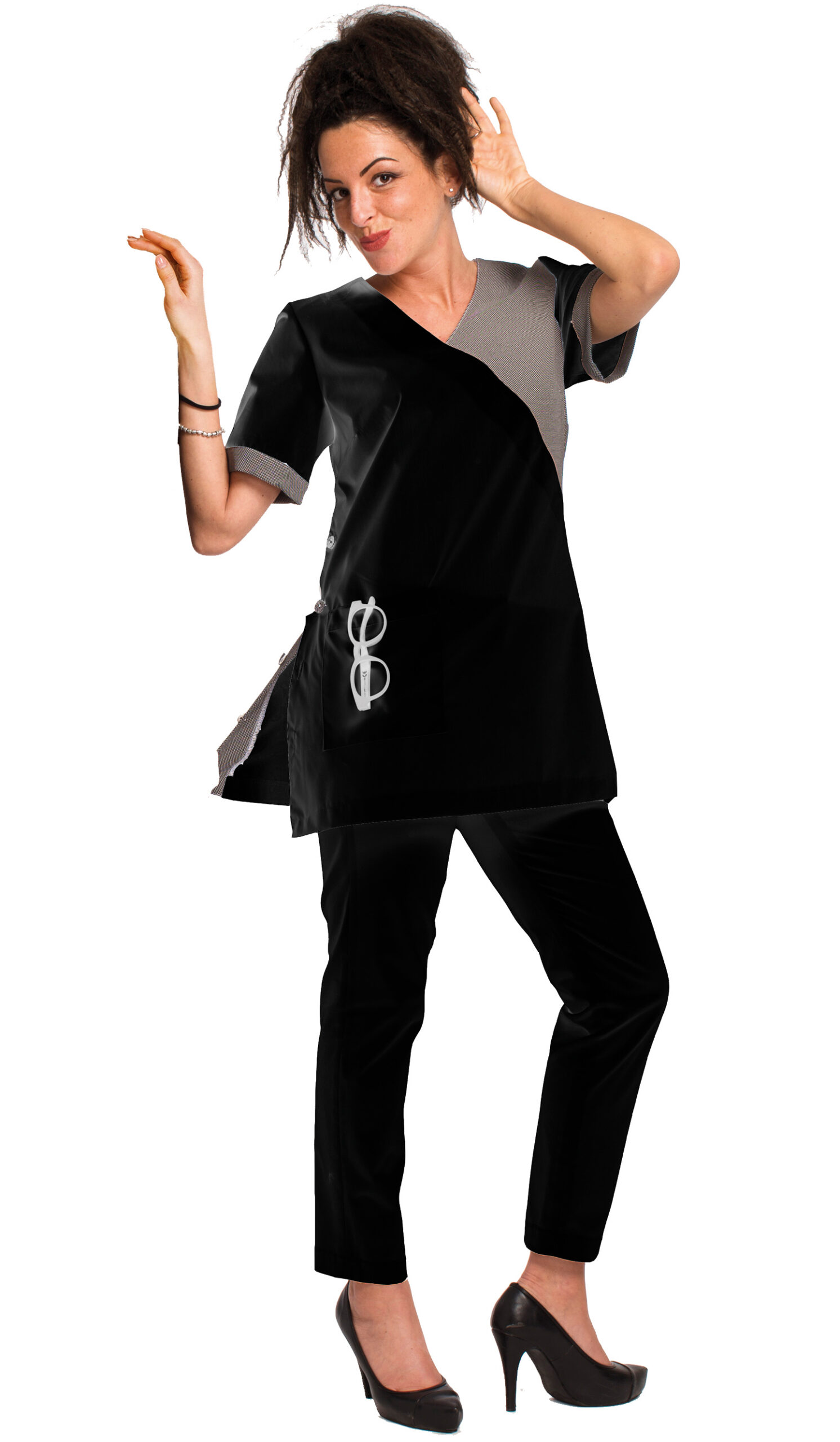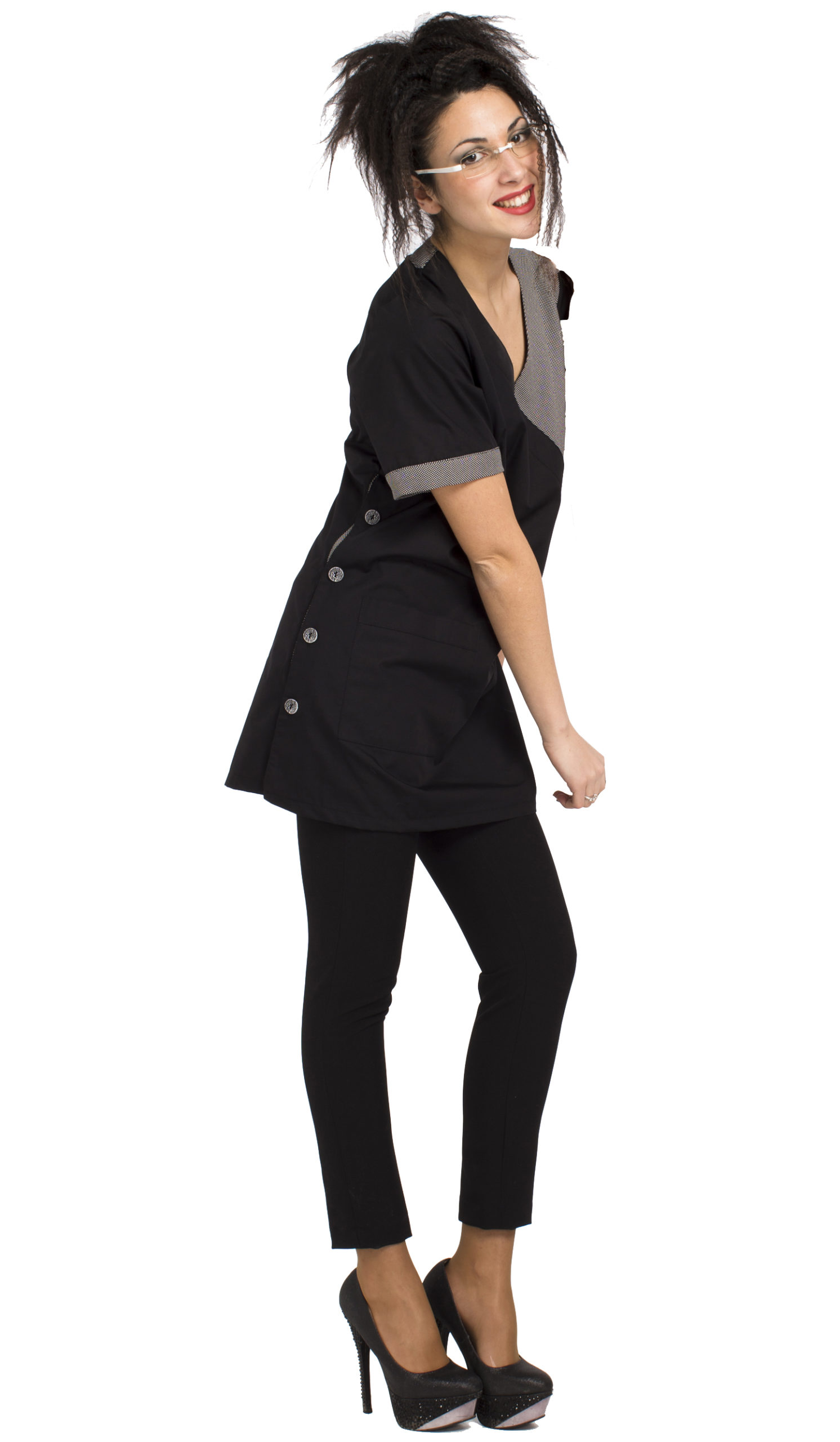 In poly/cot (65%-35%) – 140 gr/mq,) Mezza Manica con taglio incrociato, una tasca a toppa lato destro, chiusura nascosta lato dx 4 bottoni, inserto spalla sinistra e bordo maniche in contrasto.