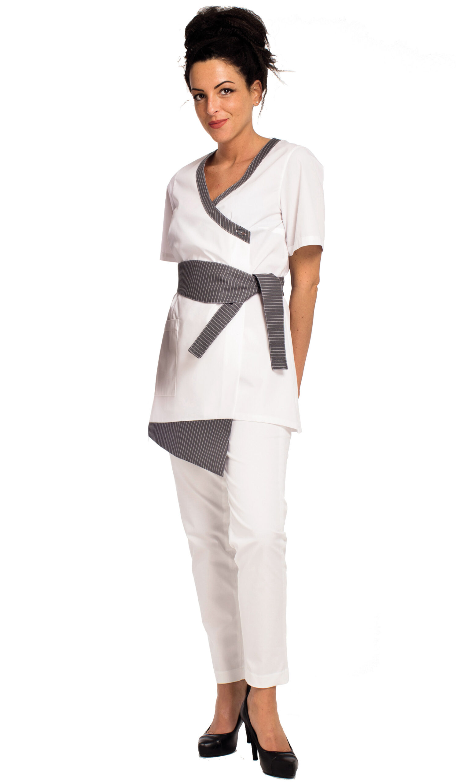 In 65%PL-35%CO – 140 gr/mq. indanthrene, casacca kimono donna incrociata con taglio asimmetrico, mezza manica, una tasca a toppa lato destro, chiusura esterna con 2 bottoni, bordo collo, inserto asimmetrico al fondo e fusciacca in contrasto.