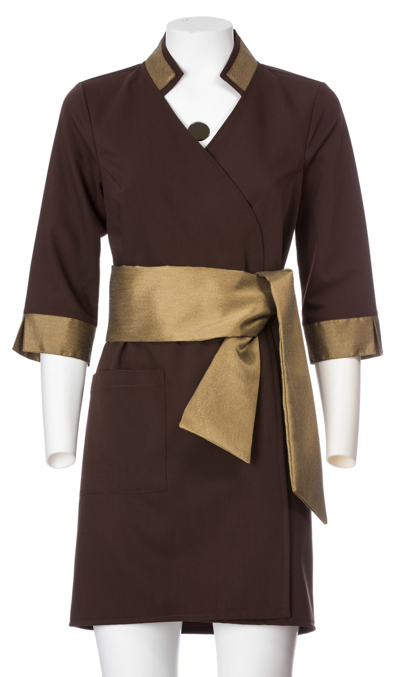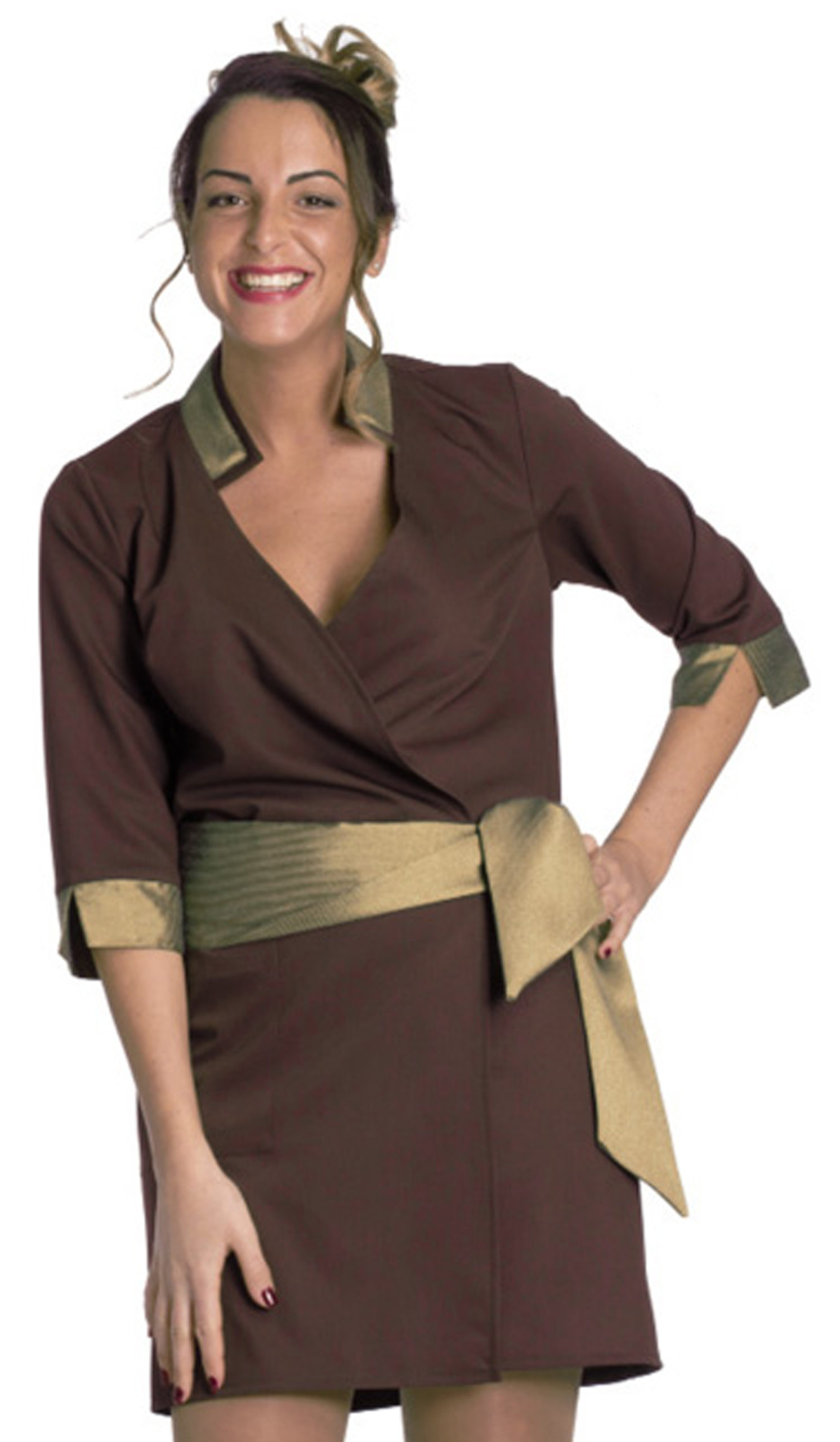 In 100% Natura® Poliestere Stretch 130 gr/mq, chiusura incrociata, manica 3/4, inserto nel collo e fusciacca in contrasto.