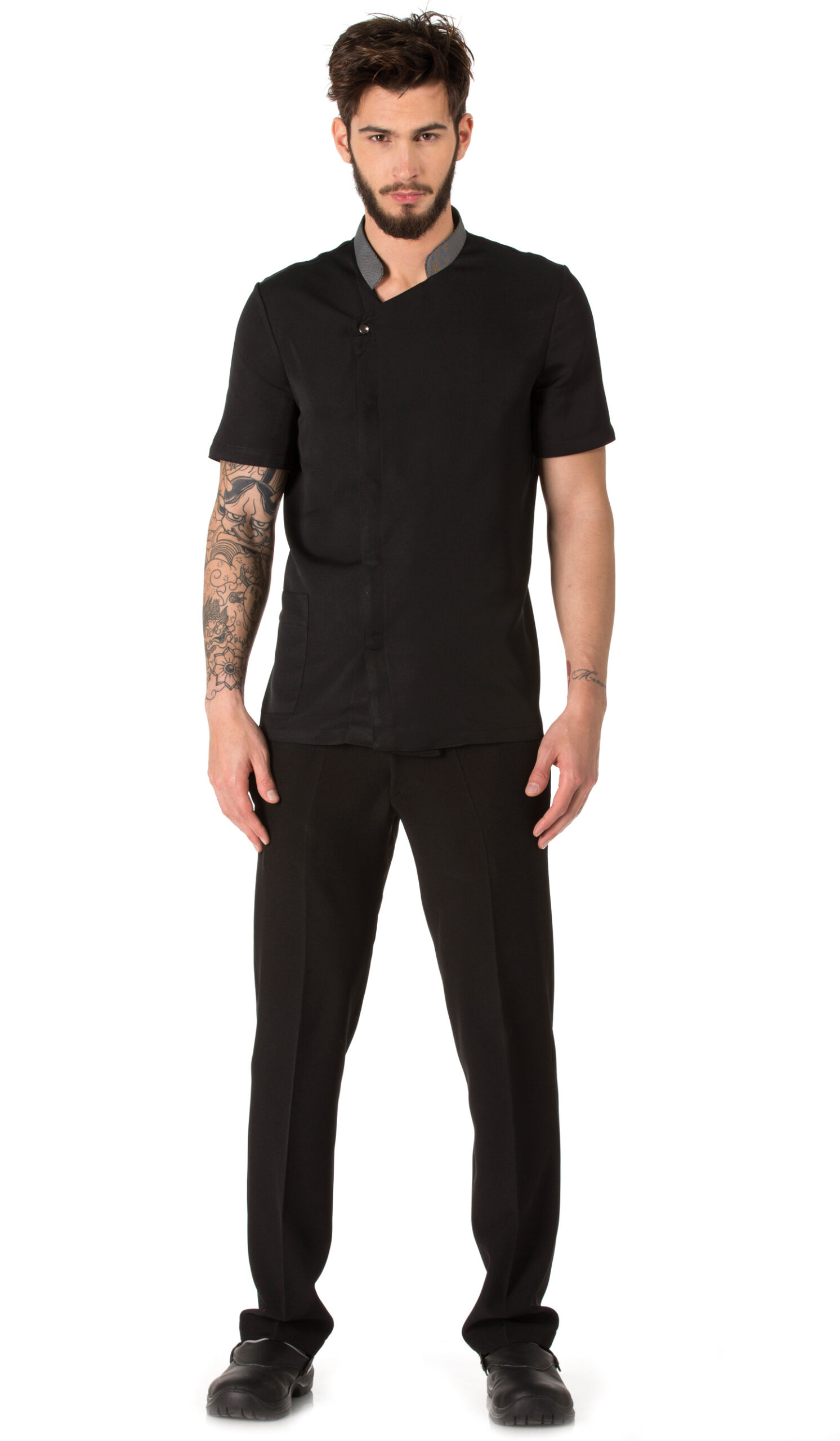 In poly/cot (65%-35%) – 140 gr/mq.) casacca collo coreana in contrasto colore, abbottonatura laterale seminascosta.
