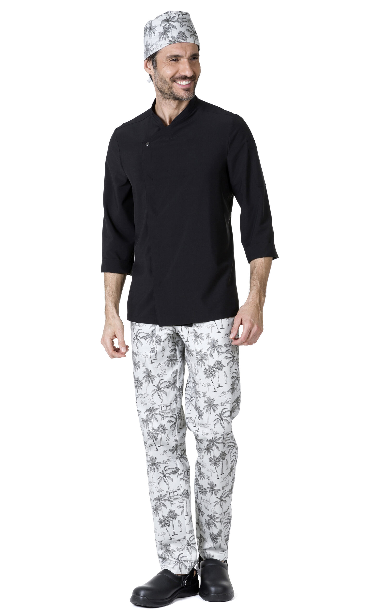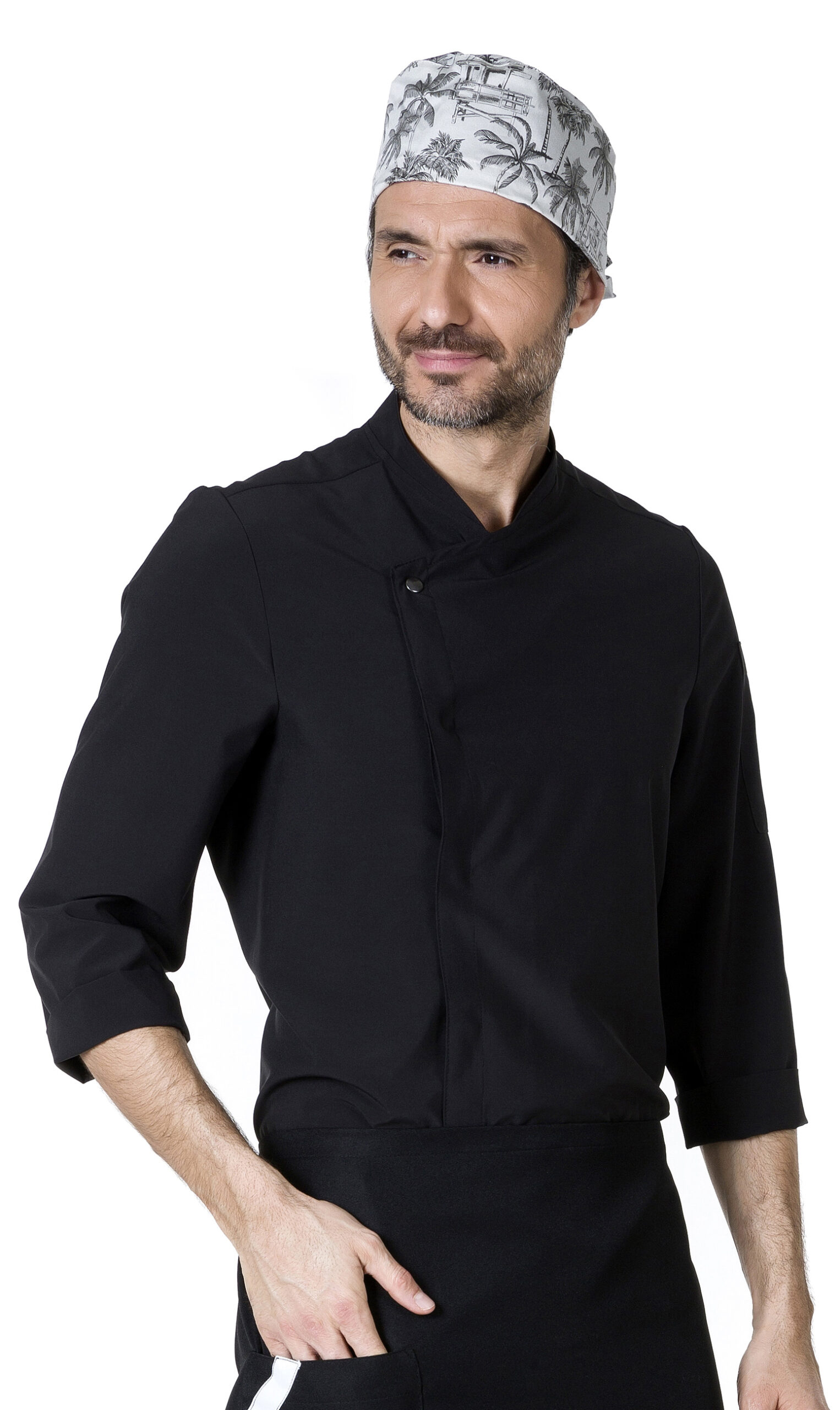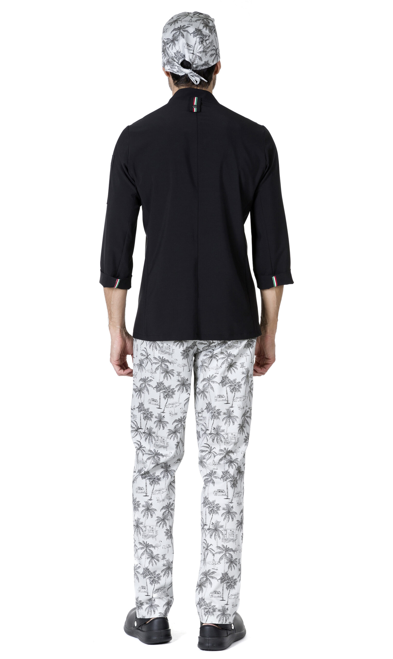 In 100%PL Microfibra ad abbottonatura nascosta lato destro con borchie, Manica Lunga con bandiera tricolore su risvolto e passante ferma grembiule centro collo dietro.