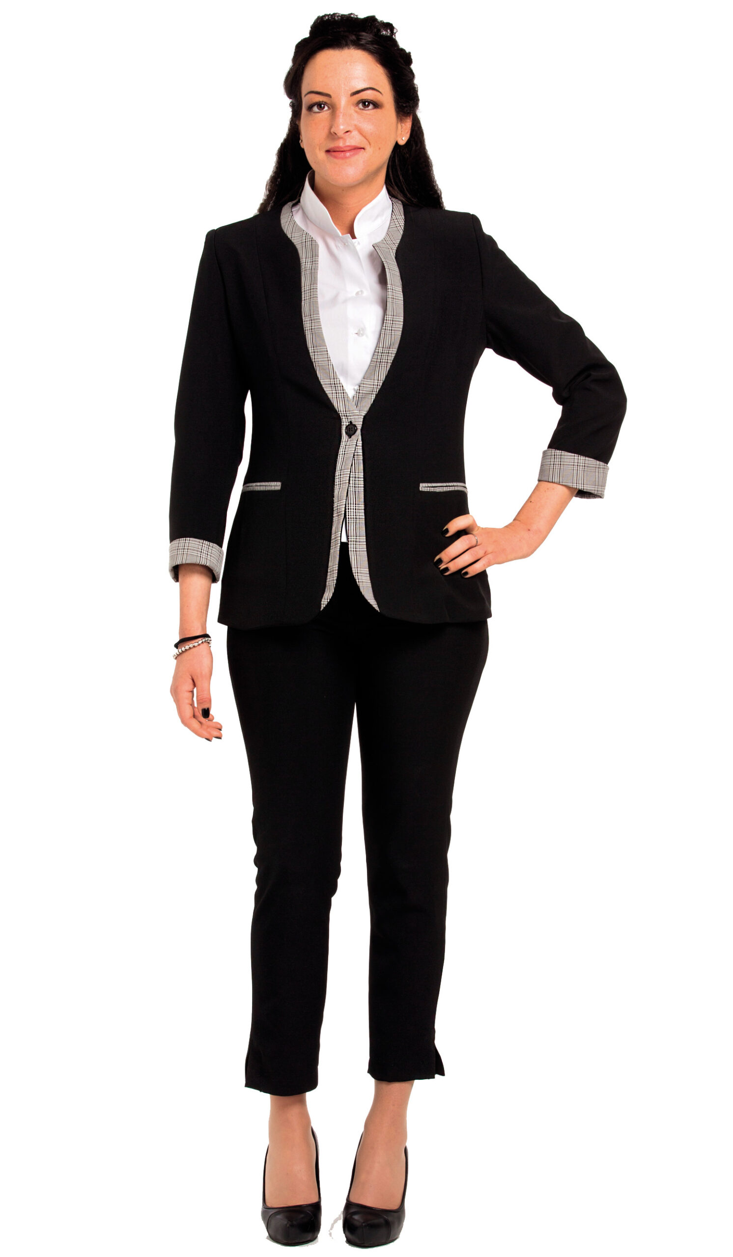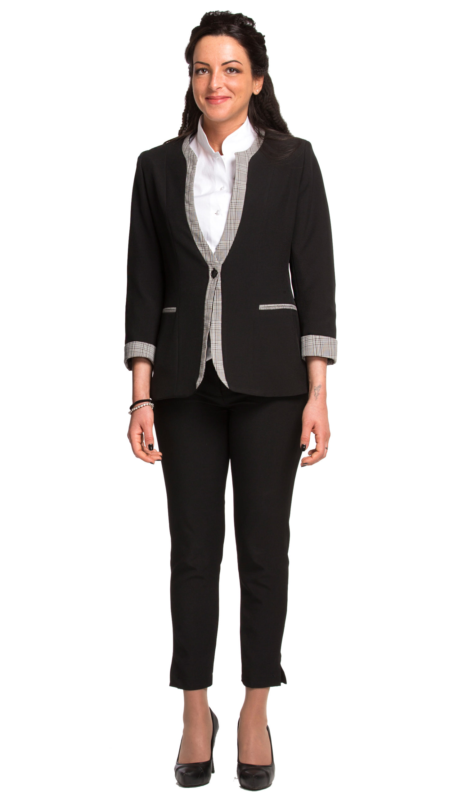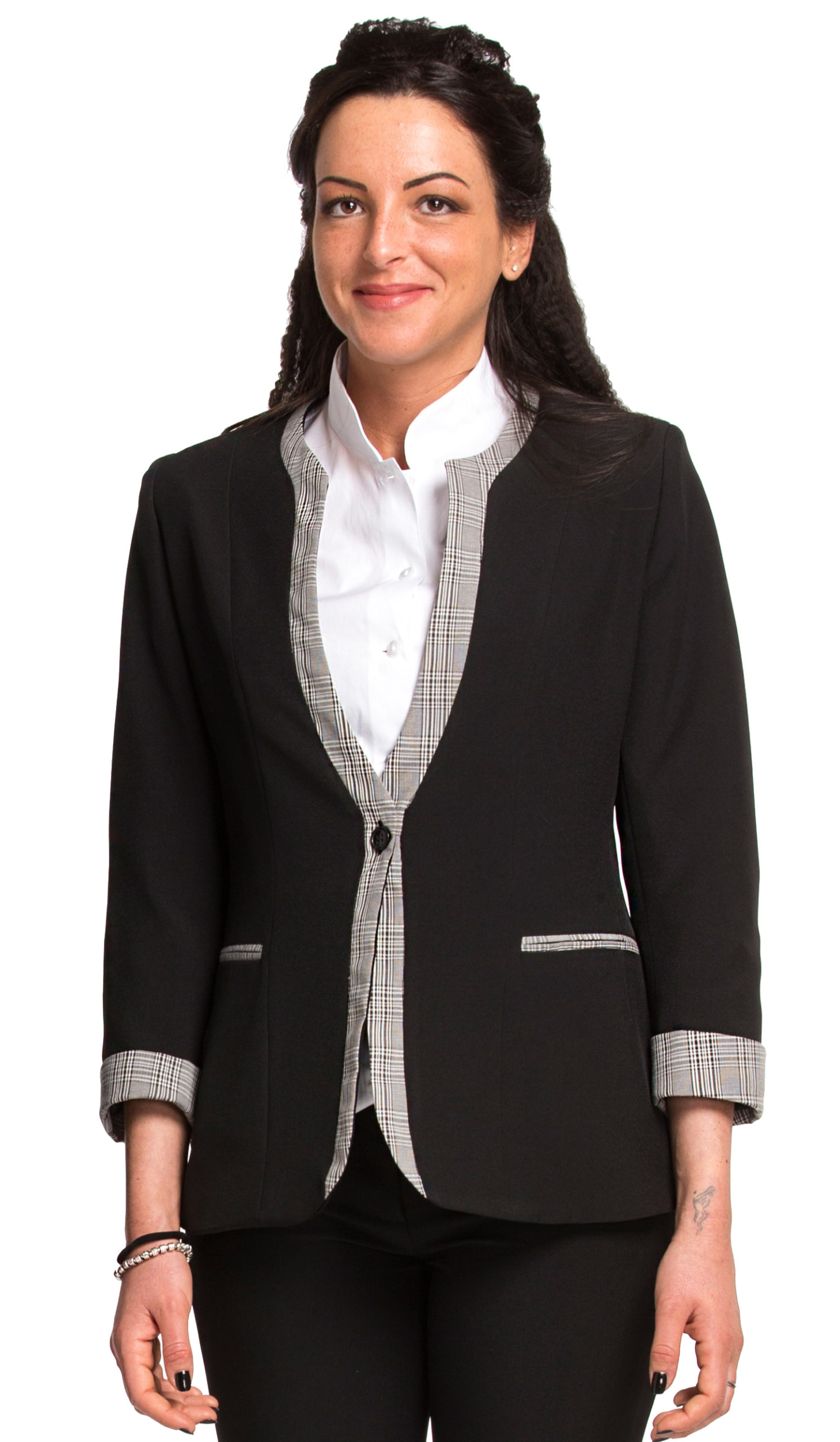 In 97% poliestere 3% elast. 220gr/mq, girocollo scavato sul davanti allacciatura a un bottone Manica 3/4 con risvolto al fondo, tasche a filetto in contrasto colore