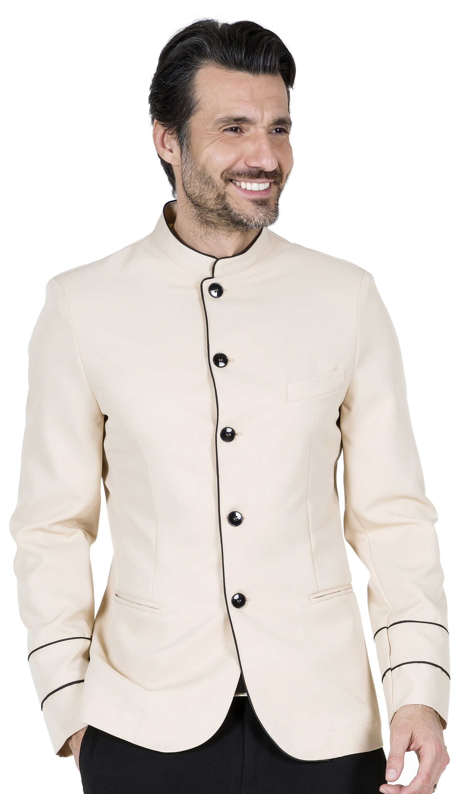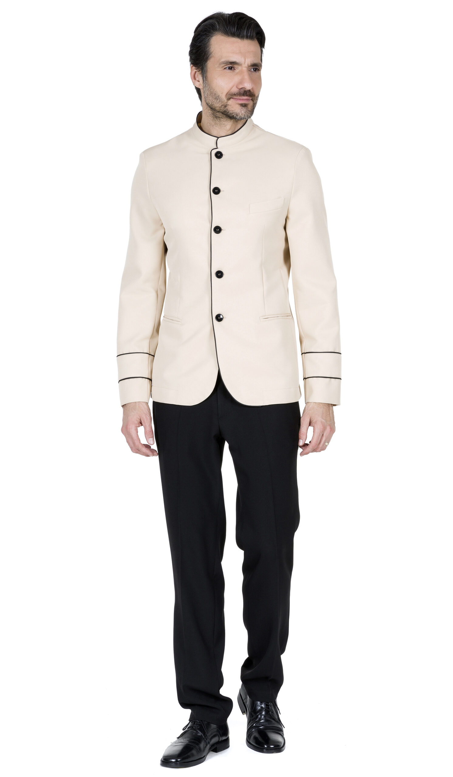 In 100%PL ultra slim con allacciatura centrale filettata davanti lato destro, doppio filetto sulle maniche e collo, taschino petto Sx con pattina e due tasche laterali a filetto.