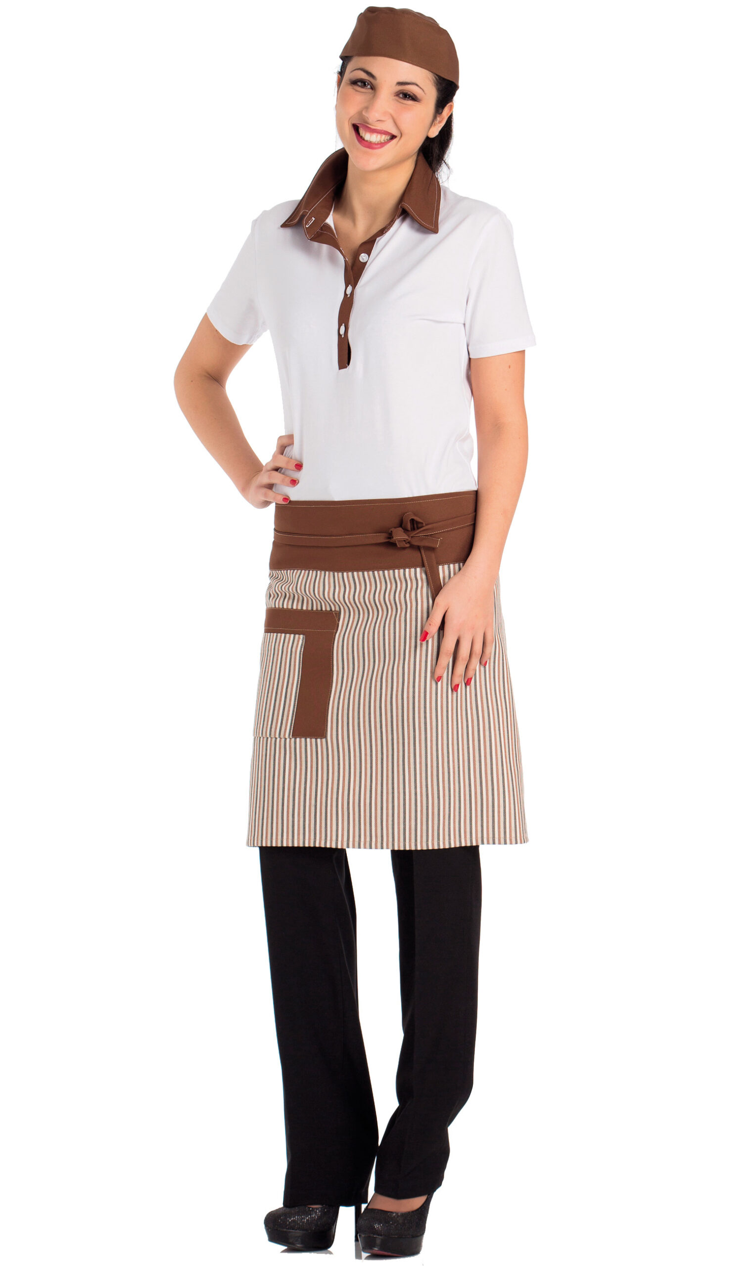 In Poly/cot 65%-35% peso 190 gr/mq, larg. cm 75 x alt. Cm 50, con fascia in vita e doppia tasca sormontata bicolore, in contrasto colore.