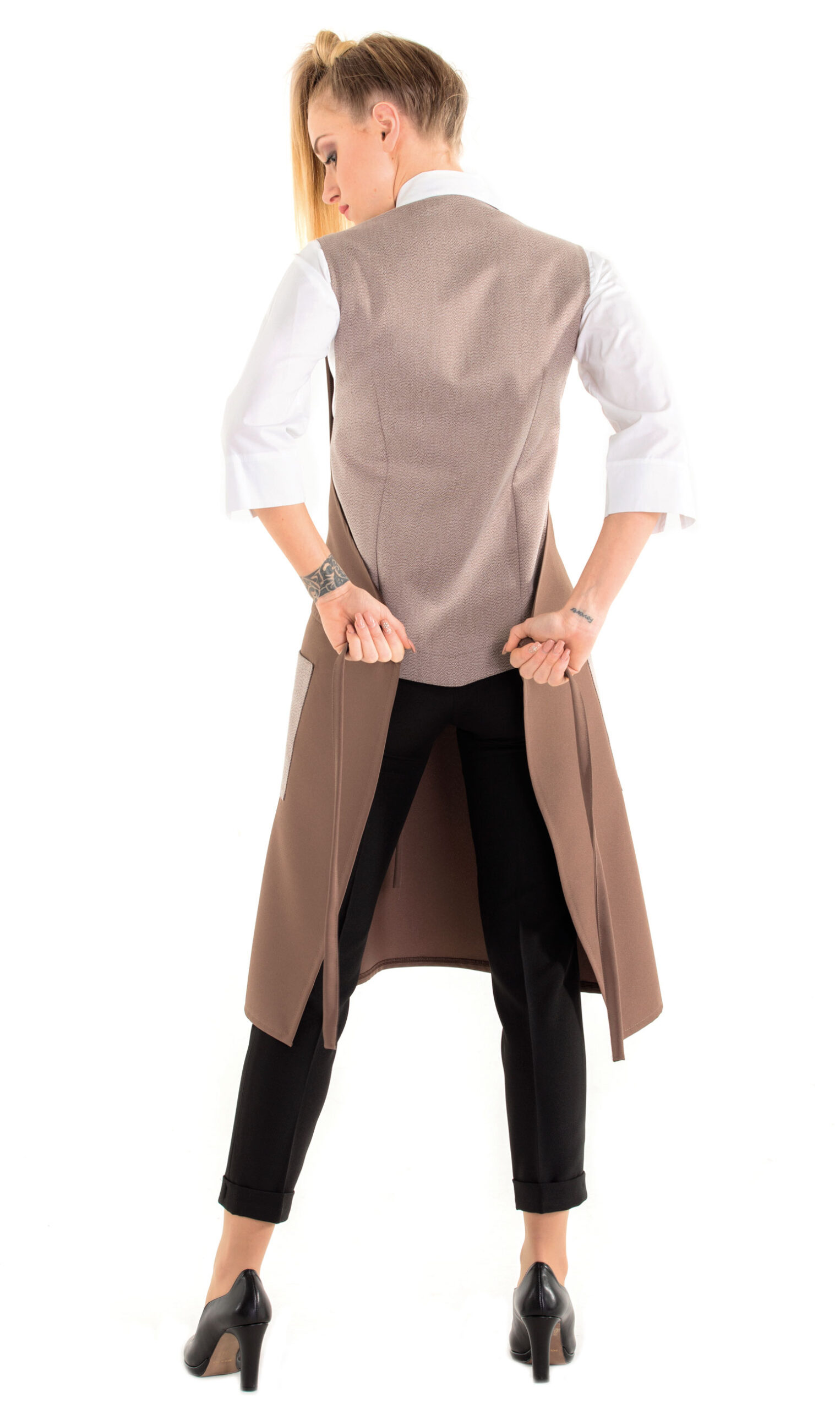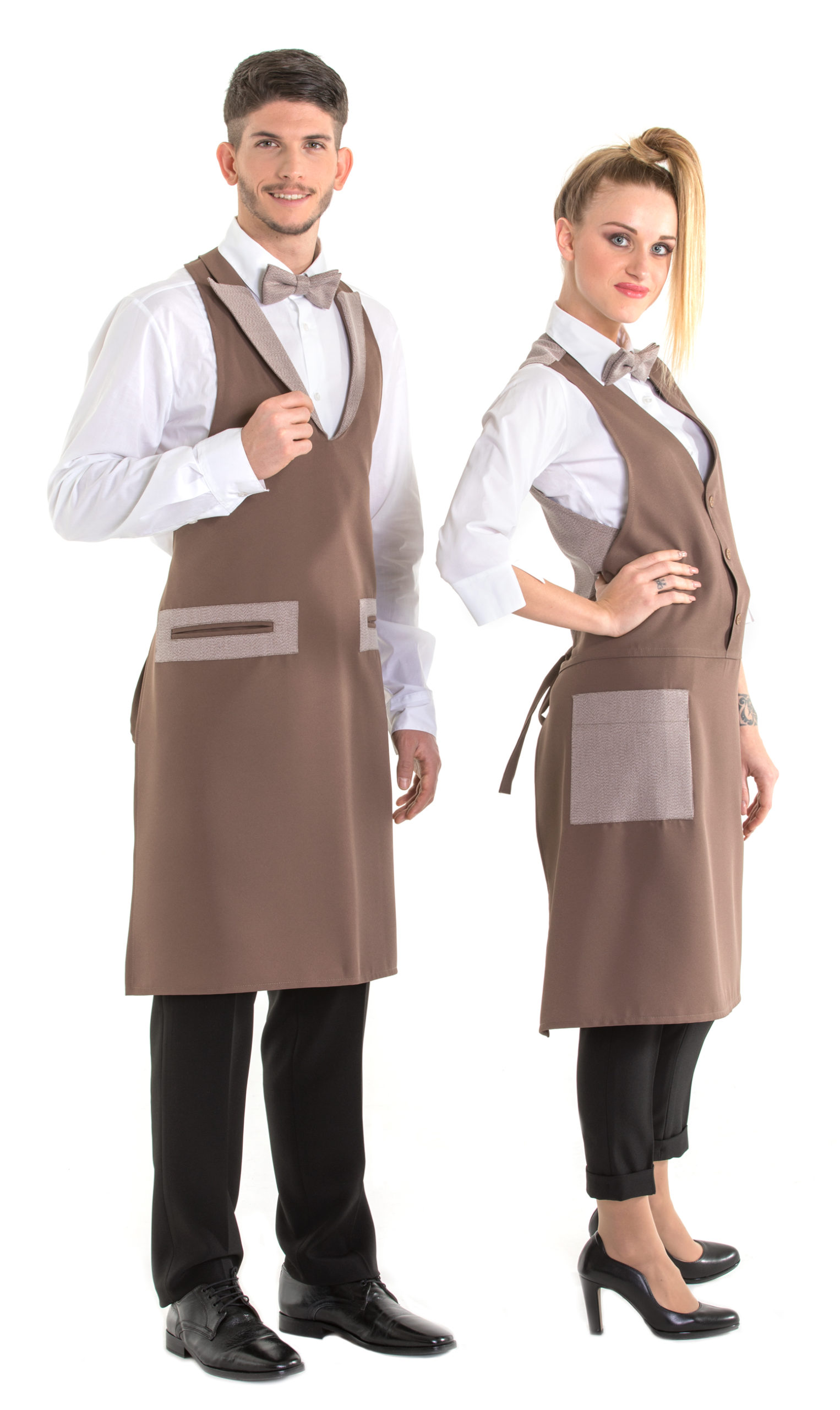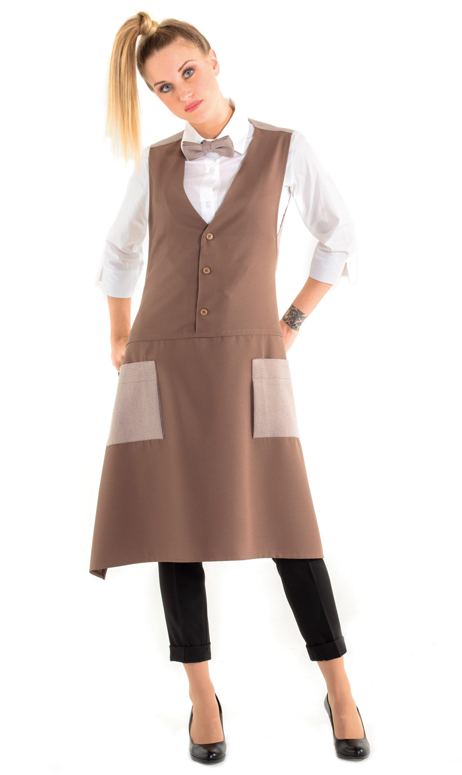 In 100% poliestere peso 330 gr/mq. larg cm 70 x alt cm 100, scollo “V” con bottoni cuciti, mezza schiena e due tasche a toppa