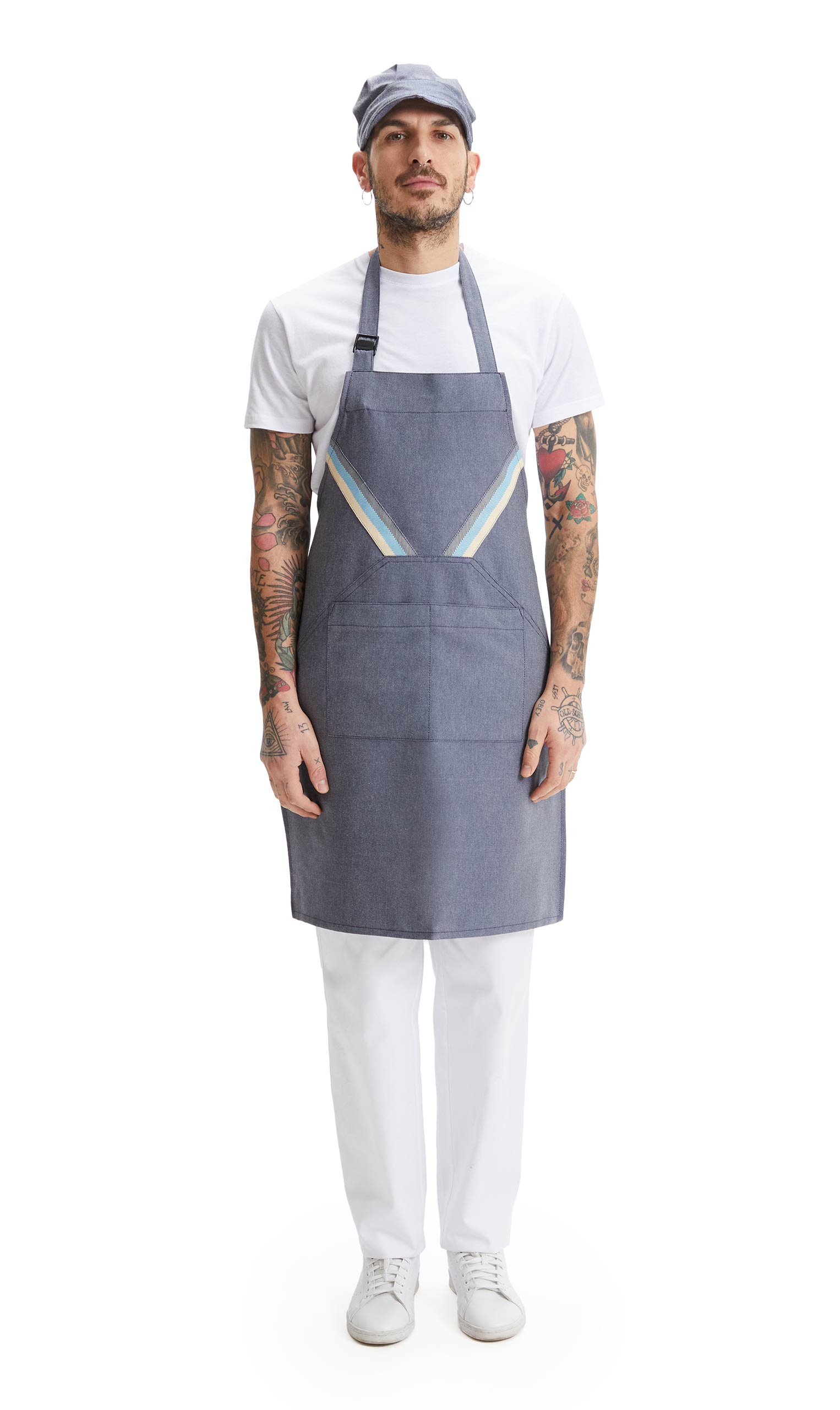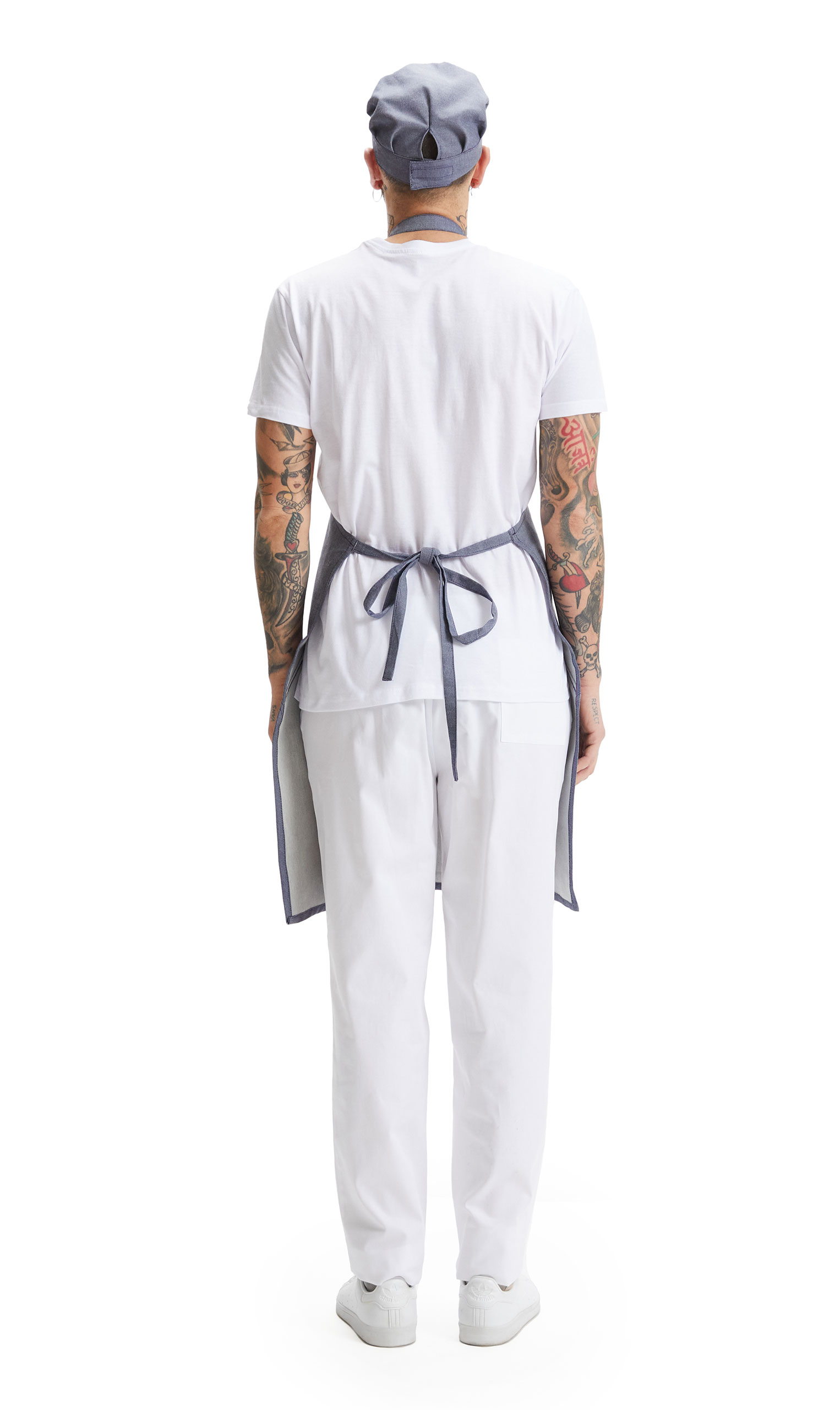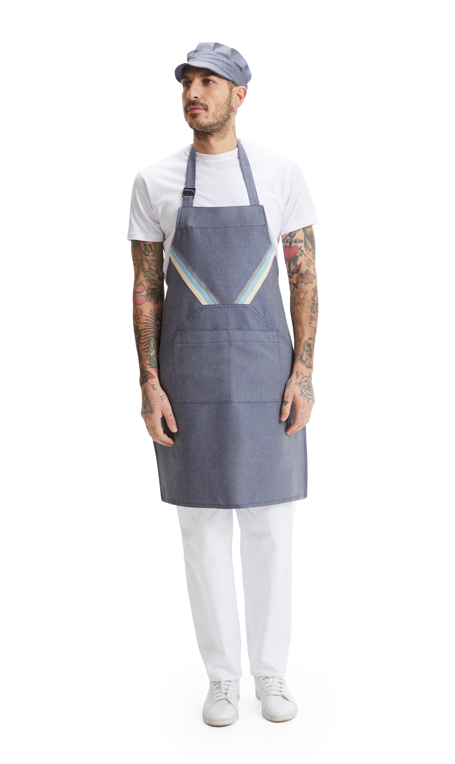 In 50% PL 50% CO., larghezza cm 66 altezza cm 85, grembiule con pettorina, tasca centrale e inserti laterali con passamaneria