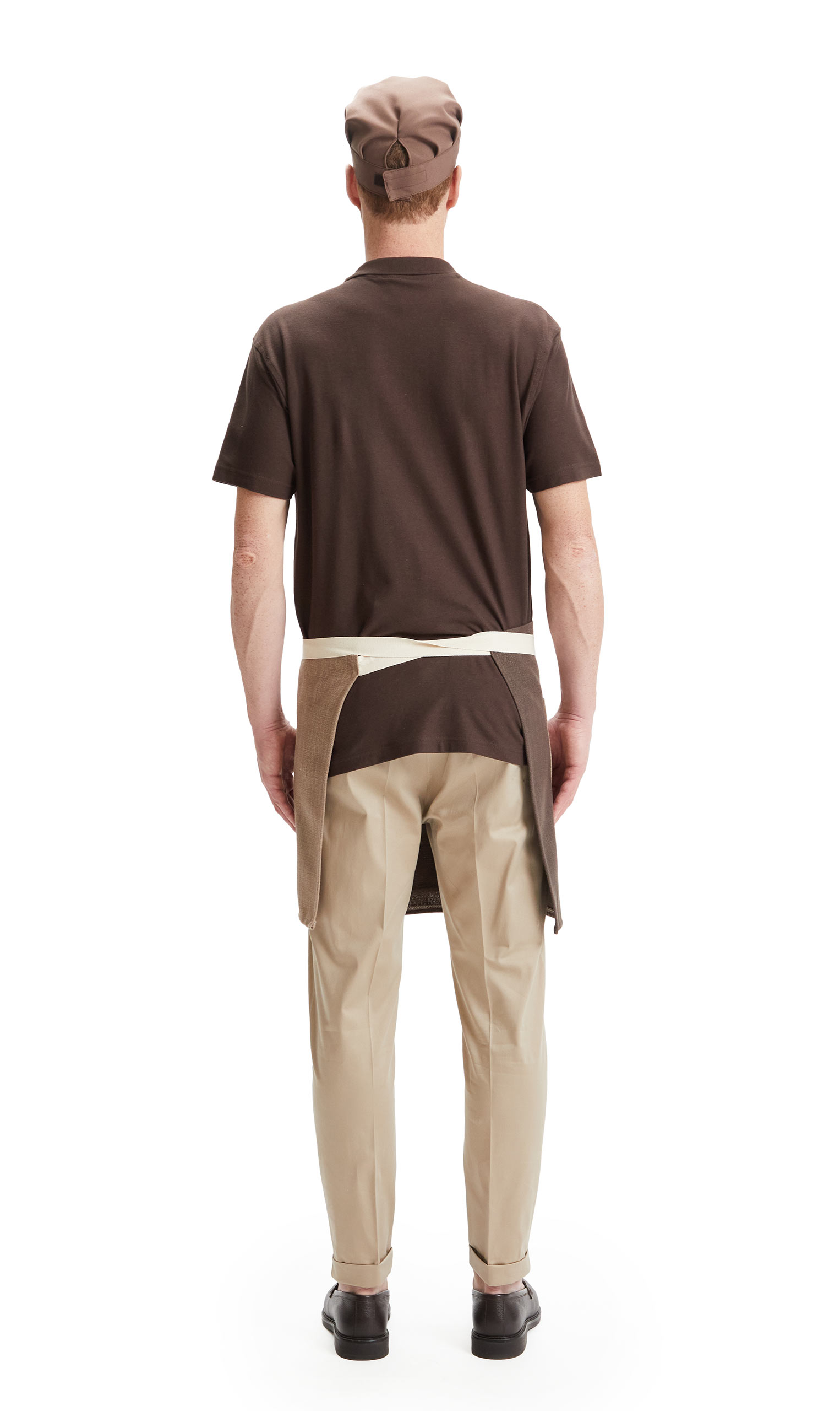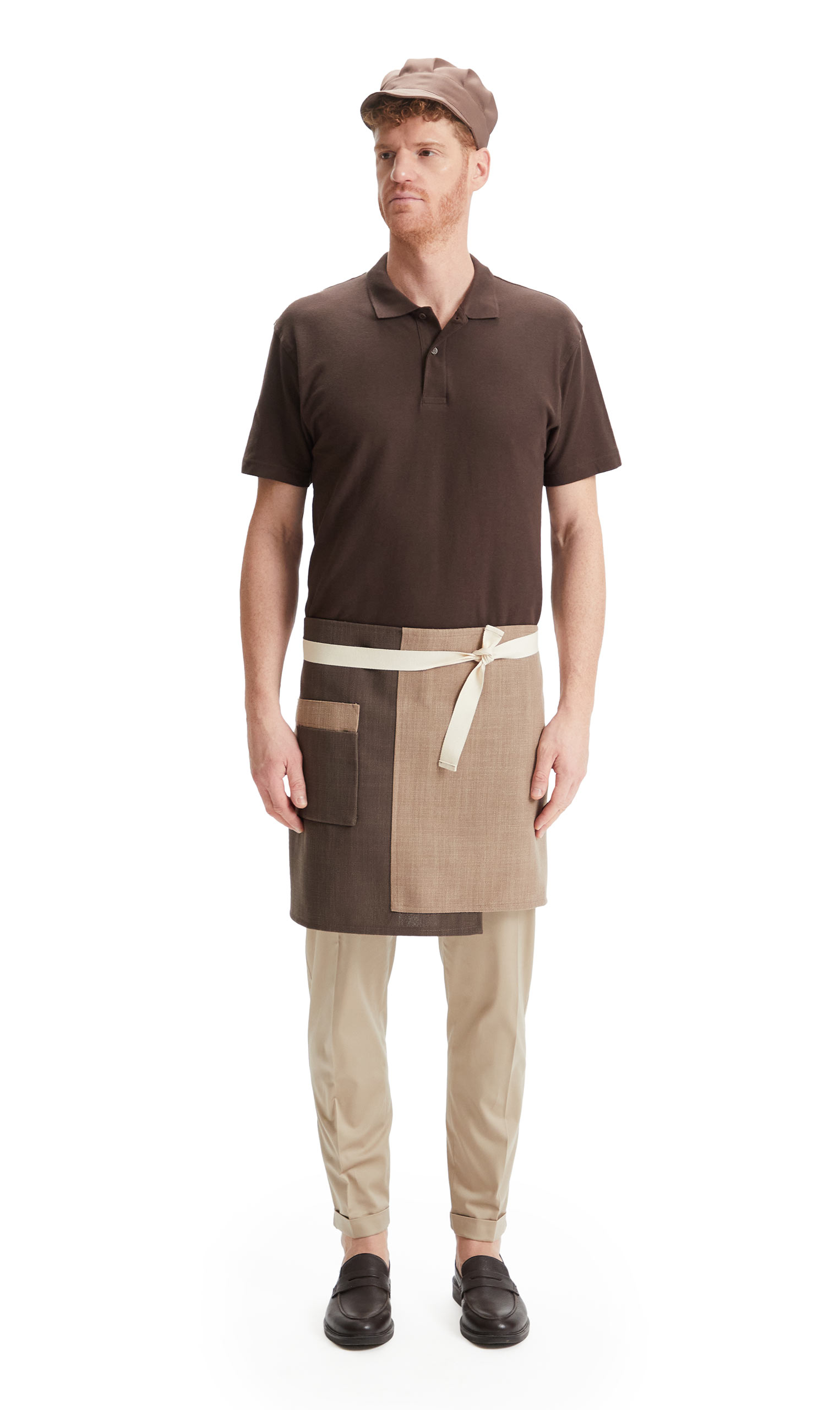 In 80%PL 20%Lino, largh. 78 x alt. 49, bicolore, grembiule assimetrico a vita, allacciata con fettuccia in Gro