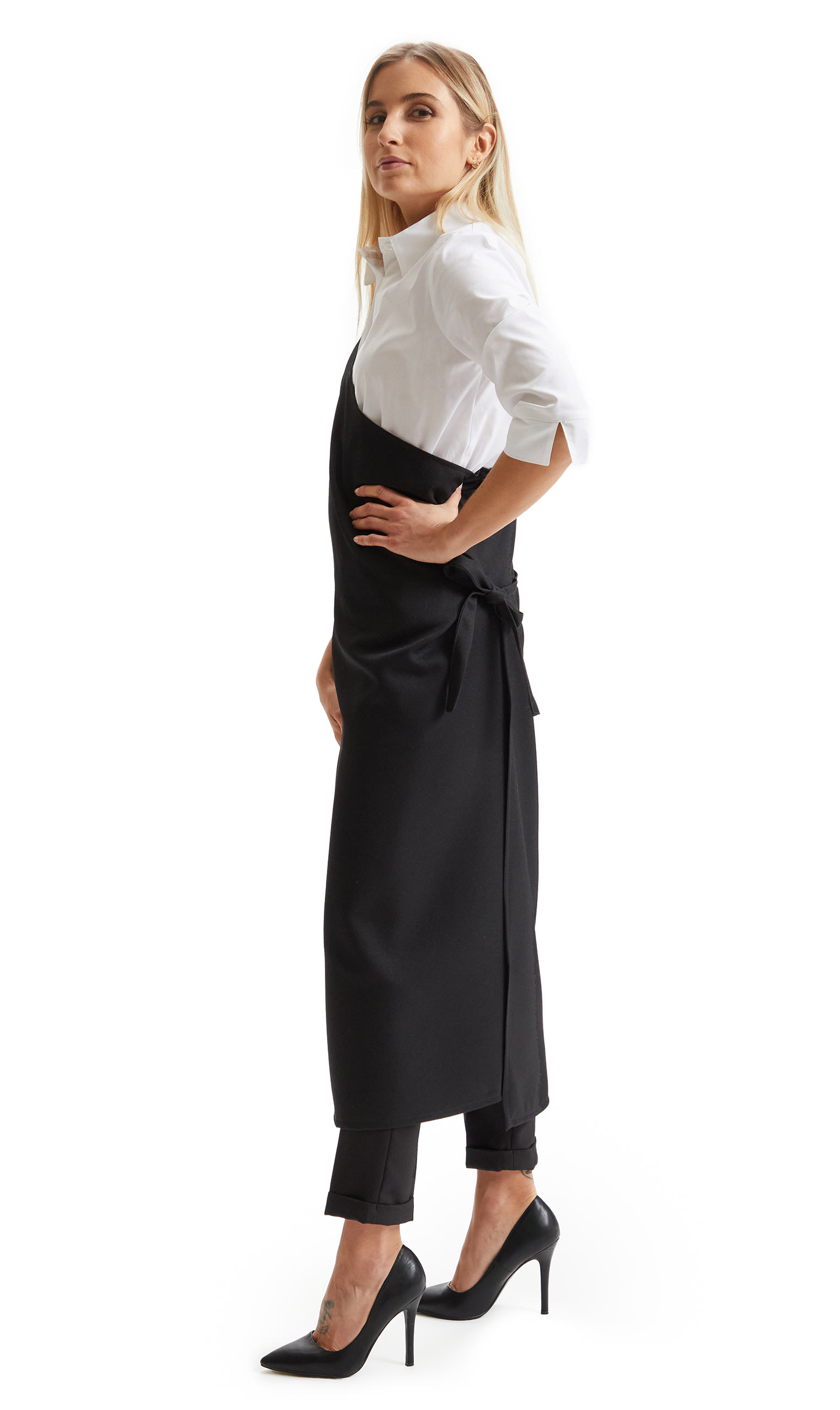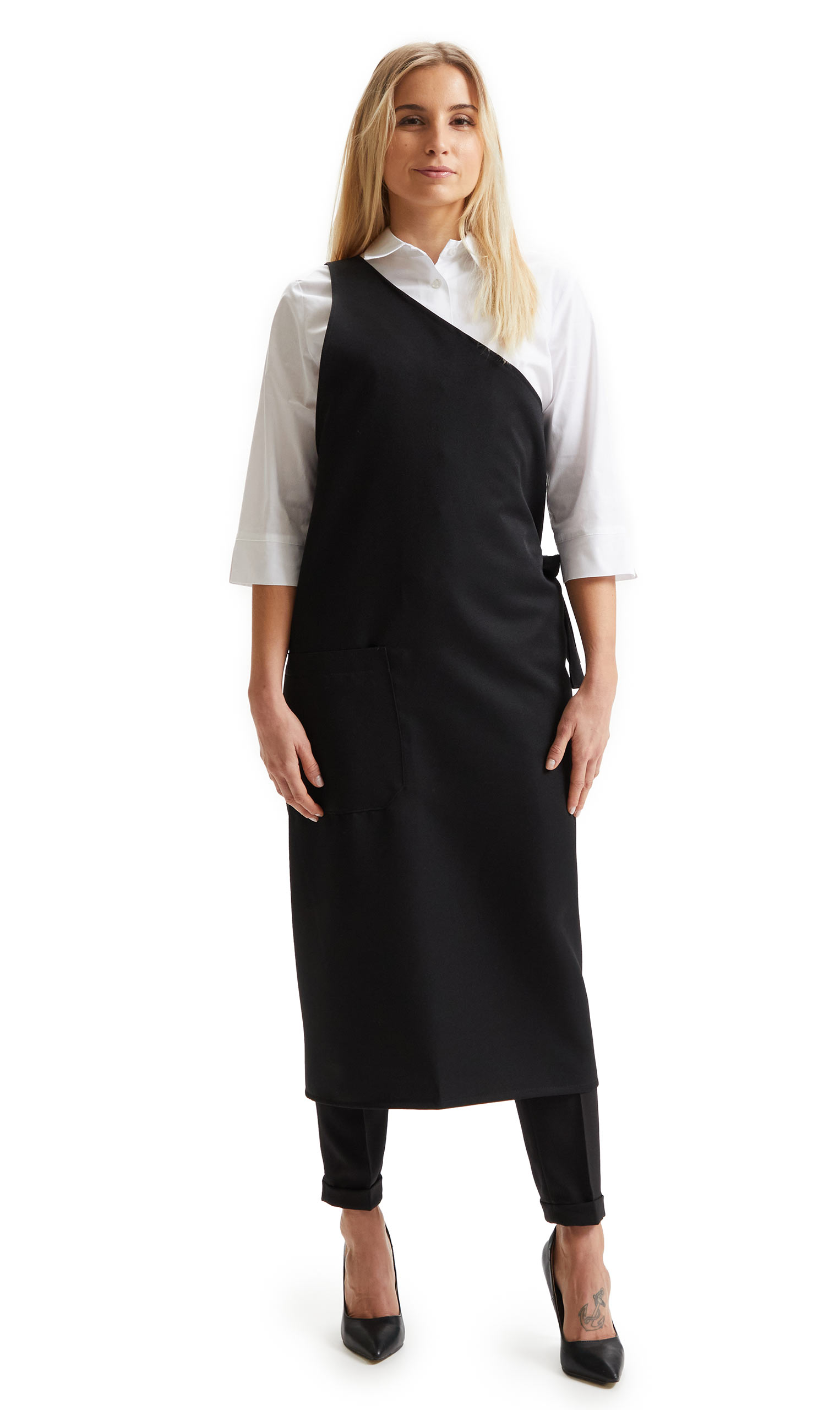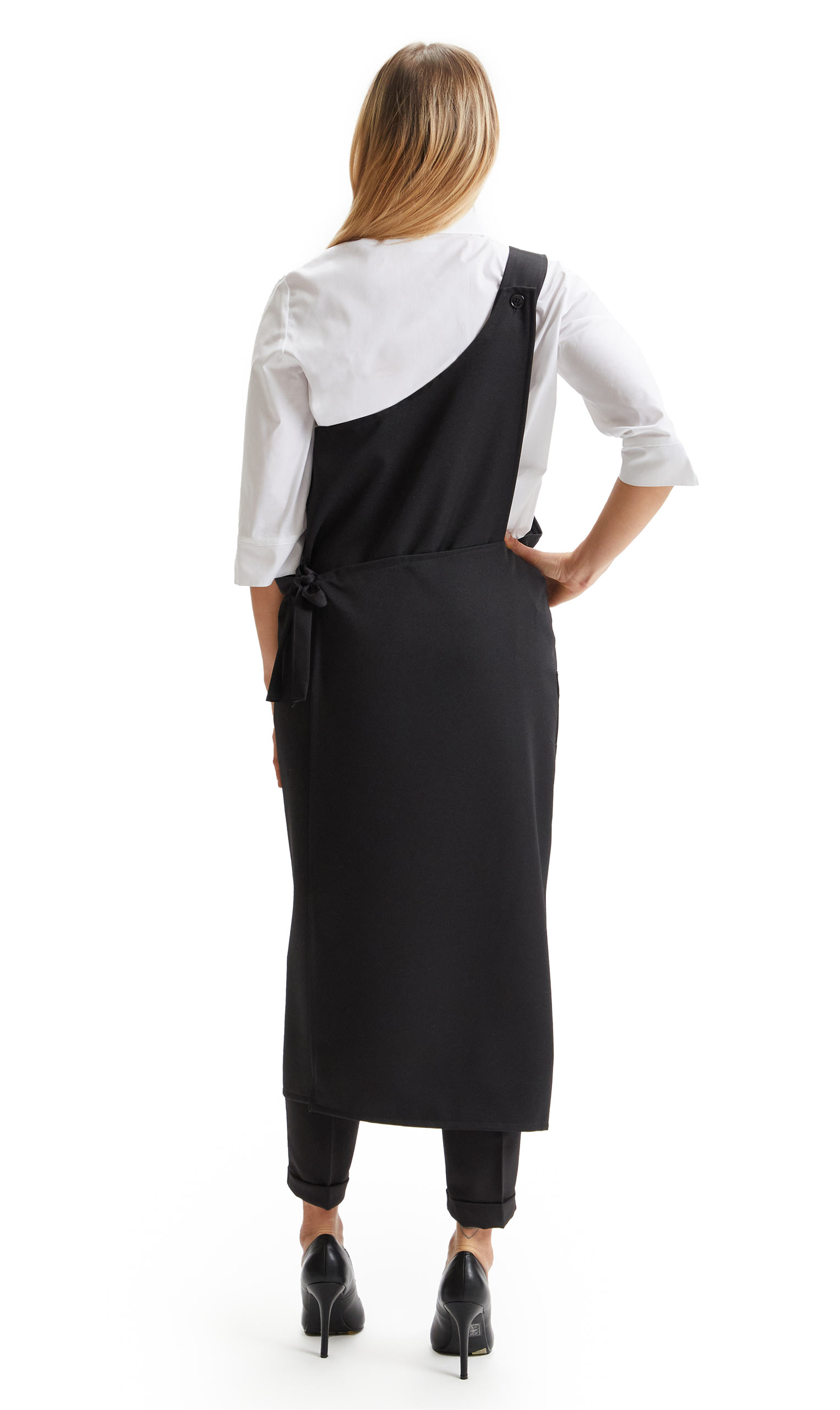 In 100% poliestere, peso 330 gr/mq., larg.125 x alt.118, grembiule monospalla, tasca laterale, allacciato sul fianco