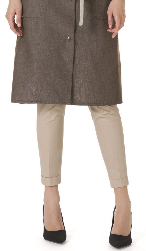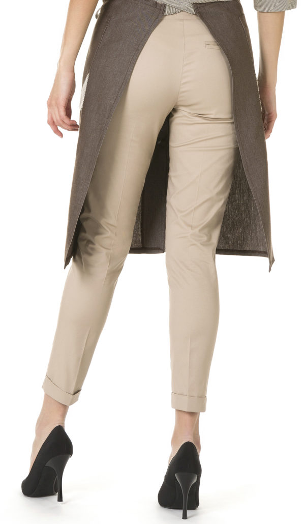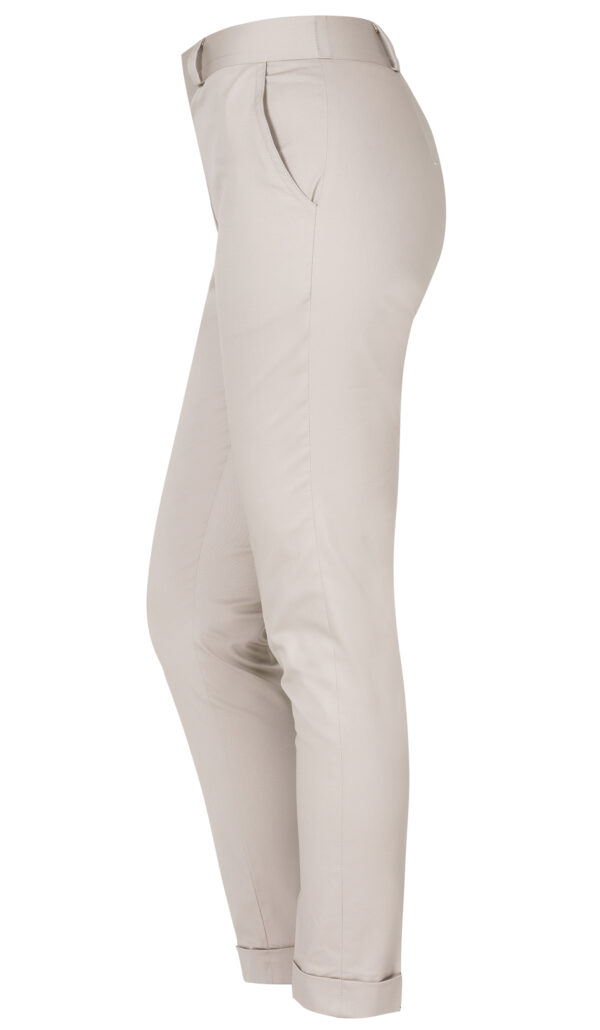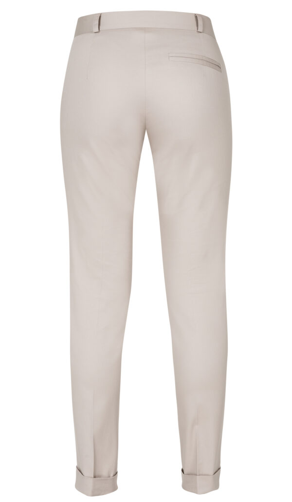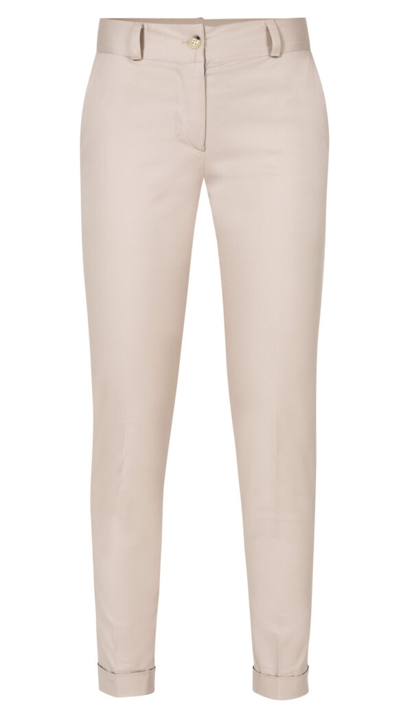 In 95% Cotone 5% elast., vestibilità slim, tasche sul davanti alla carrettiera, tasca posteriore con filetto, passanti in vita, risvolto sul fondo.