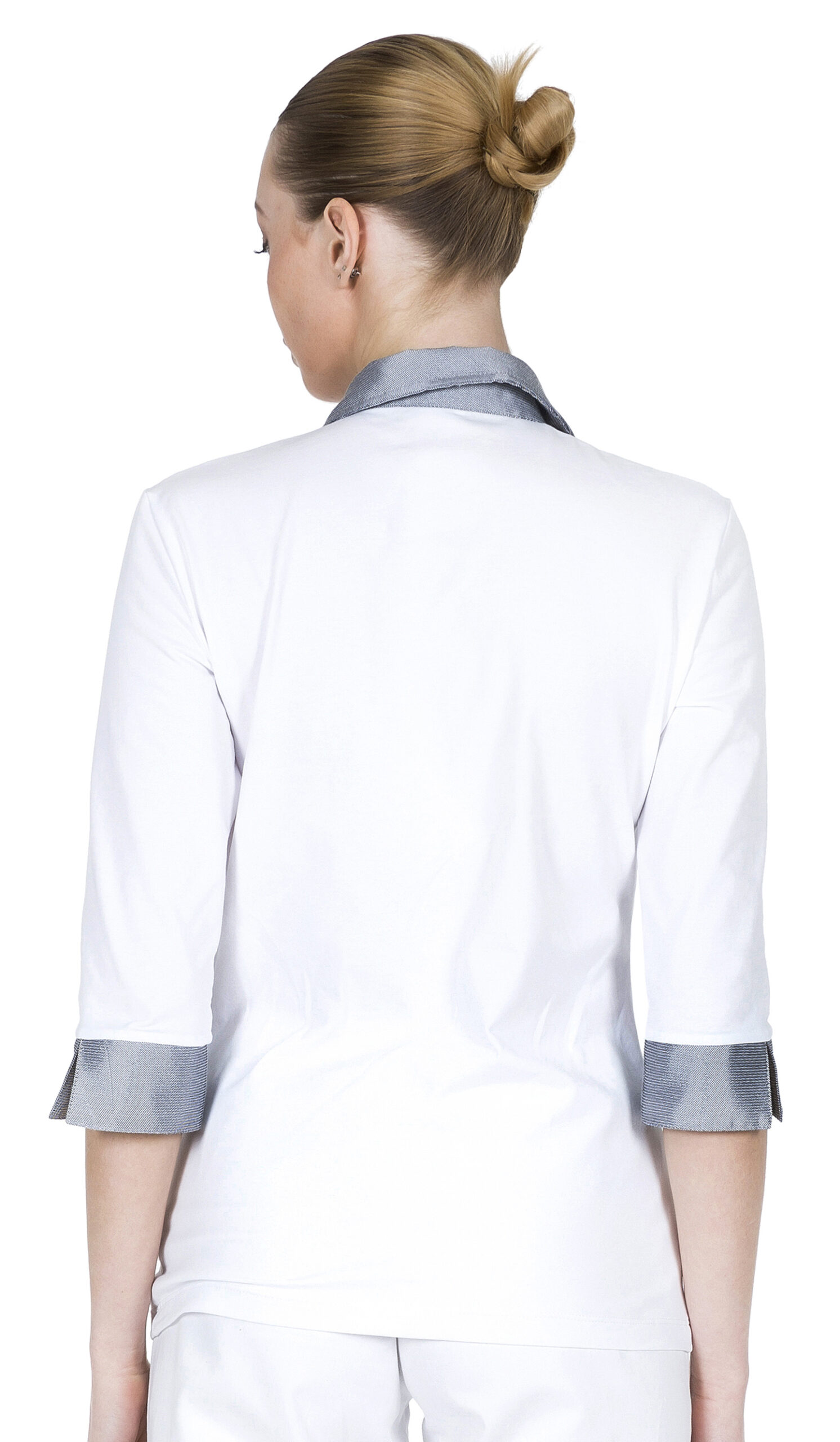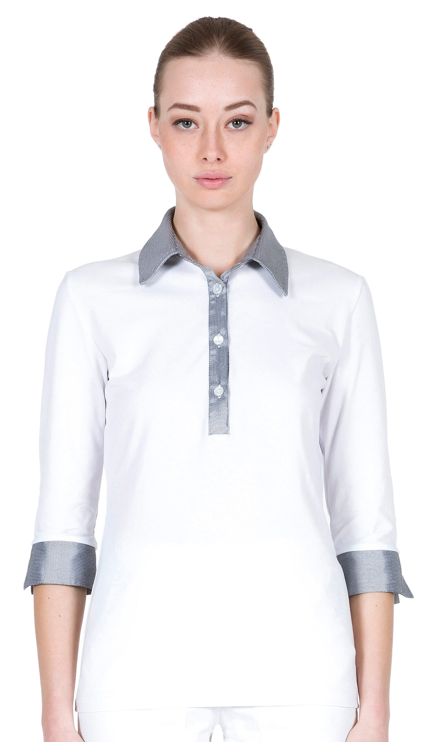In 100% Jersey cotone/elast., Manica 3/4, collo a camicia e apertura in contrasto