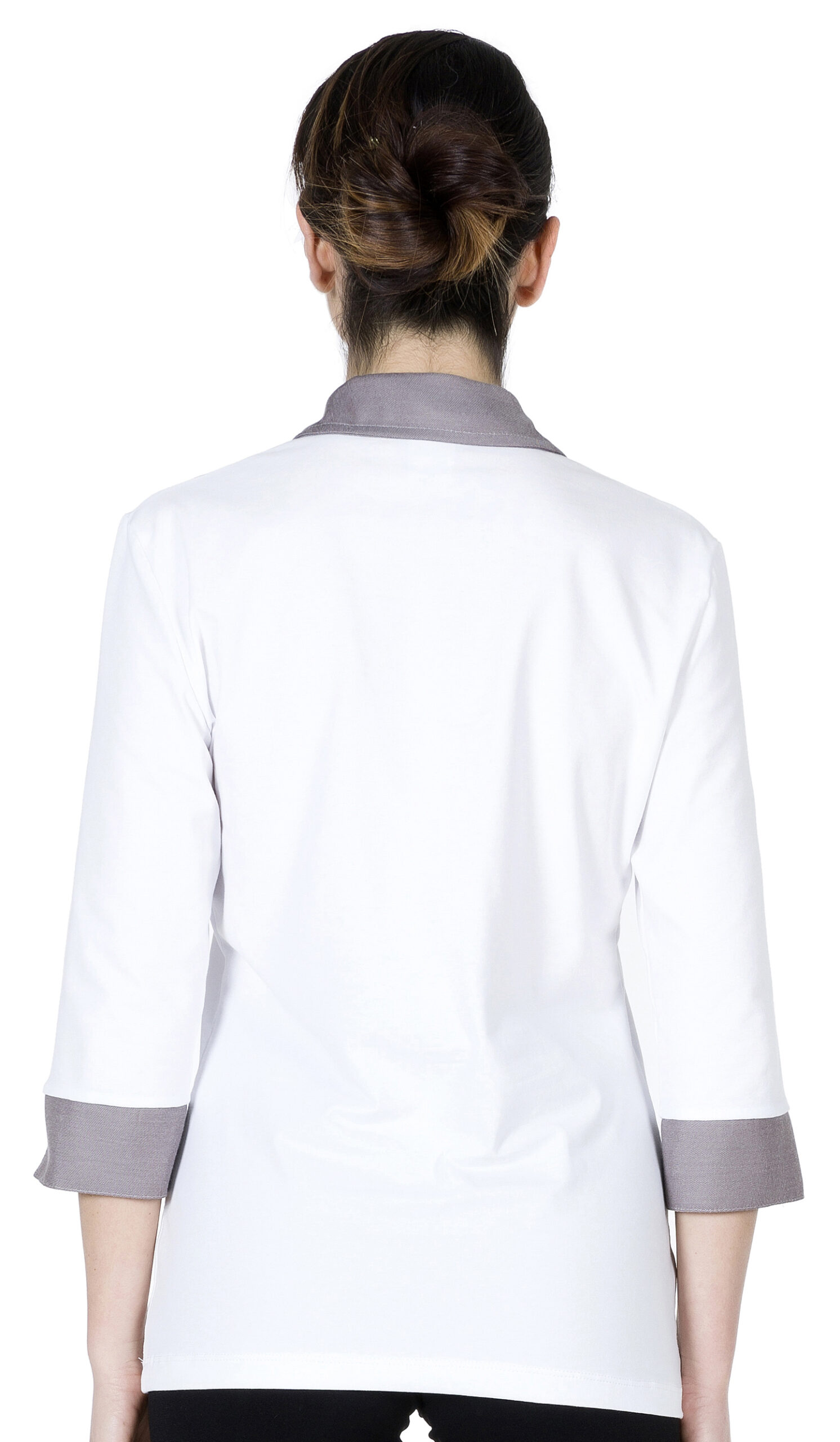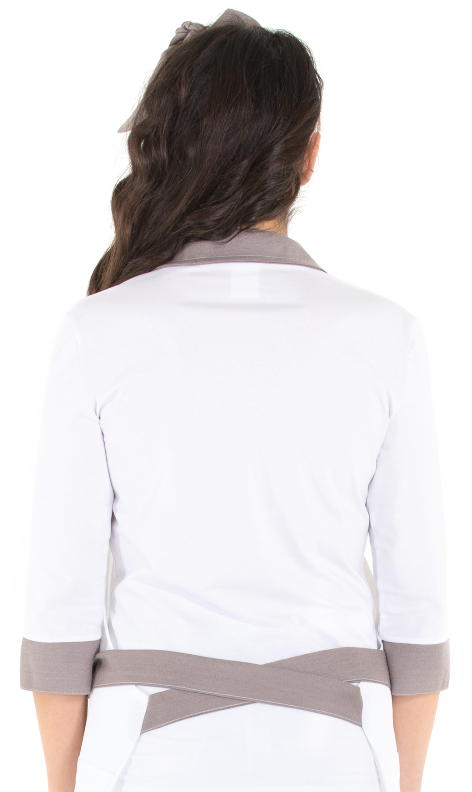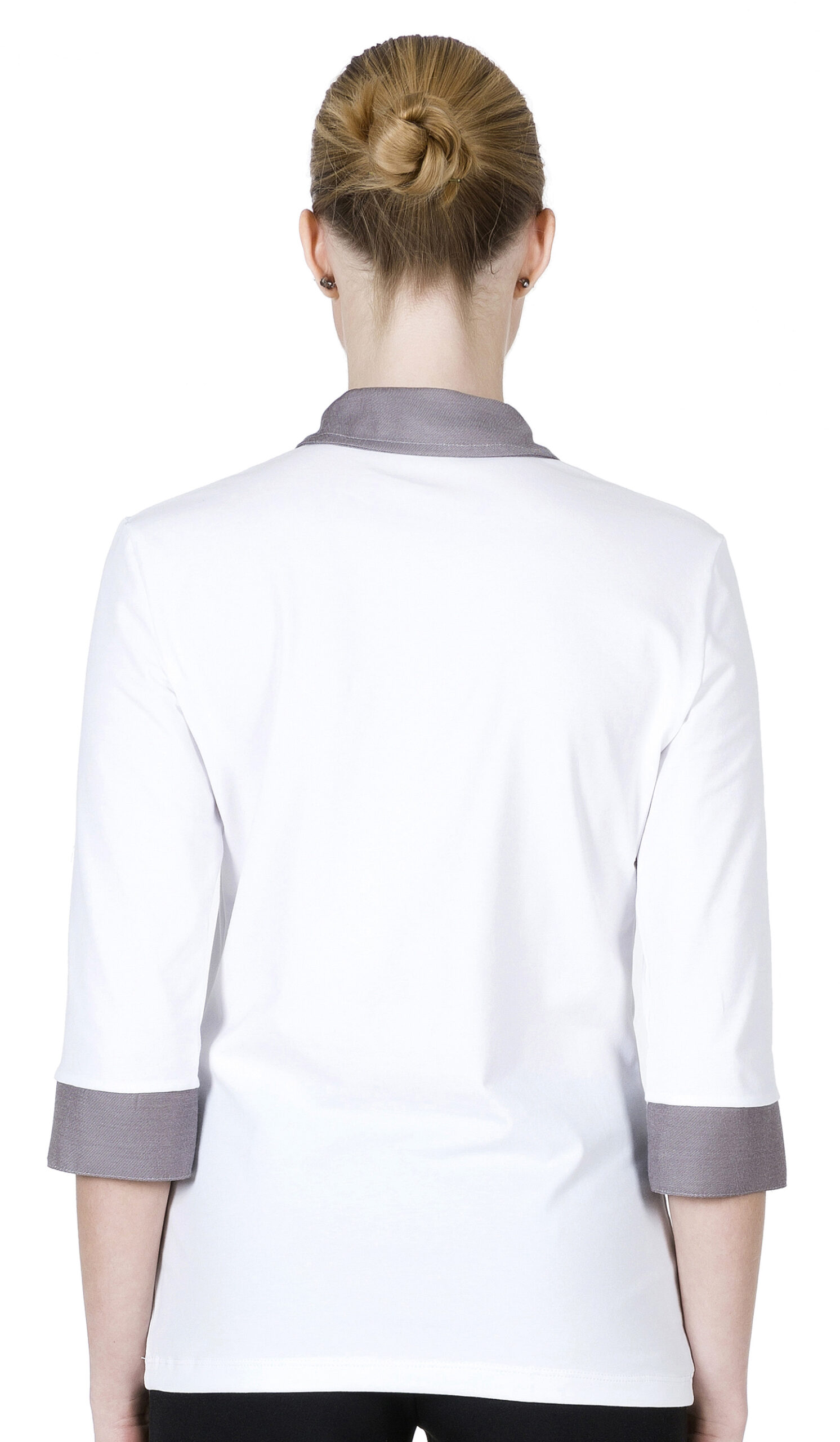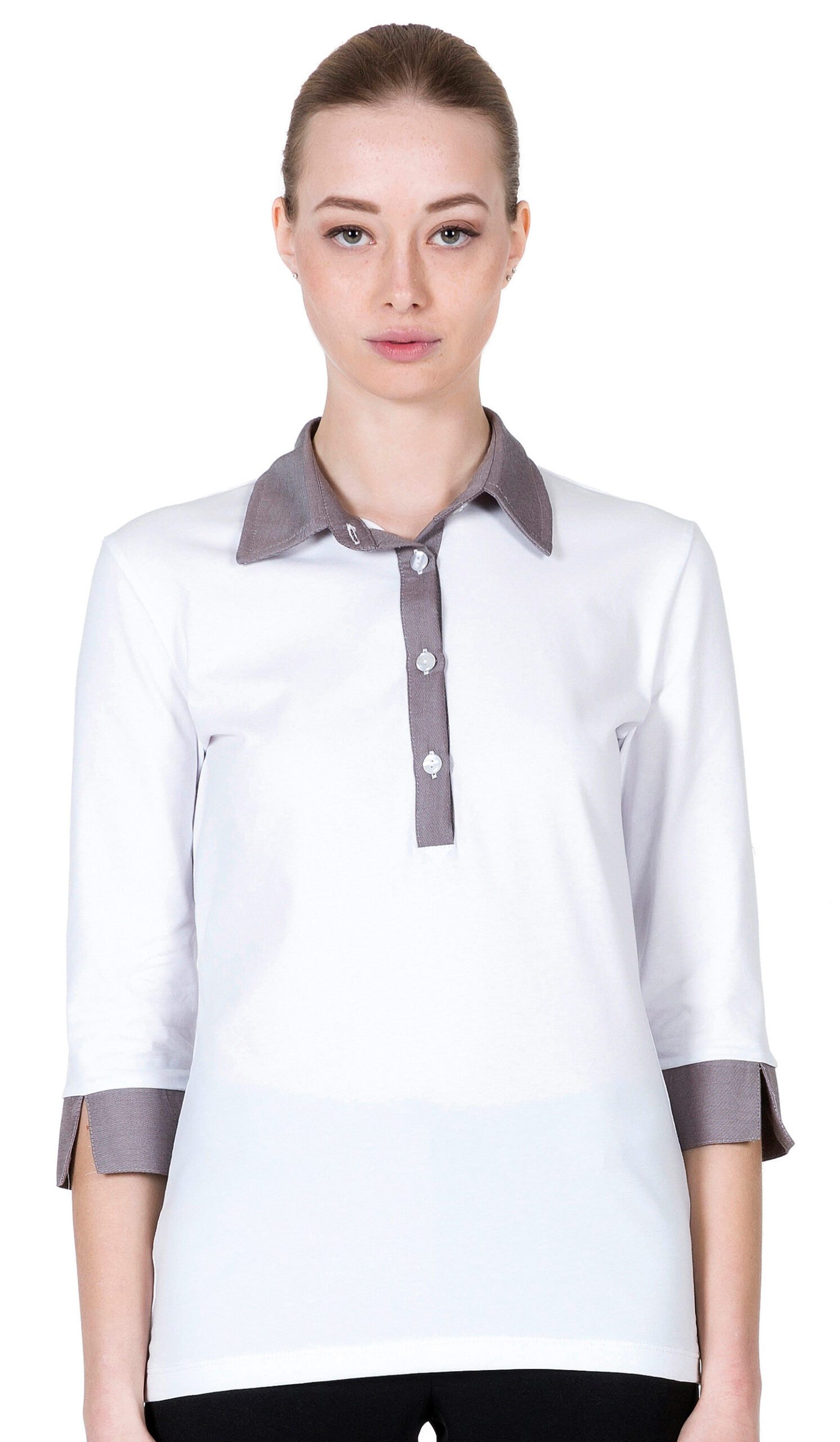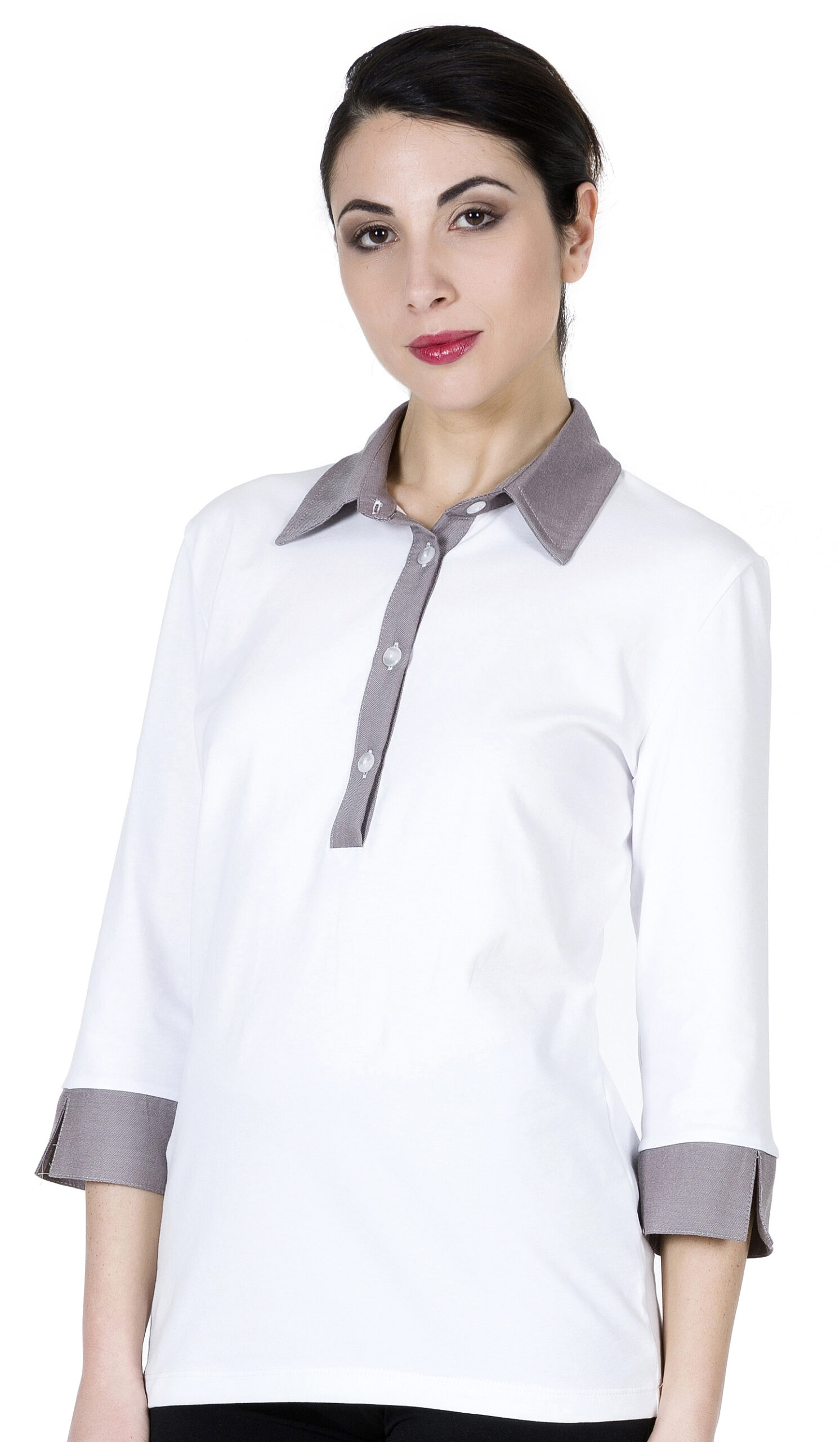In 100% Jersey cotone/elast., Manica 3/4, collo a camicia e apertura in contrasto