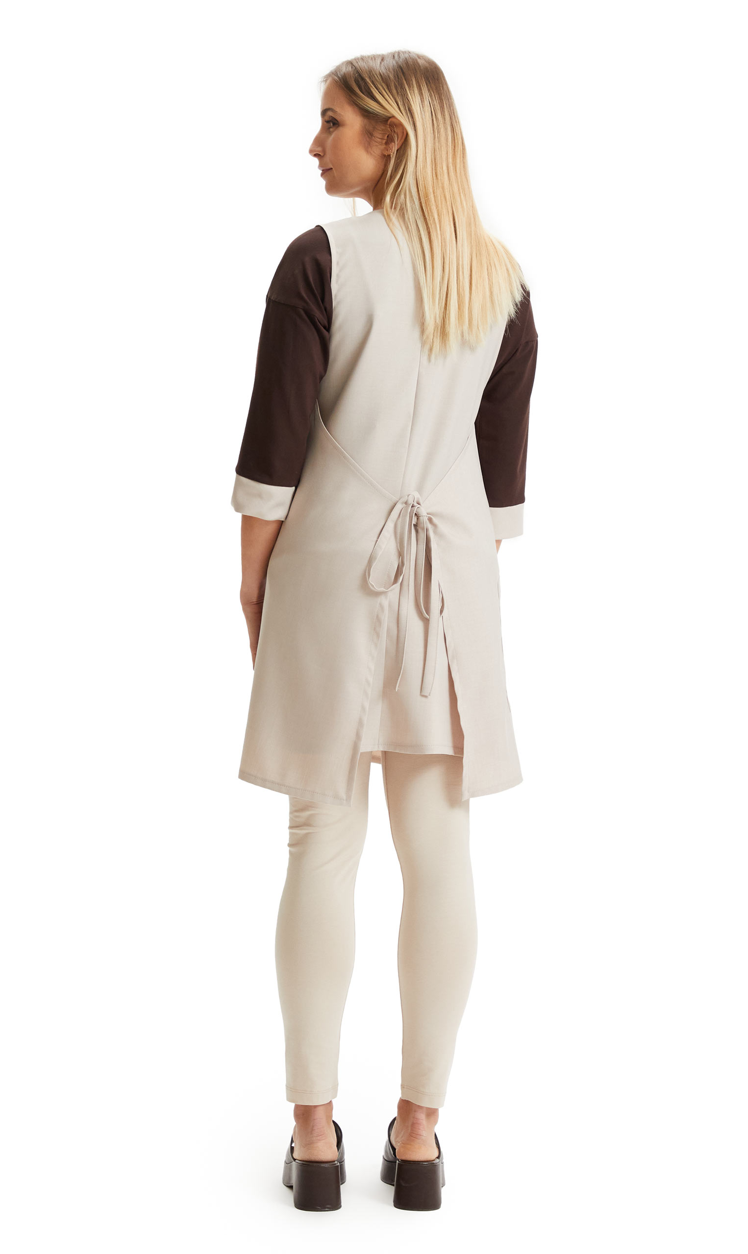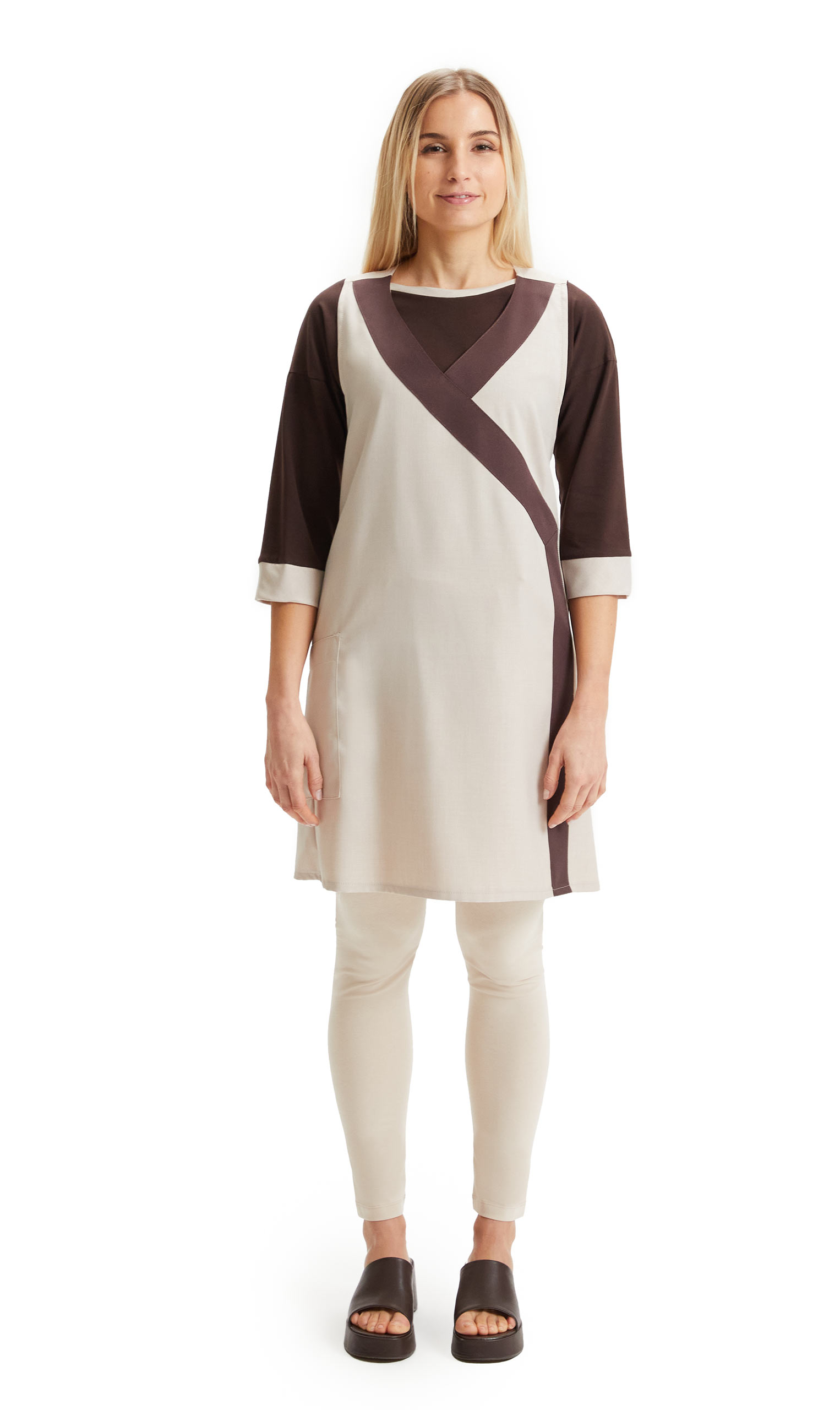 In 100% Poliestere 330gr/mq, modello incrociato aperto sui lati, una tasca laterale con bordatura in contrasto dal petto al fondo
