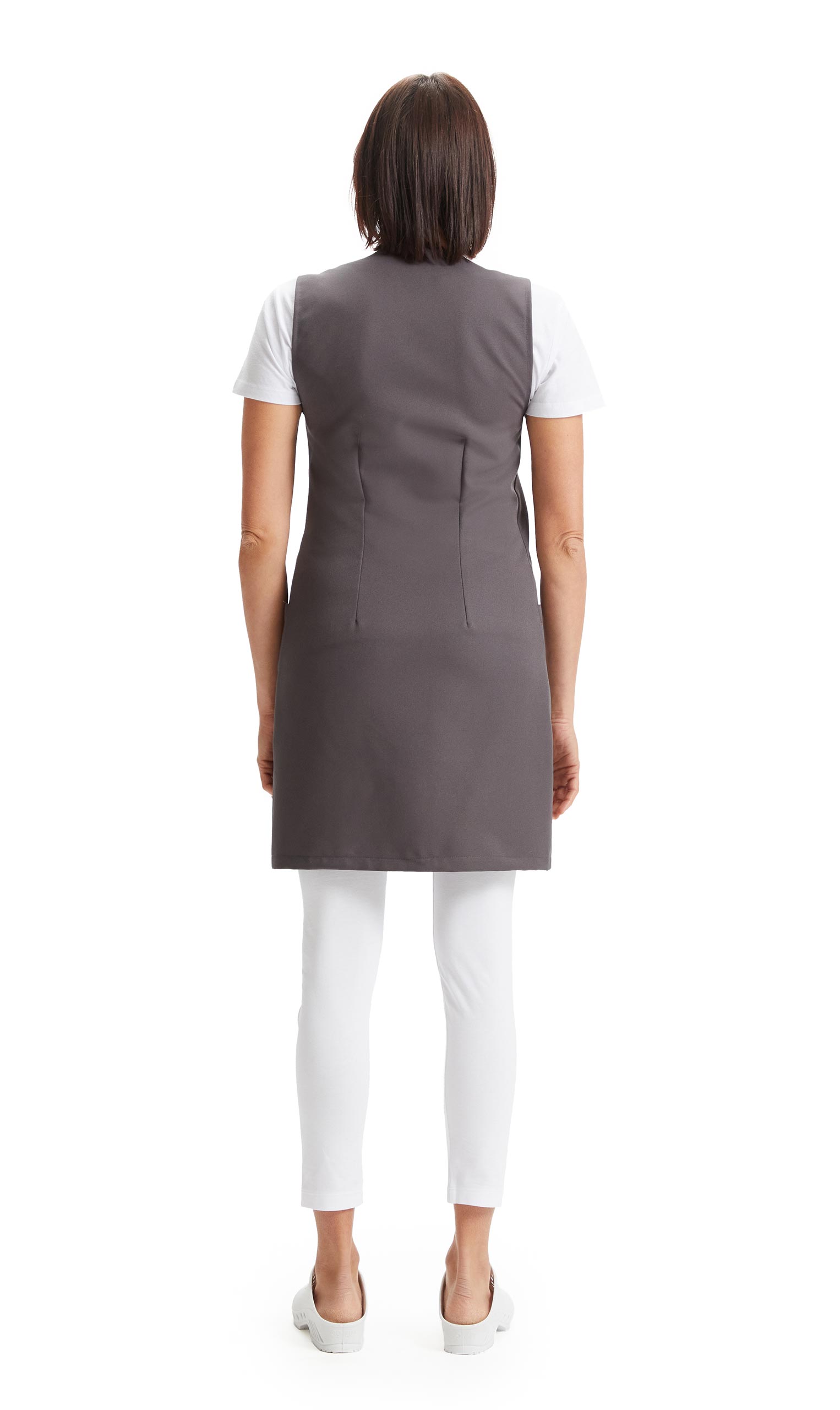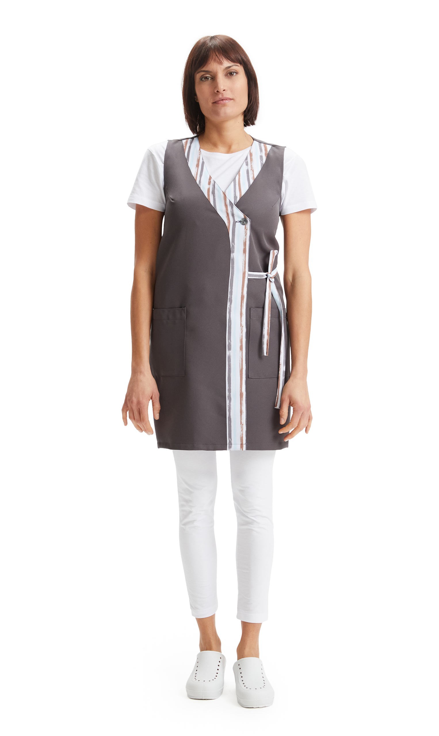 In 100% poliestere, peso 330 gr/mq., chiuso ai lati, allacciato con un bottone e un laccetto, bicolore dalla spalla al fondo, due tasche