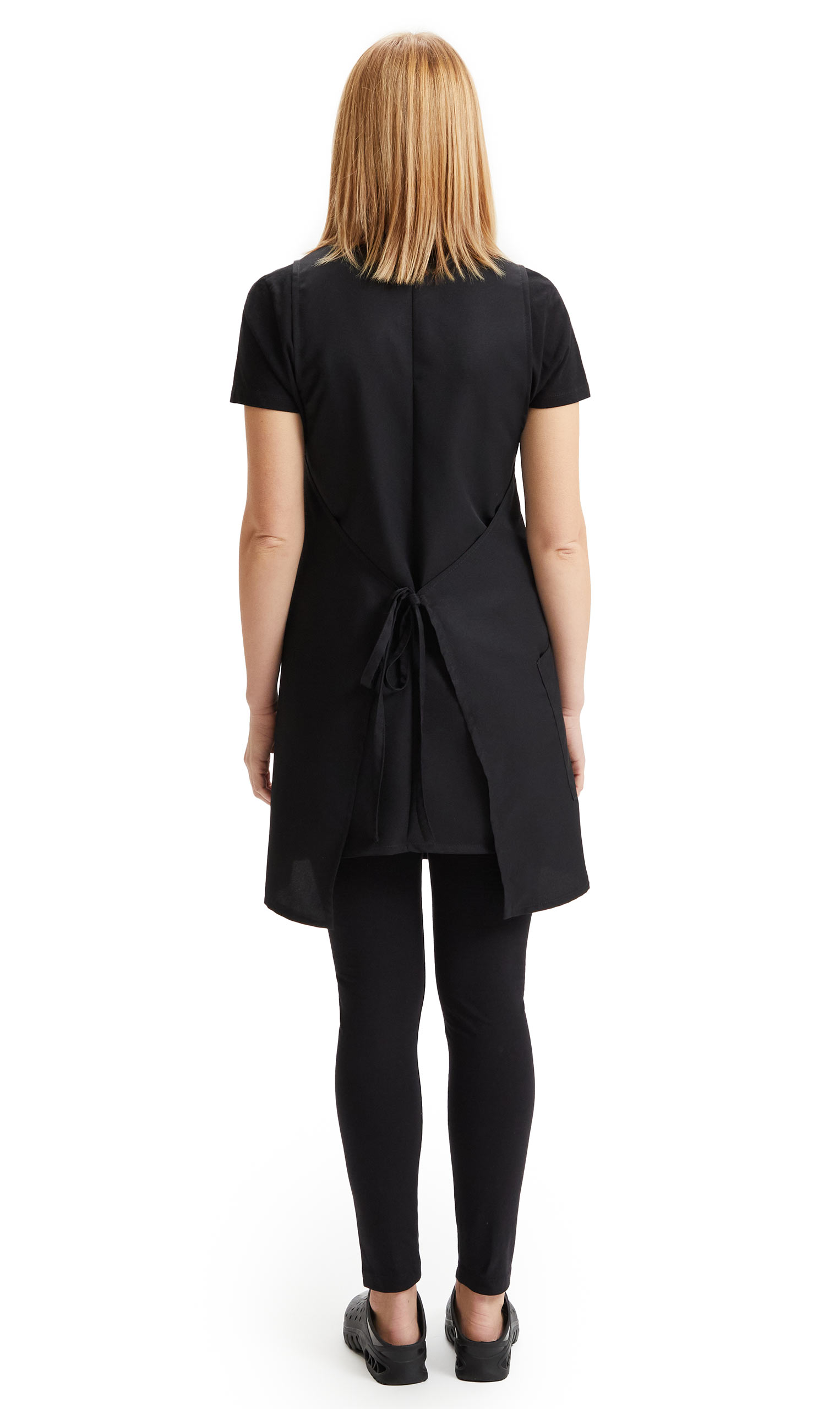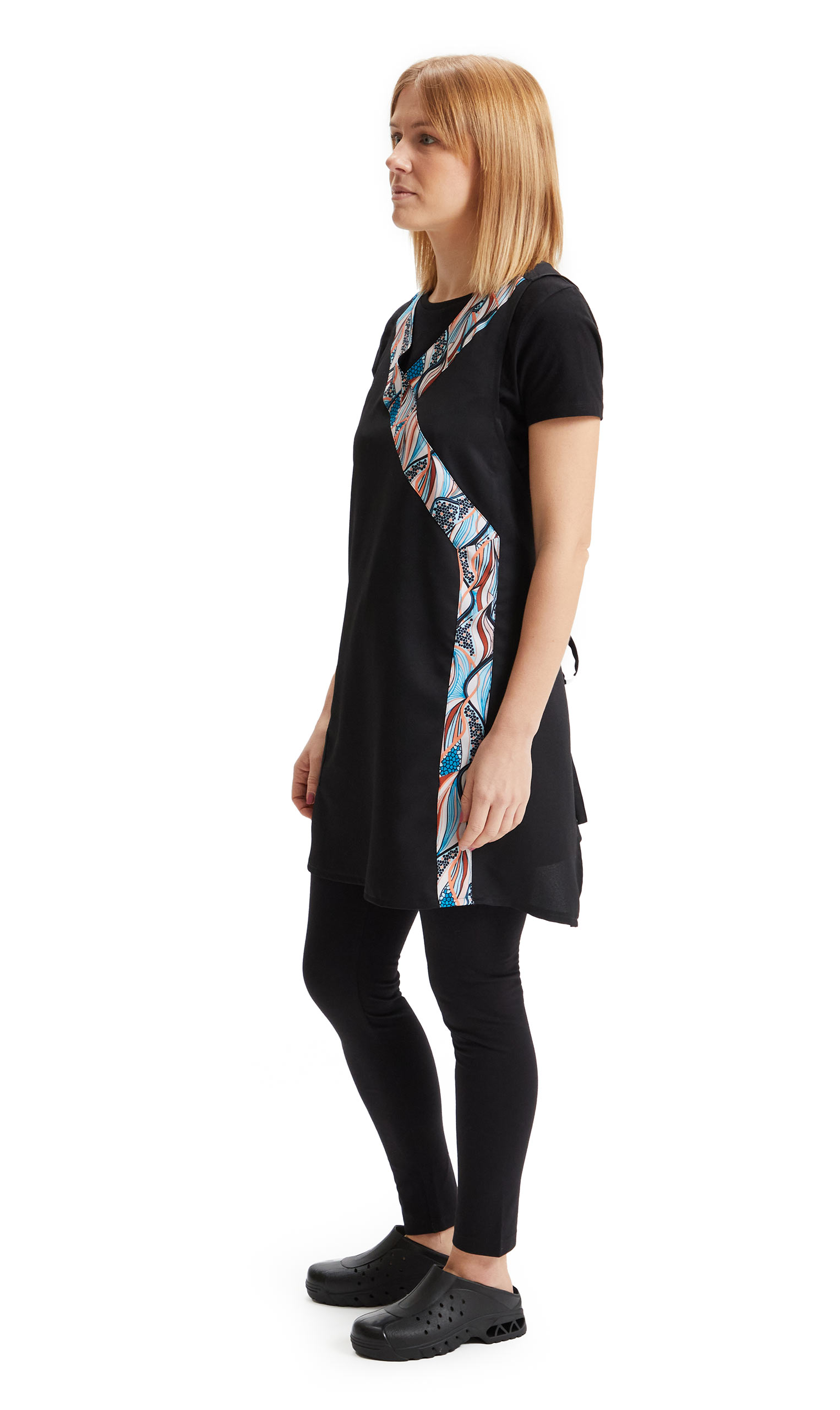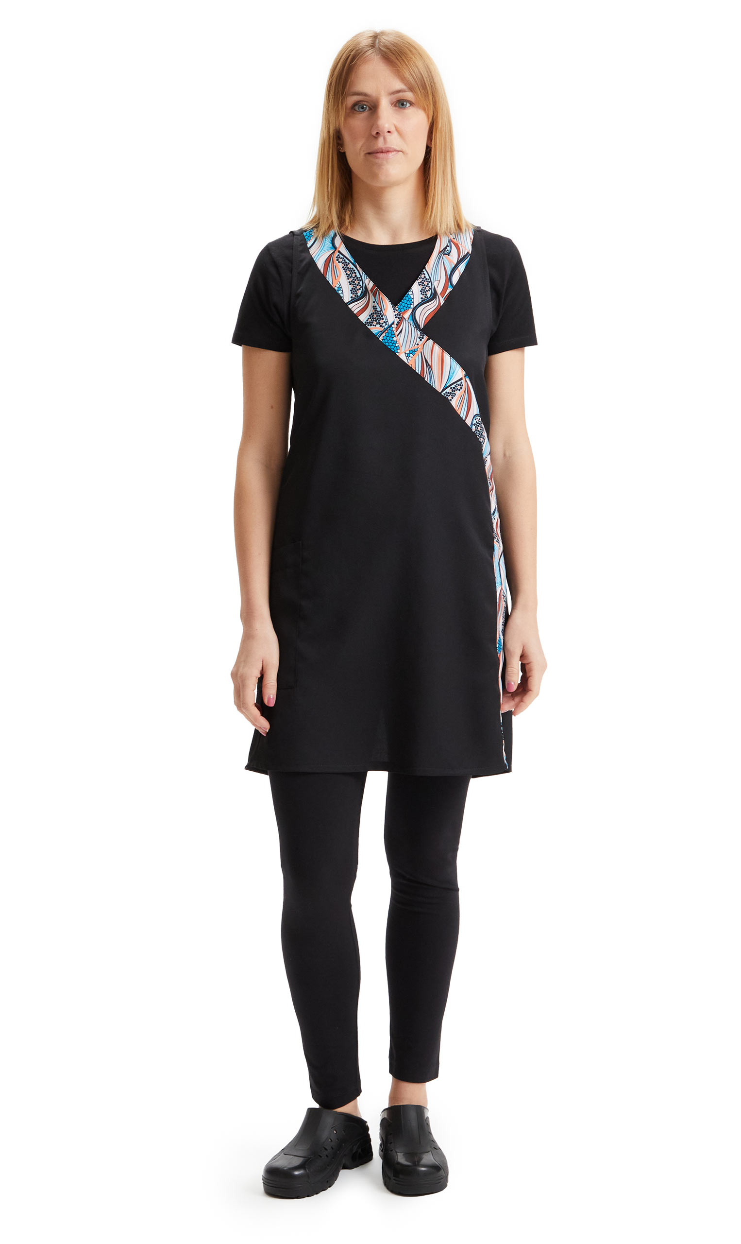 In 100% Natura® Poliester Stretch 170 gr/mq, modello incrociato aperto sui lati, una tasca laterale con bordatura in contrasto dal petto al fondo