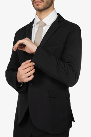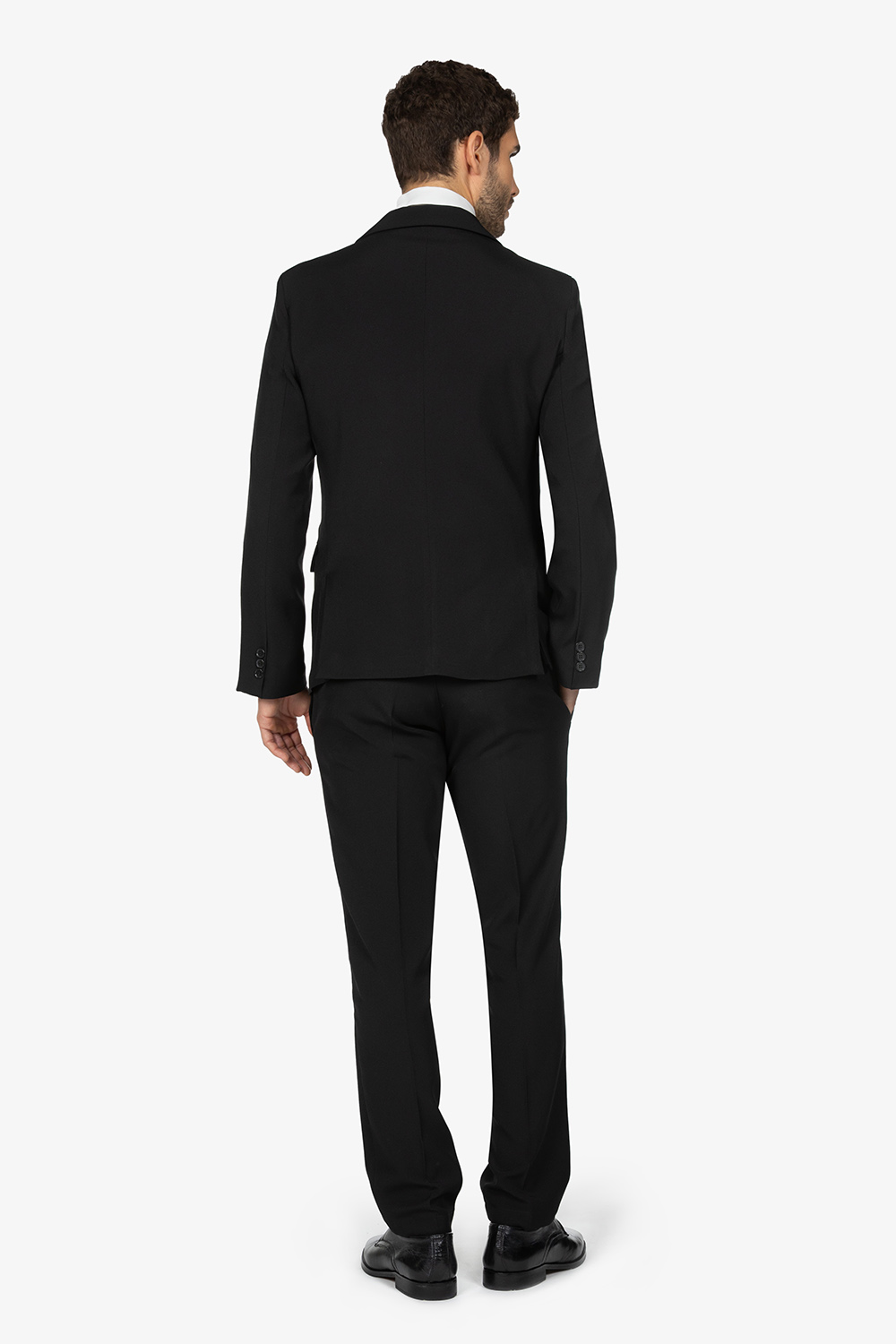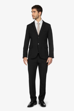 Giacca nera con fodera in tinta. Collo rever. Allacciatura con due bottoni. Tre bottoncini ai polsi. Tasche a pattina. Taschino sul petto. Due spacchetti sul retro. Vestibilità slim.