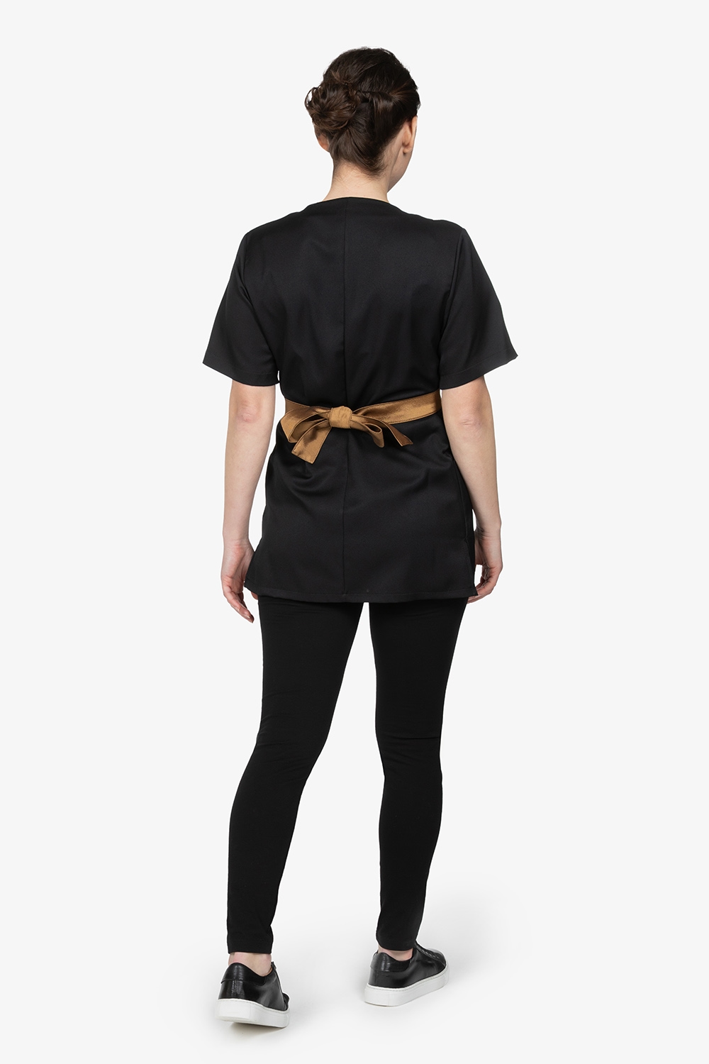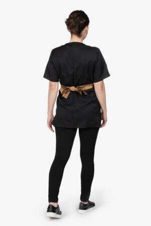 Kimono nero a chiusura incrociata con asola esterna. Mezza manica. Due tasche. Fusciacca in contrasto colore con chiusura regolabile a fiocco. Vestibilità regular.