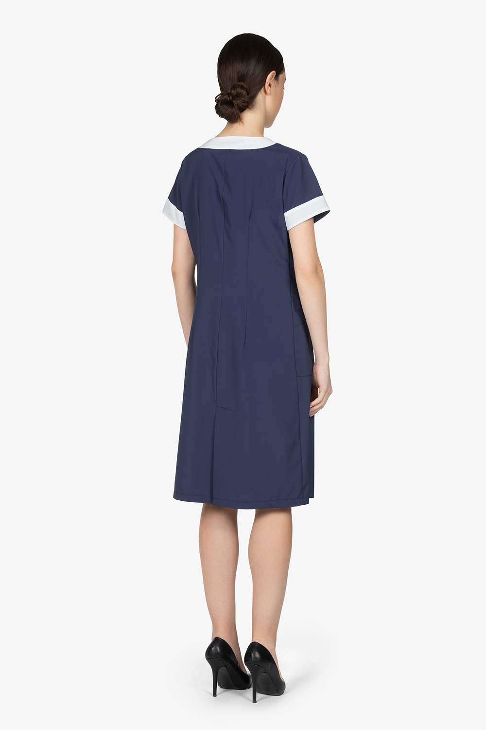 Camice ai piani, in blu, con dettagli in contrasto colore. Scollo a barca. Tasche laterali. Abbottonatura centrale a mezzo busto. Vestibilità regular.