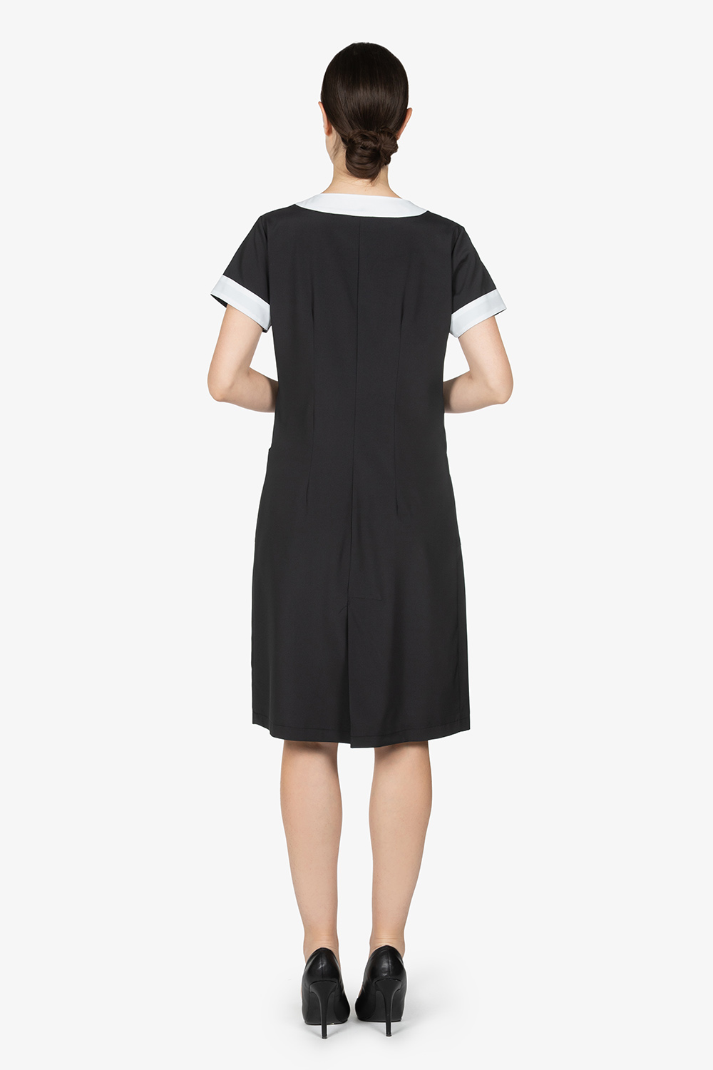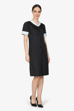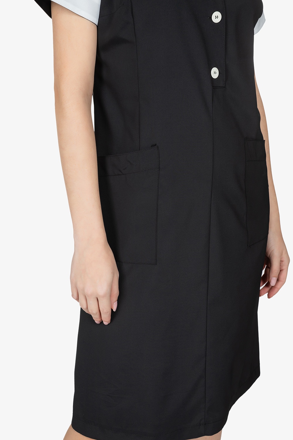 Camice ai piani, in nero, con dettagli in contrasto colore. Scollo a barca. Tasche laterali. Abbottonatura centrale a mezzo busto. Vestibilità regular.