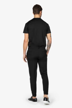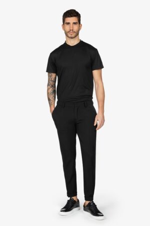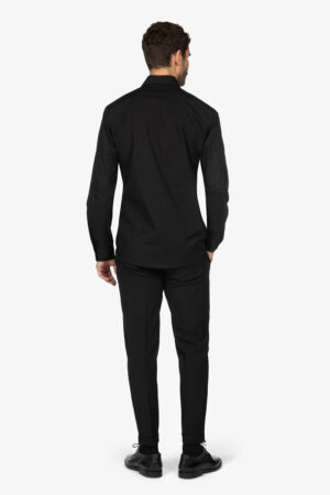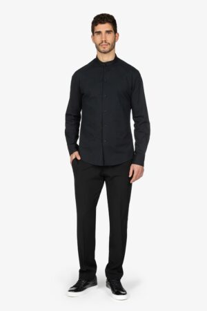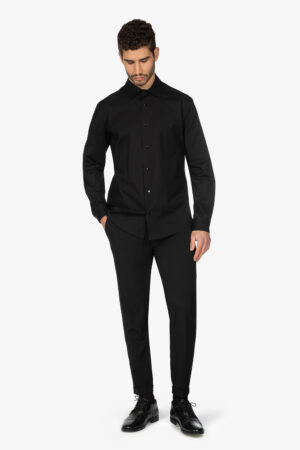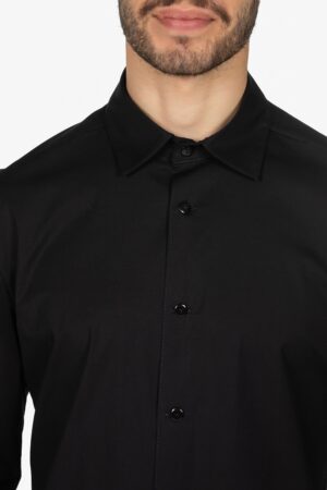 Camicia nera con colletto a vela. Manica lunga. Leggermente sfiancata. Vestibilità regular.