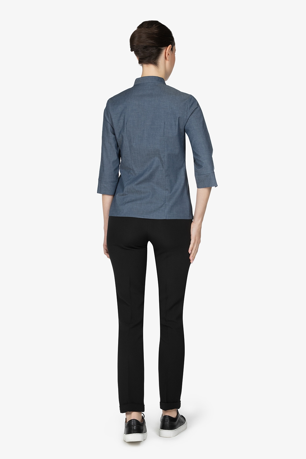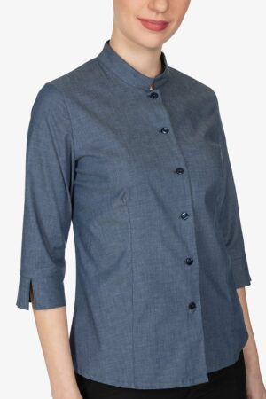 Camicia effetto “jeans” con colletto alla coreana. Pinces. Manica a 3/4. Vestibilità slim.
