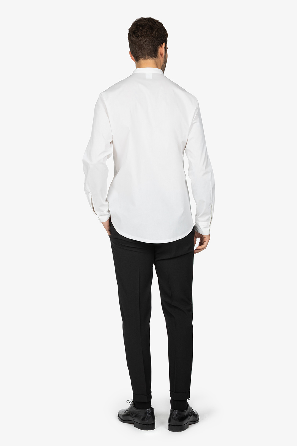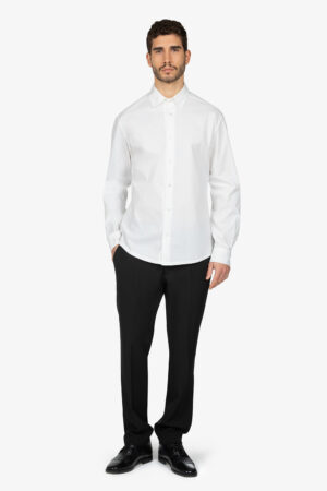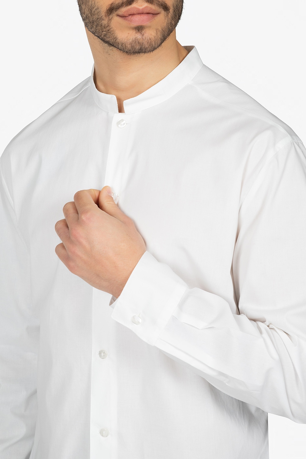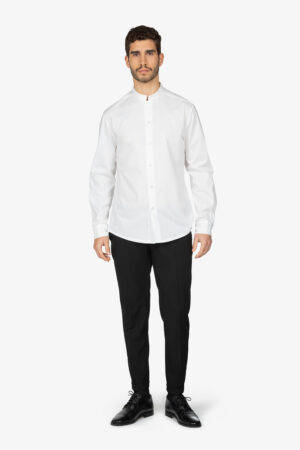 Camicia bianca con colletto alla coreana. Manica lunga. Leggermente sfiancata. Vestibilità regular.