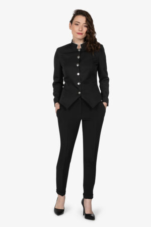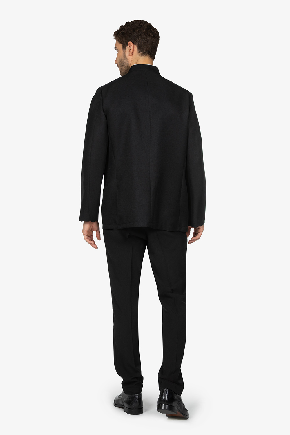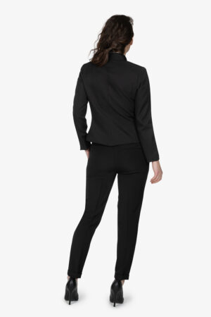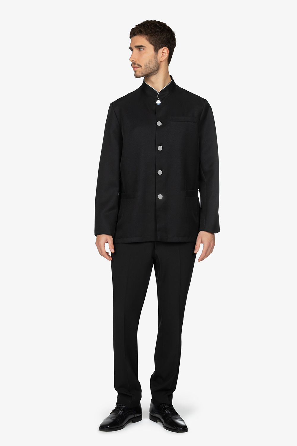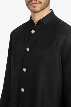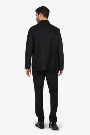 Giacca nera, sfoderata, con tasche e taschino sul petto. Bottoni e filetto a bordo collo in contrasto colore. Vestibilità regular.