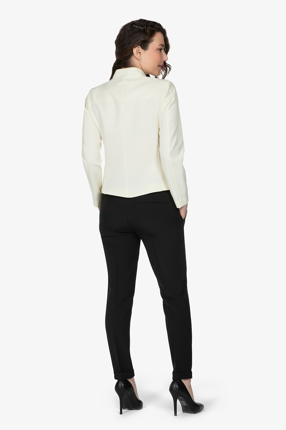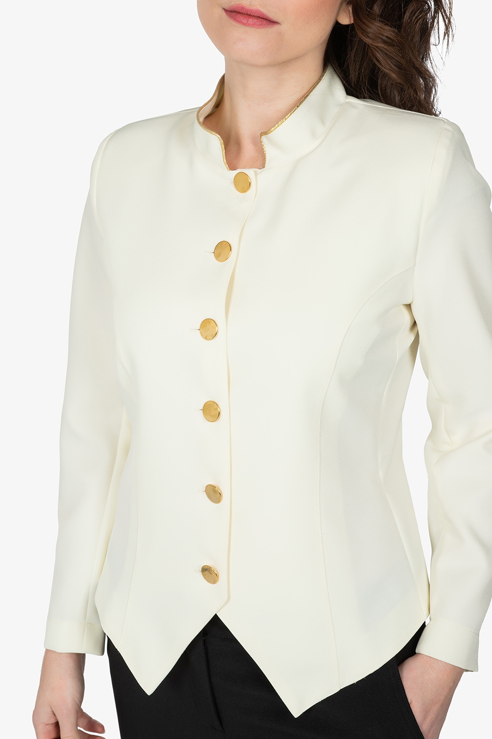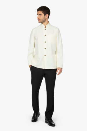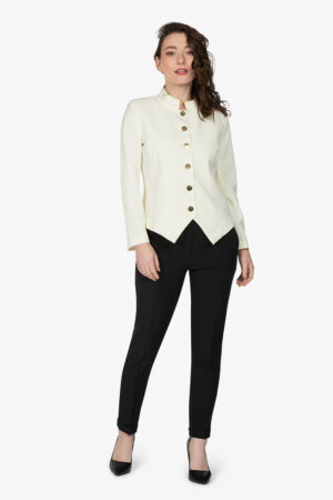 Spenser panna, sfoderato, con colletto alla coreana. Taglio sfiancato. Bottoni e filetto in contrasto colore. Senza tasche. Vestibilità slim.