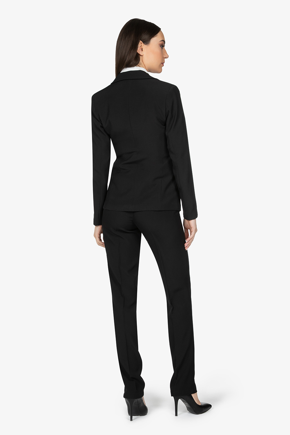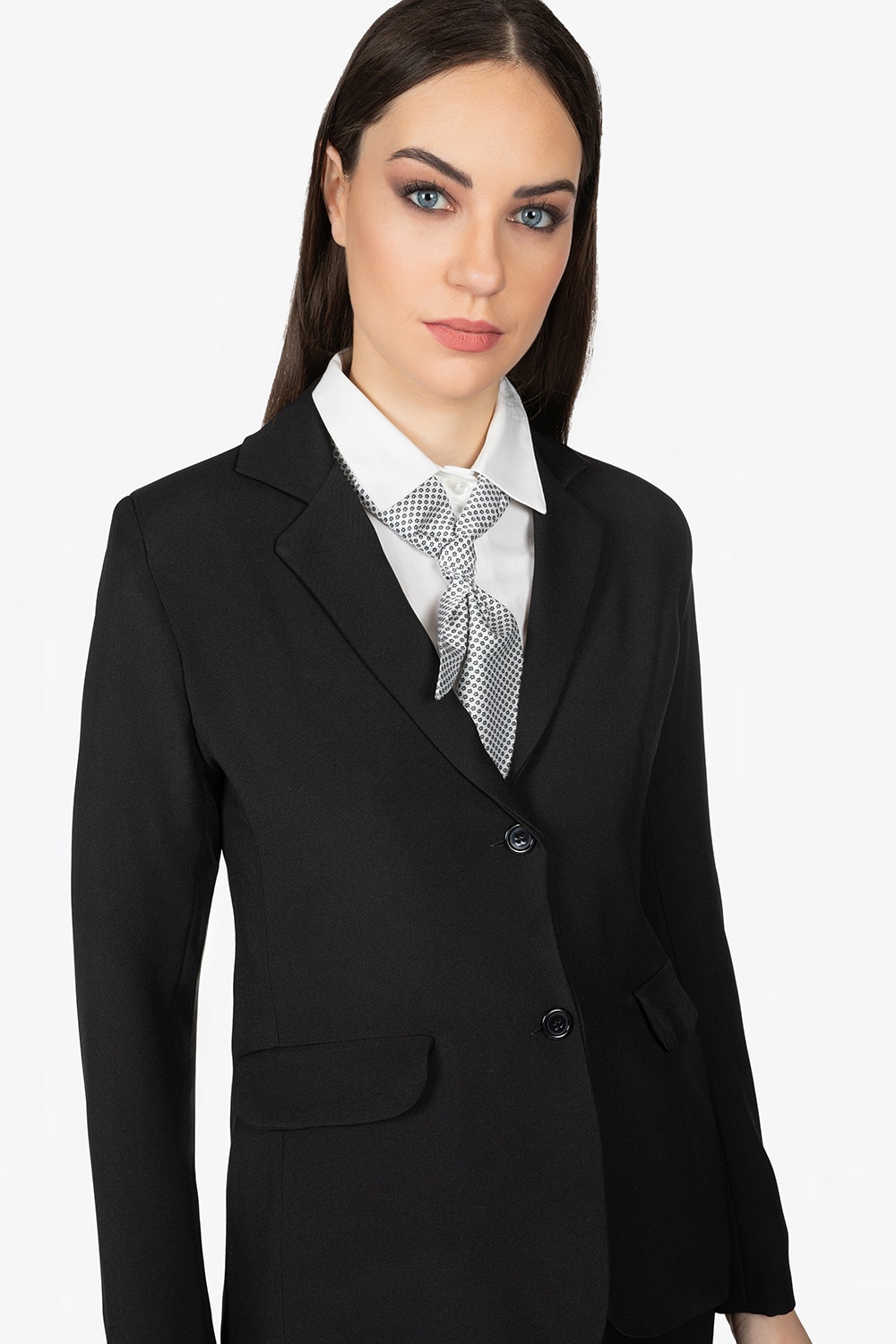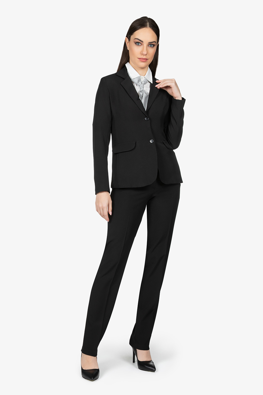 Giacca nera con fodera in tinta unita. Due tasche a pattina. Vestibilità slim.