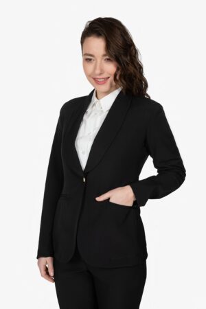 PROMENADE, la giacca classica ed elegante, perfetta per ogni tipologia di attività che vuole dare quel tocco di eleganza in più al suo personale: dai ristoranti di lusso ai bistrot accoglienti. La linea morbida e dritta è accompagnata da un collo a scialle decorato con un bottone centrale a contrasto… decisamente intramontabile.
