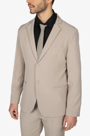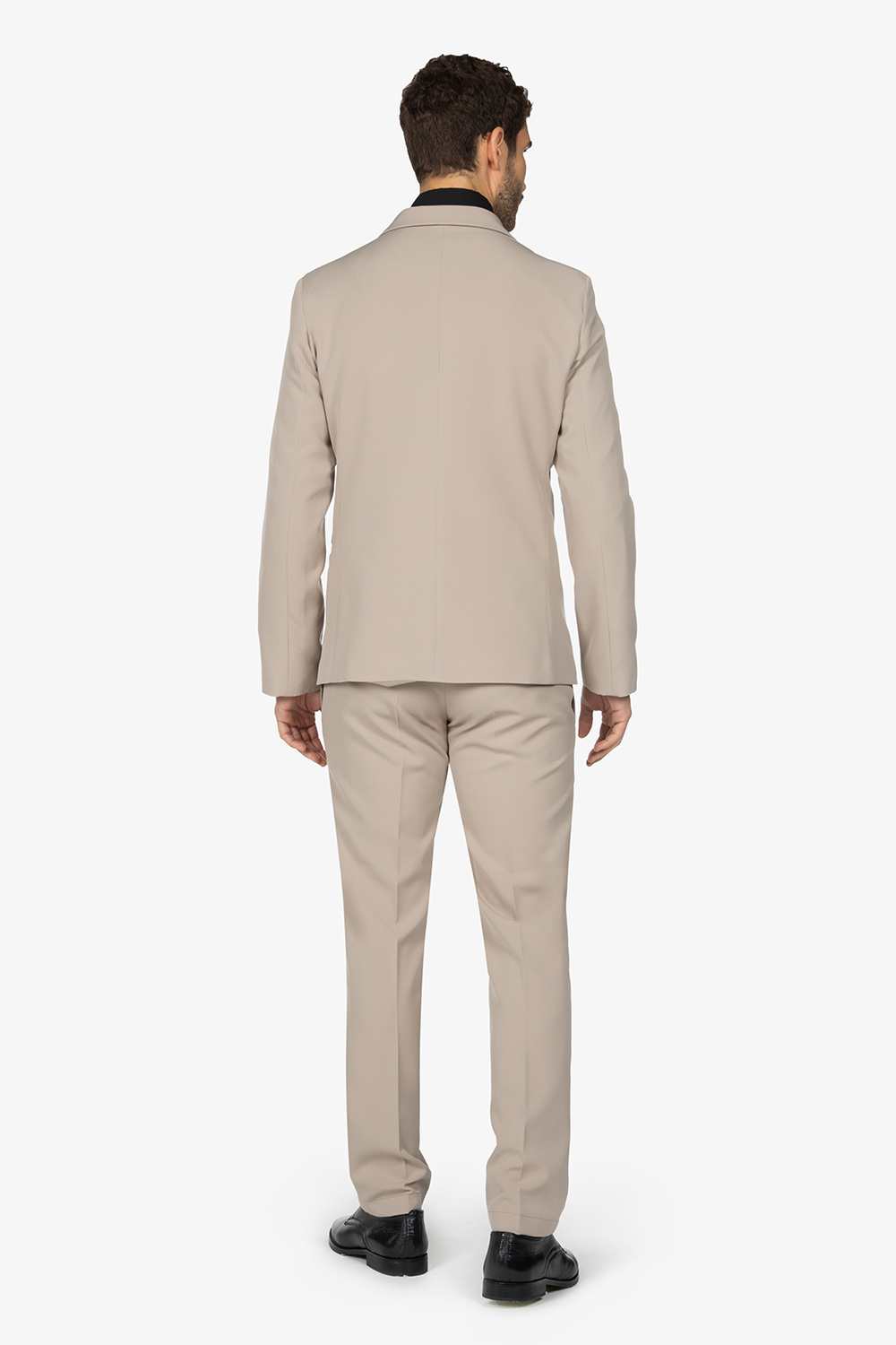 Giacca beige con fodera in tinta. Collo rever. Allacciatura con due bottoni. Due tasche a filetto. Taschino sul petto. Vestibilità slim.