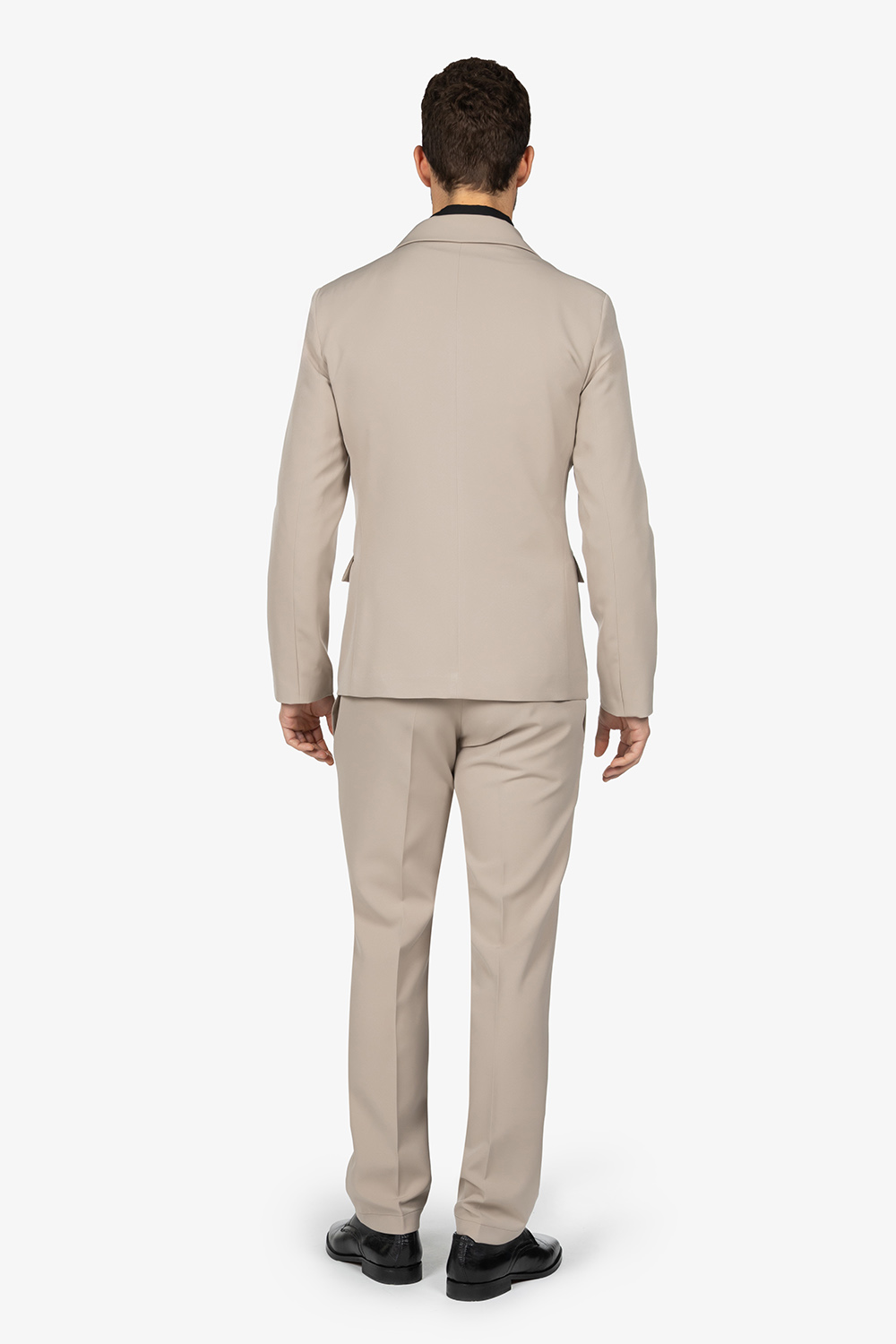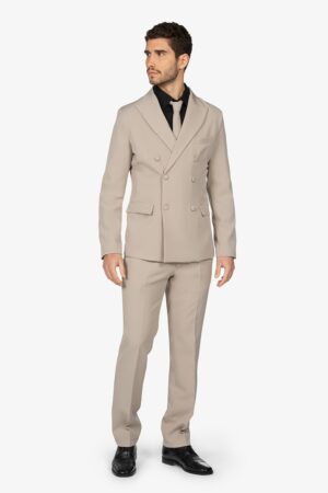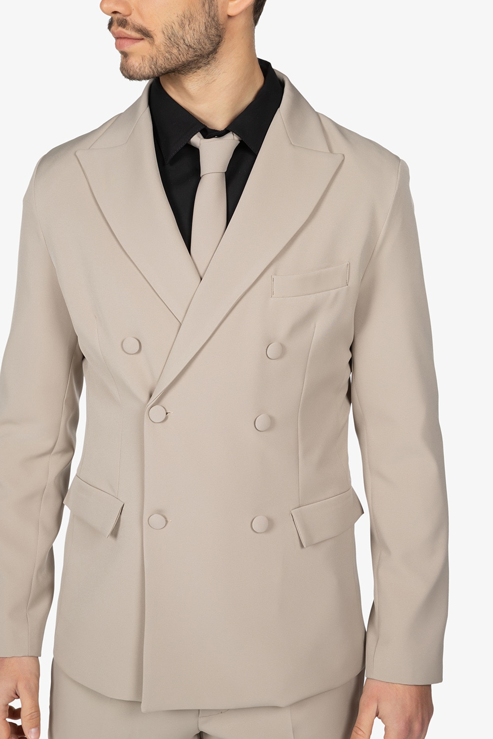 Giacca foderata con doppio petto. Bottoni in tessuto (3 di chiusura e 3 decorativi). Due tasche a pattina. Un taschino sul petto. Vestibilità slim.