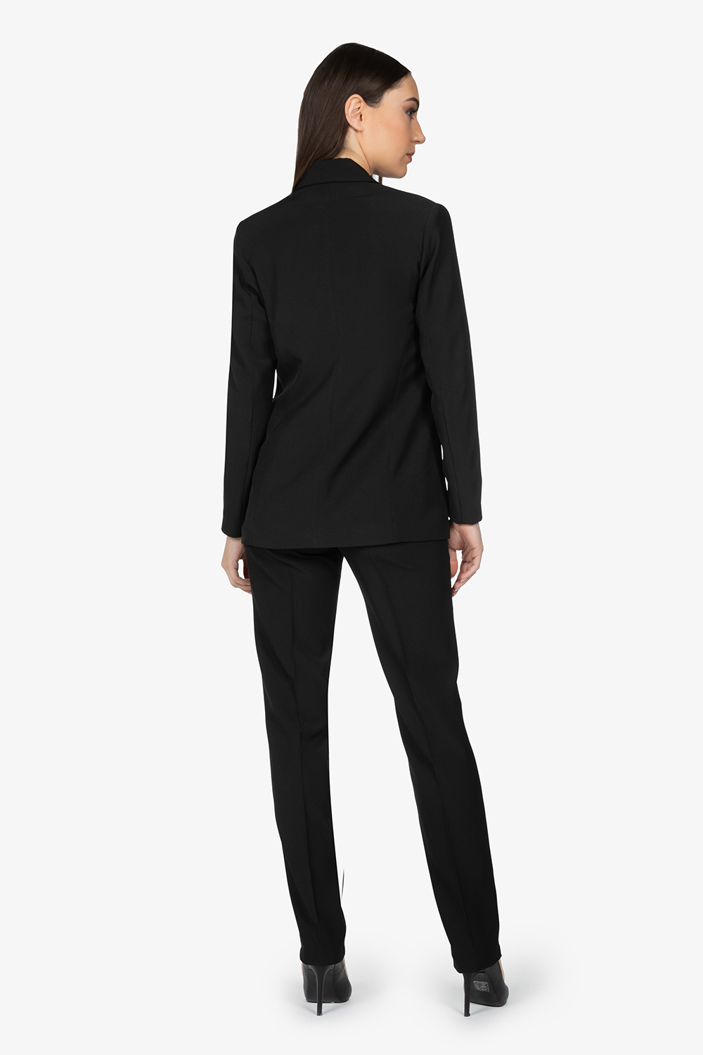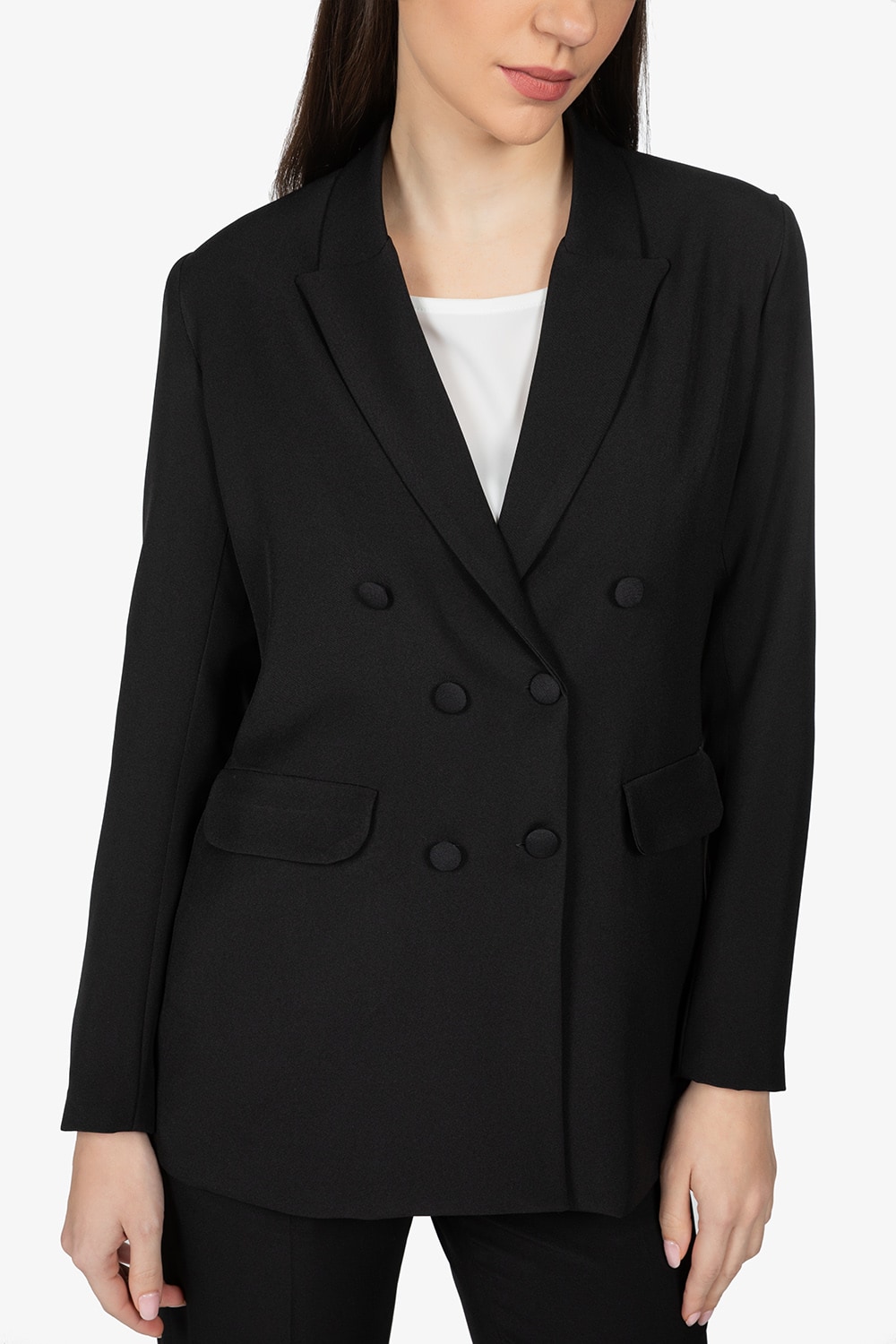 Giacca nera, foderata, con doppio petto. Bottoni in tessuto , 3 di chiusura e 4 decorativi. Due tasche a pattina. Vestibilità slim.