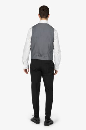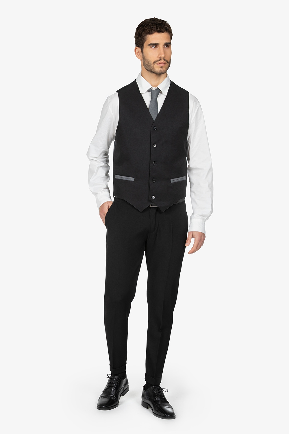 Gilet bicolore sui toni del nero, foderato. Scollo a V. Chiusura con 4 bottoni. Schiena, fibbia posteriore e tasche a filetto in contrasto colore. Vestibilità regular.