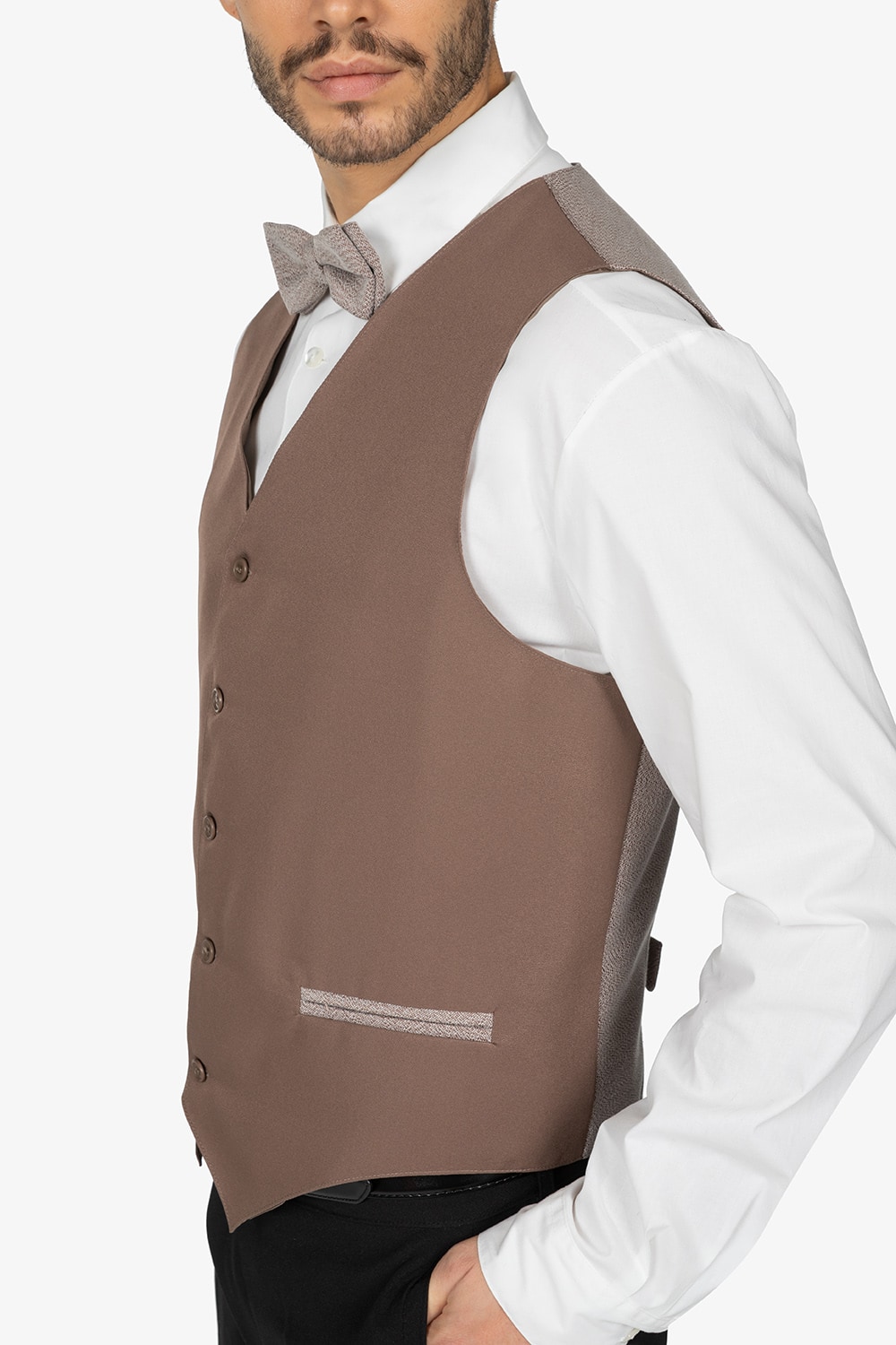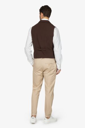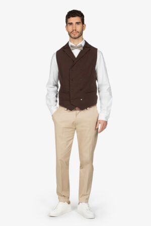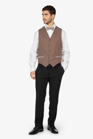 Gilet bicolore sui toni del tortora, foderato. Scollo a V. Chiusura con 4 bottoni. Schiena, fibbia posteriore e tasche a filetto in contrasto colore. Vestibilità regular.