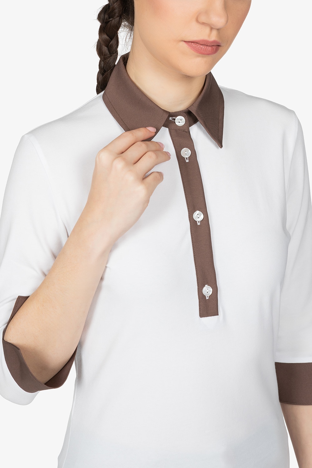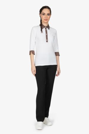 Polo con colletto a vela in contrasto colore. Manica a 3/4. Chiusura con 4 bottoni. Vestibilità regular.