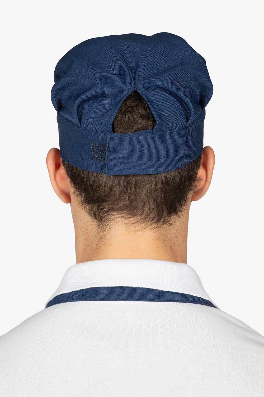 Berretto blu con chiusura posteriore regolabile con velcro. Visiera semi-rigida.
