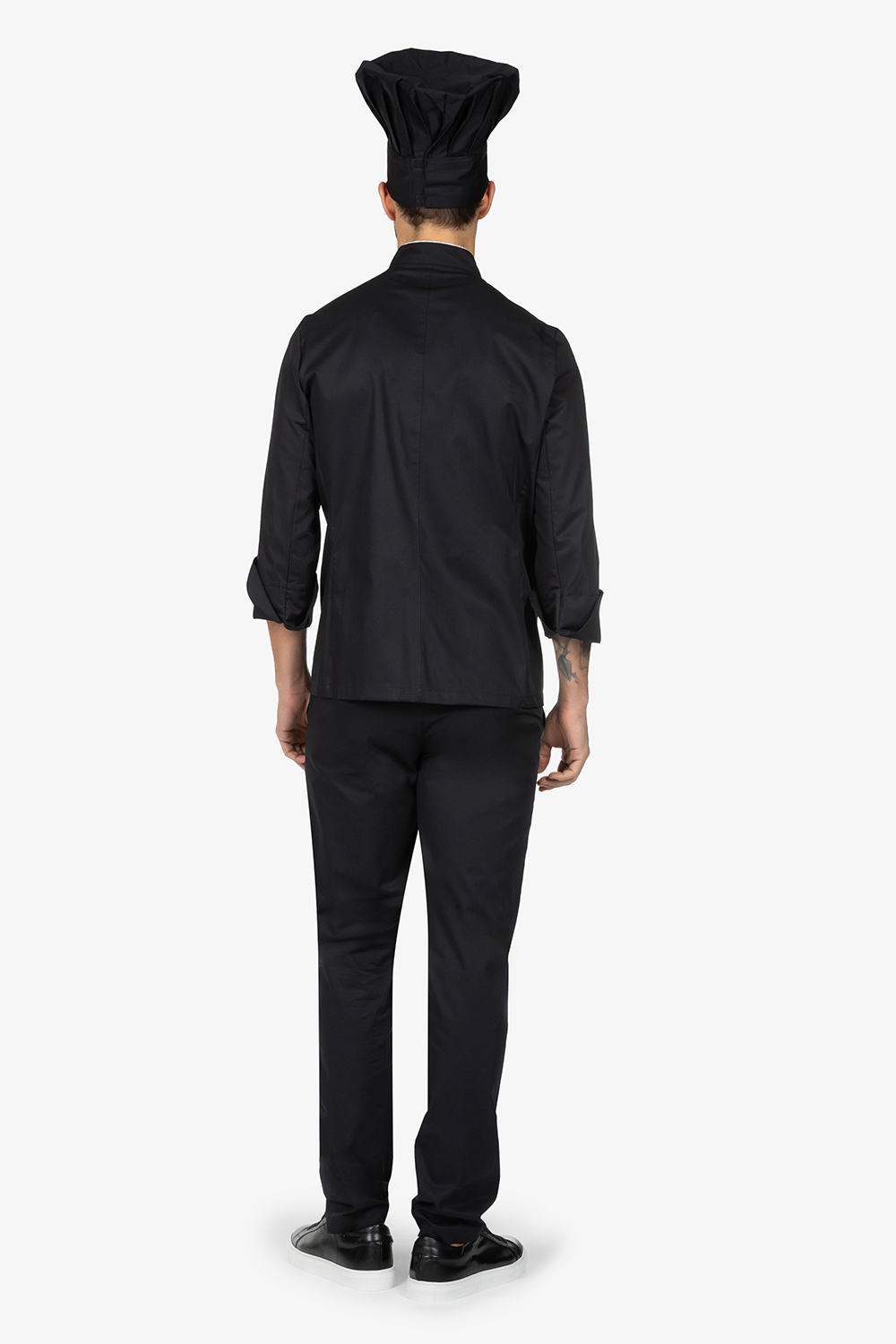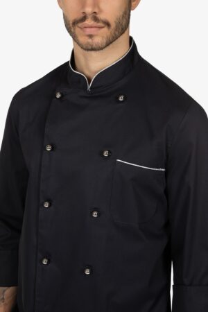 Giacca da chef con colletto alla coreana. Doppio petto con bottoni estraibili. Manica lunga risvoltata. Taschino a toppa sul petto sinistro. Filetto in contrasto colore su taschino e collo. Vestibilità regular.