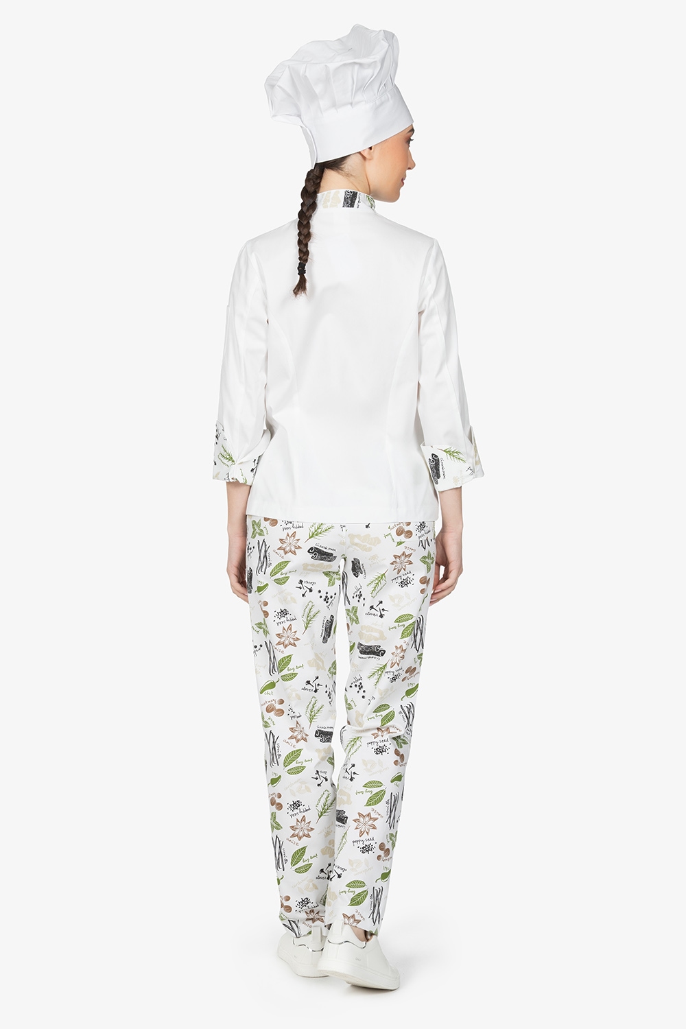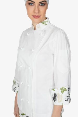 Giacca da chef con colletto alla coreana in contrasto colore. Doppio petto con bottoni estraibili. Manica lunga con risvolto in contrasto colore. Taschino su manica sinistra. Vestibilità regular.