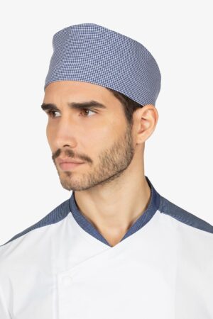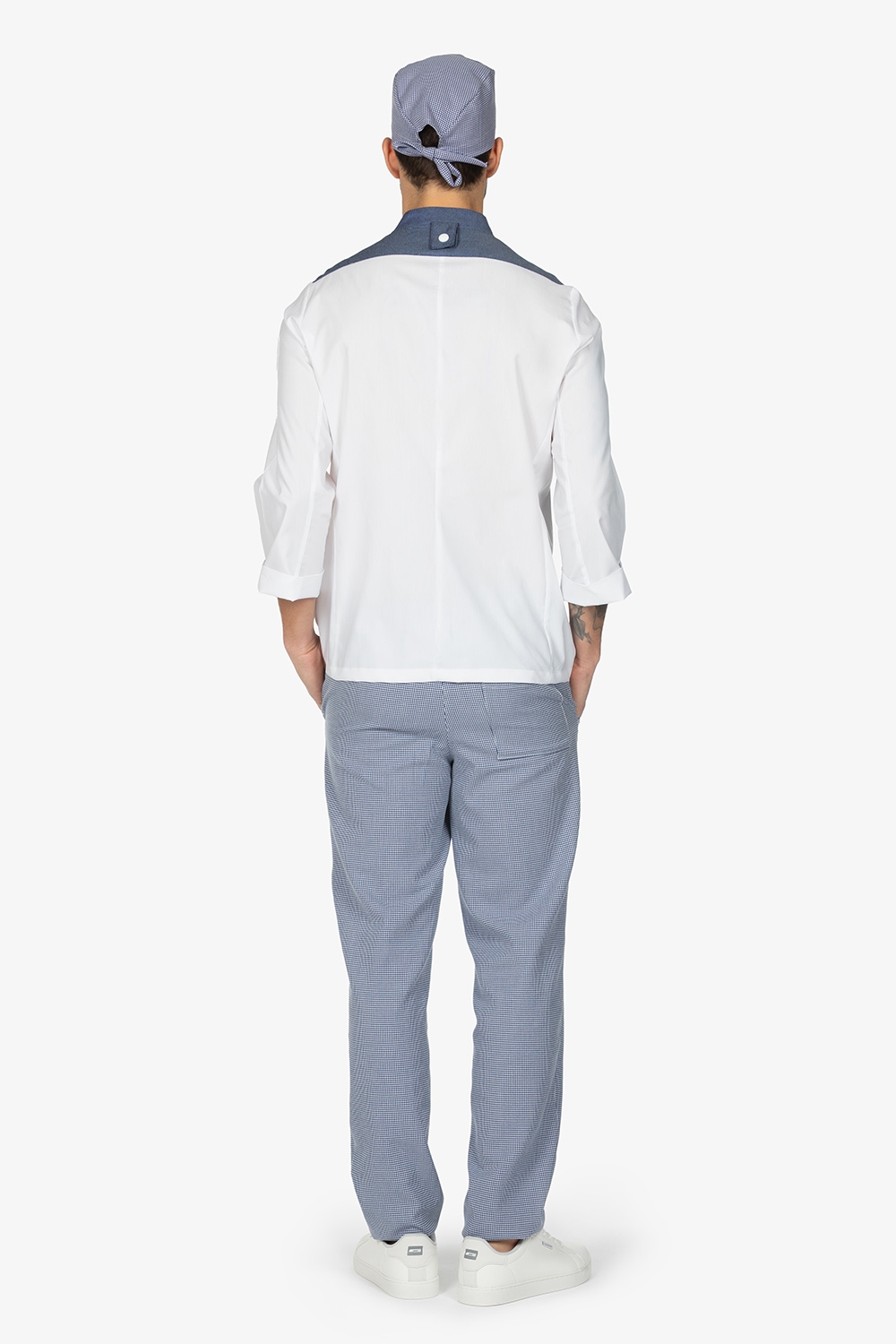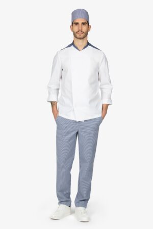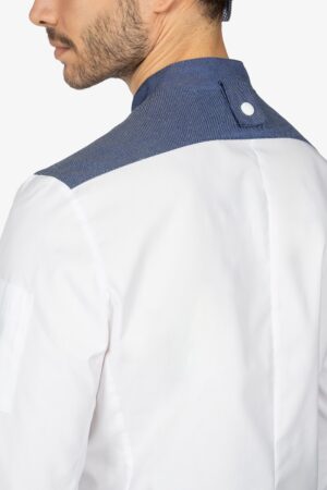 Giacca da chef con colletto alla coreana. Abbottonatura semi-nascosta con bottoni a pressione. Taschino su manica sinistra. Manica lunga risvoltata. Sprone spalla in effetto “jeans” con asola nel collo come ferma-grembiule. Vestibilità regular.