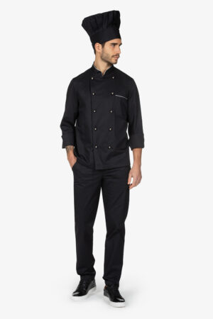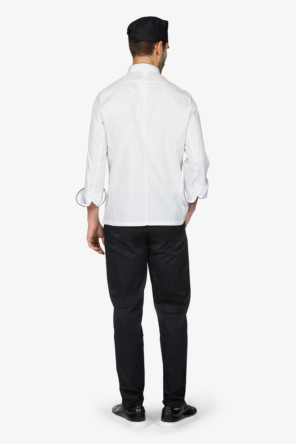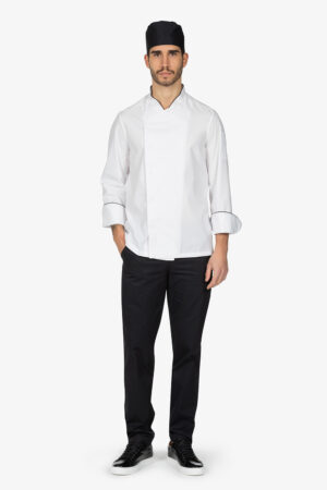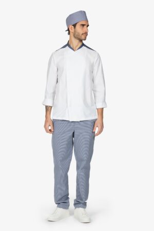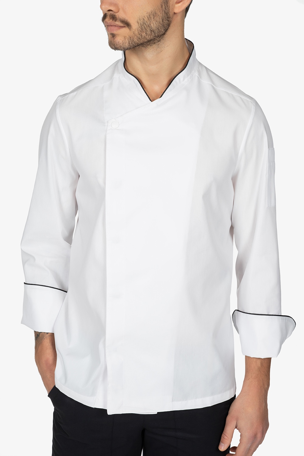Giacca da chef bianca con colletto alla coreana. Abbottonatura laterale semi-nascosta con bottoni a pressione. Manica lunga risvoltata. Taschino su manica sinistra. Filetto in contrasto colore su colletto e risvolto manica. Vestibilità regular.