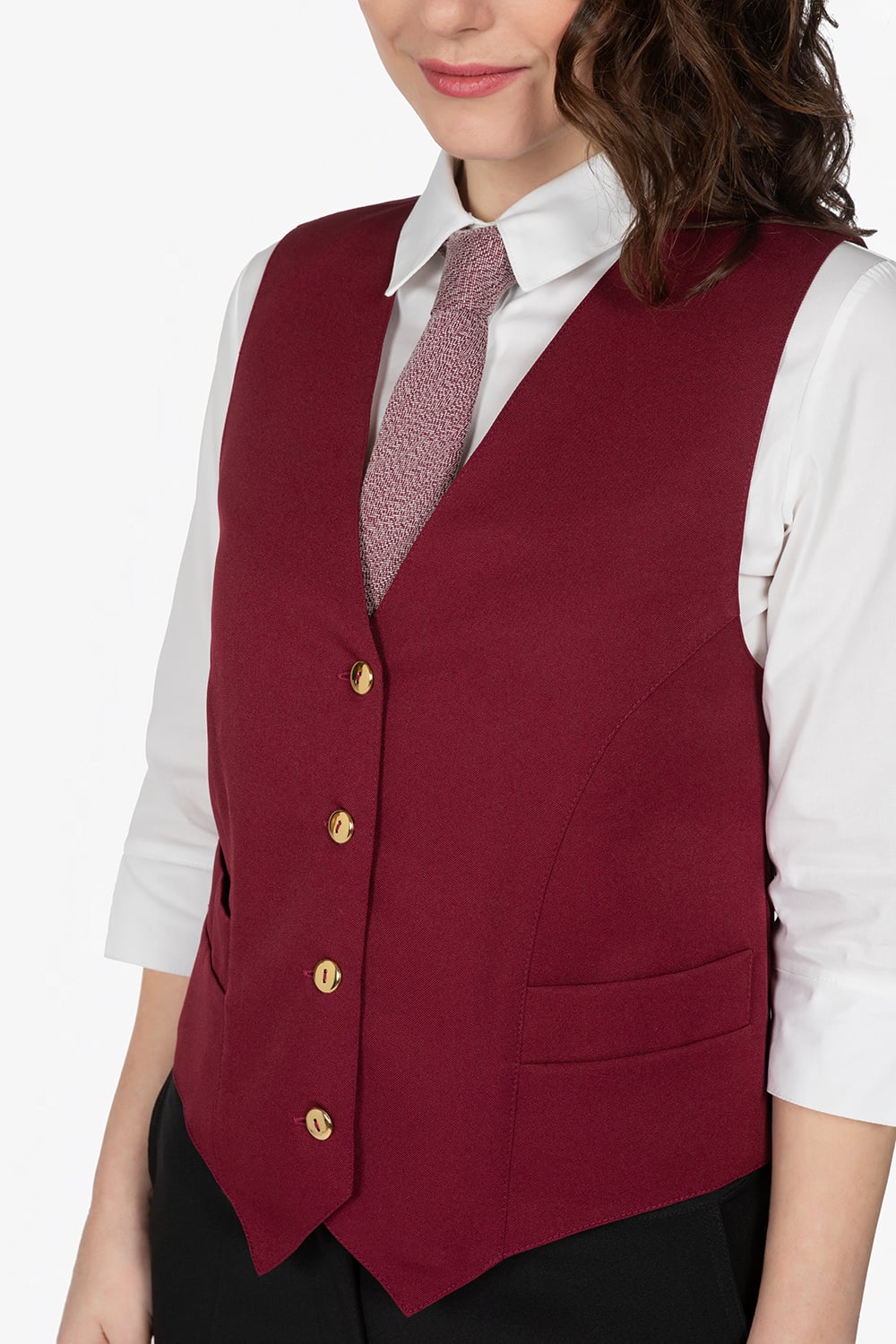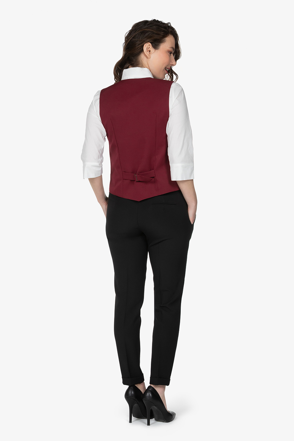 Gilet bordeaux, foderato. Scollo a V. Fibbia posteriore. Tasche a pattina. Quattro bottoni. Vestibilità regular.