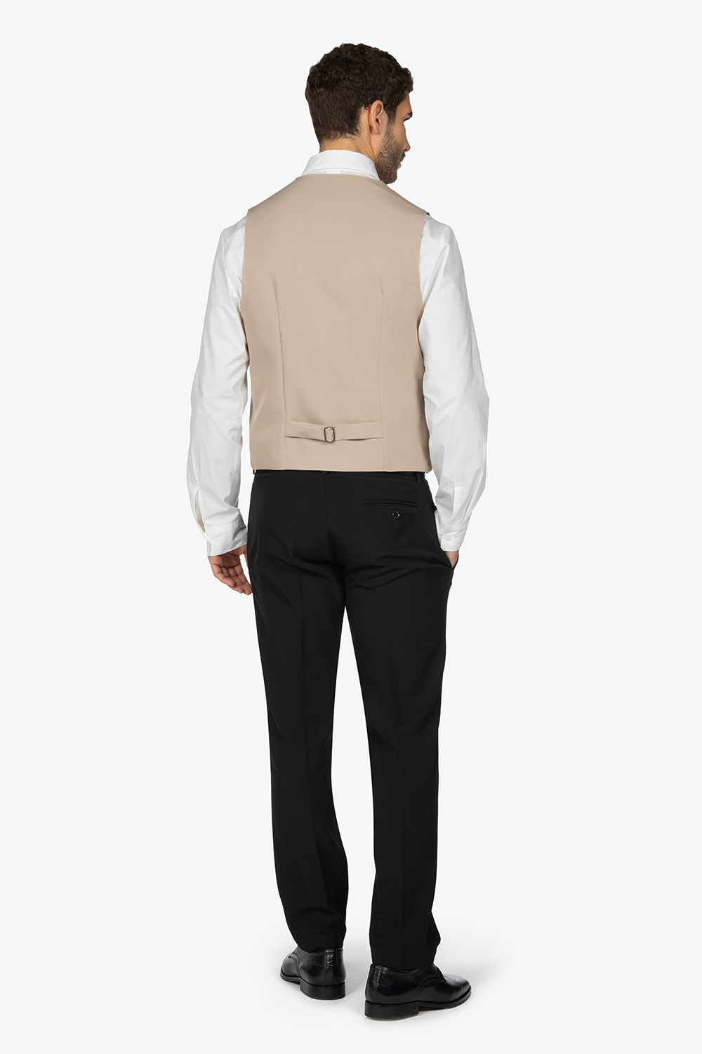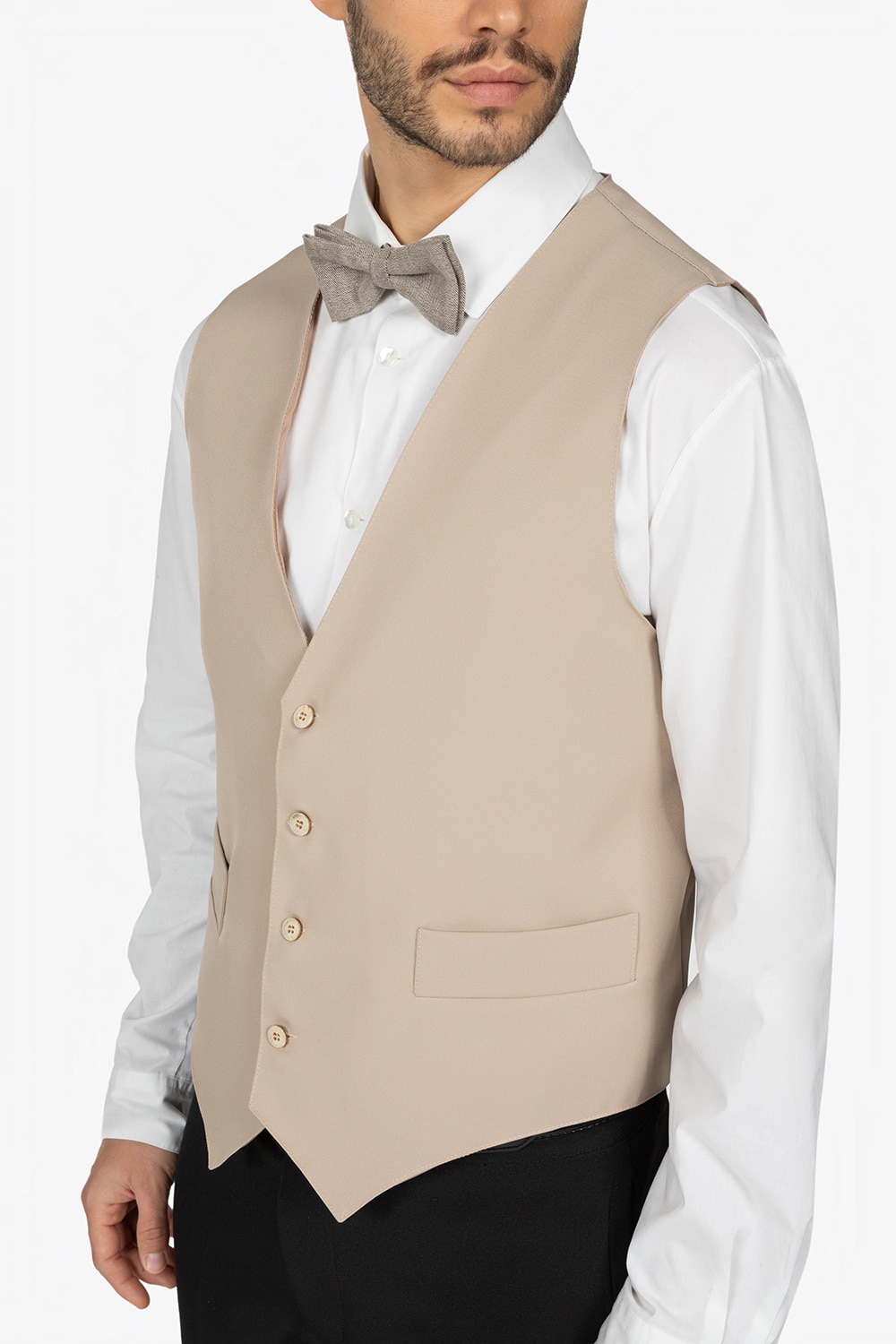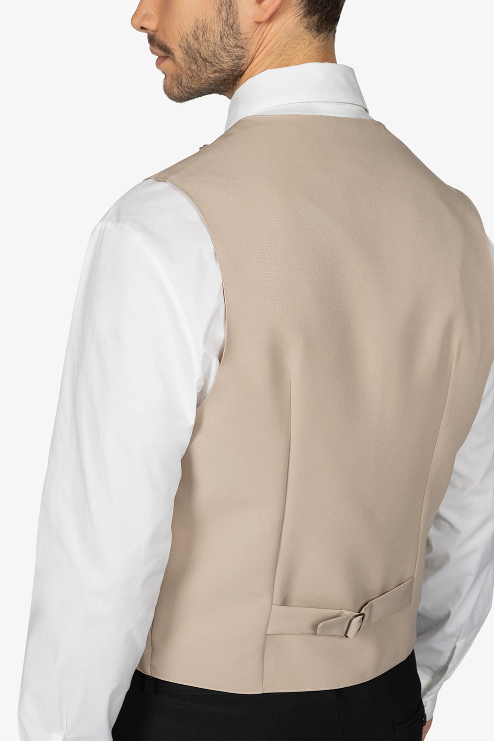 Gilet beige, foderato. Scollo a V. Fibbia posteriore. Tasche a pattina. Quattro bottoni. Vestibilità regular.