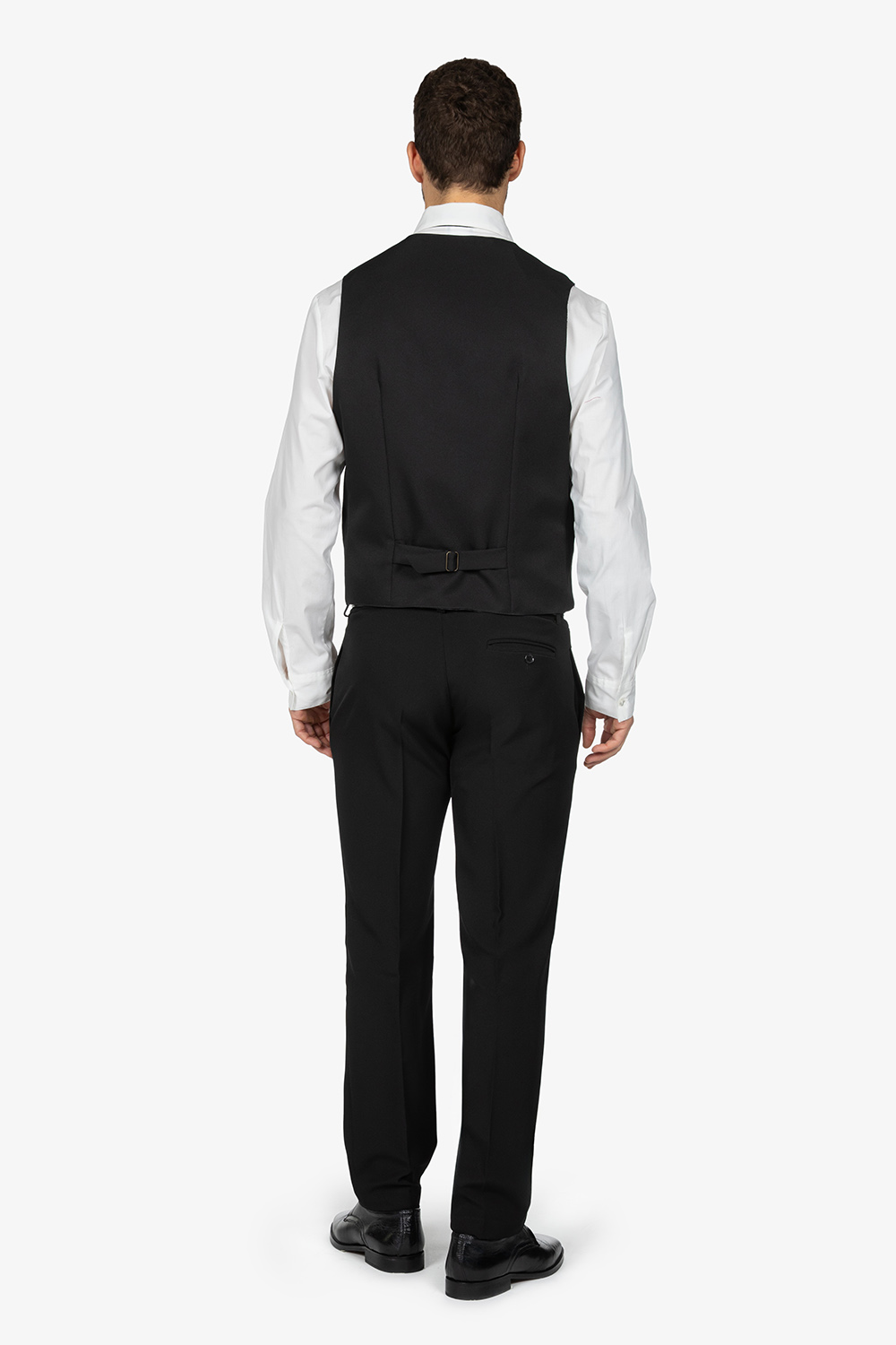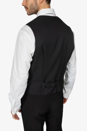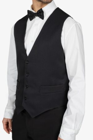 Gilet nero, foderato. Scollo a V. Fibbia posteriore. Tasche a pattina. Quattro bottoni. Vestibilità regular.