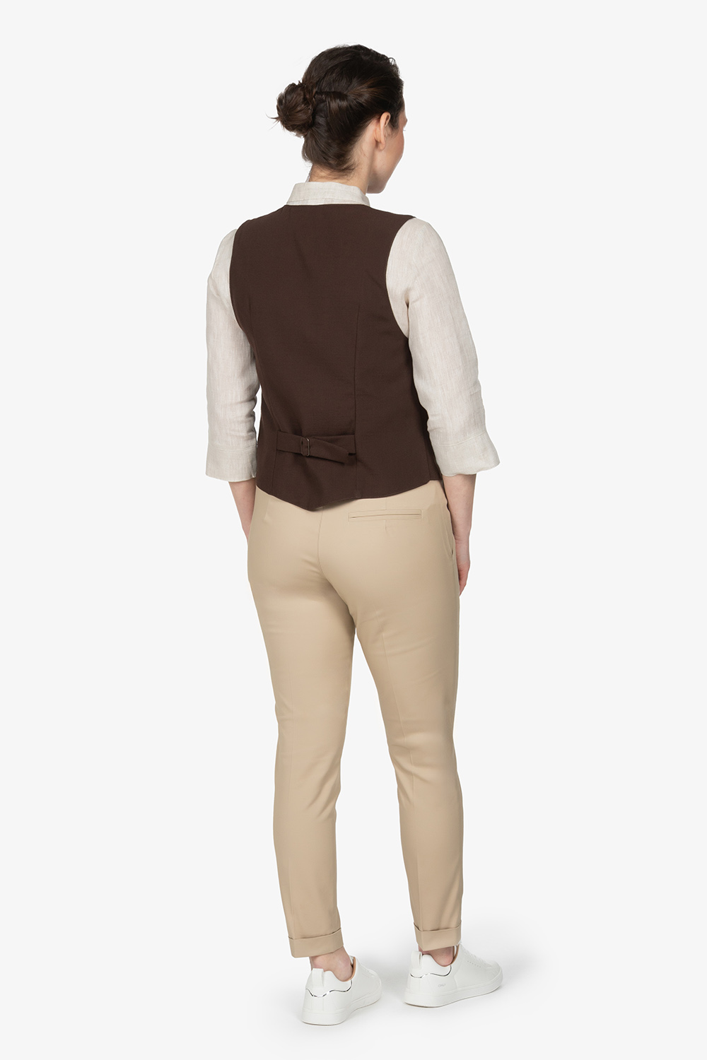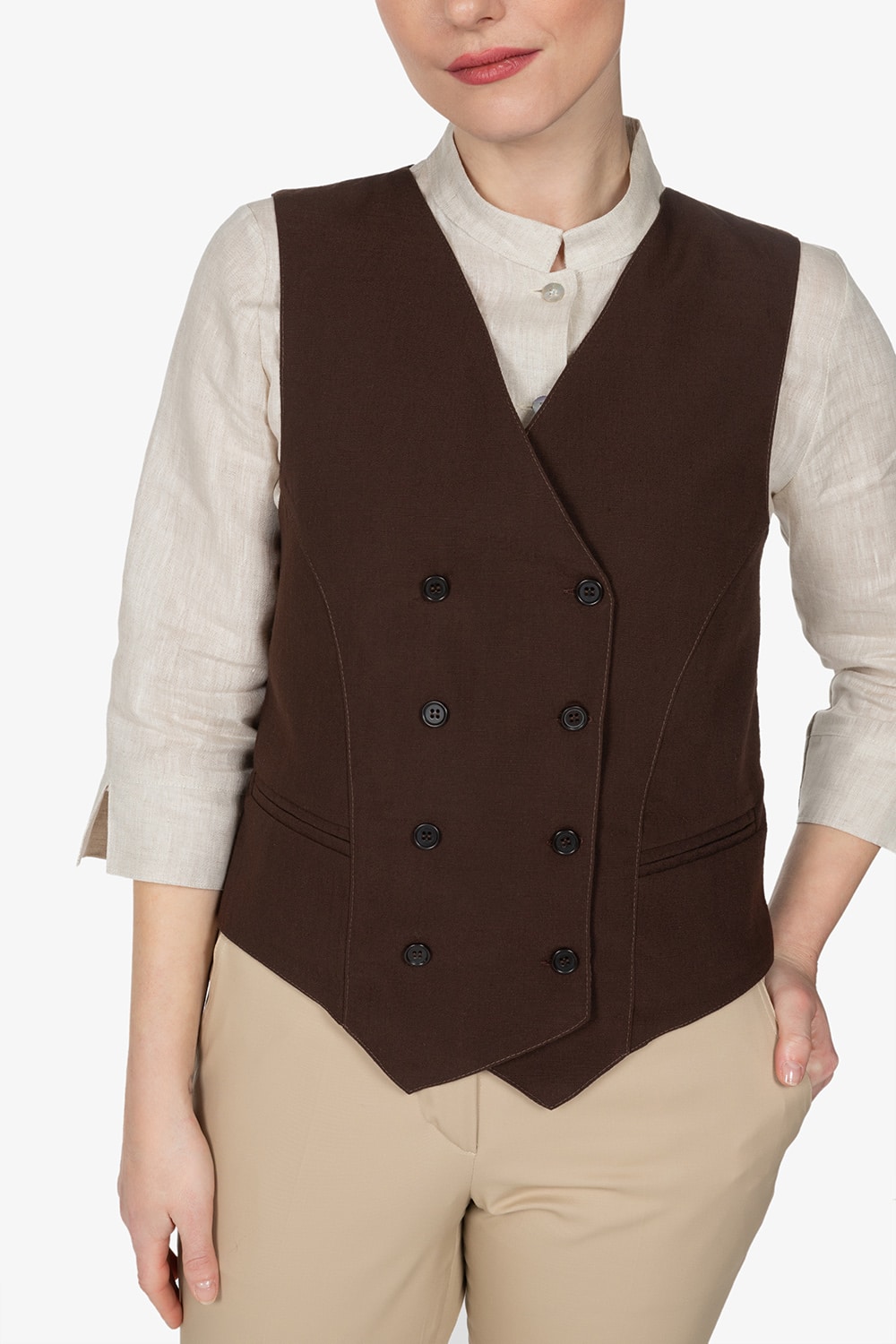 Gilet marrone, foderato con doppio petto. Scollo a V. Fibbia regolabile posteriore. Tasche a filetto. Vestibilità regular.